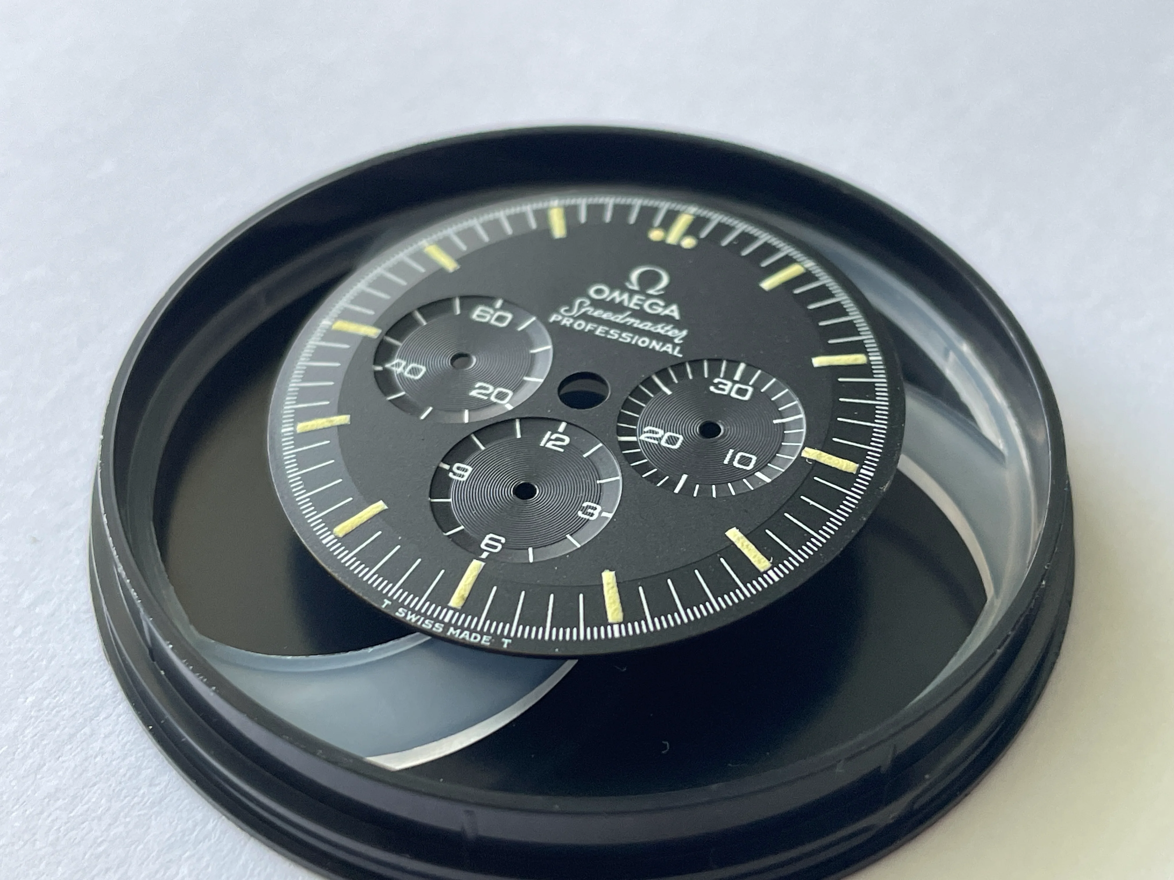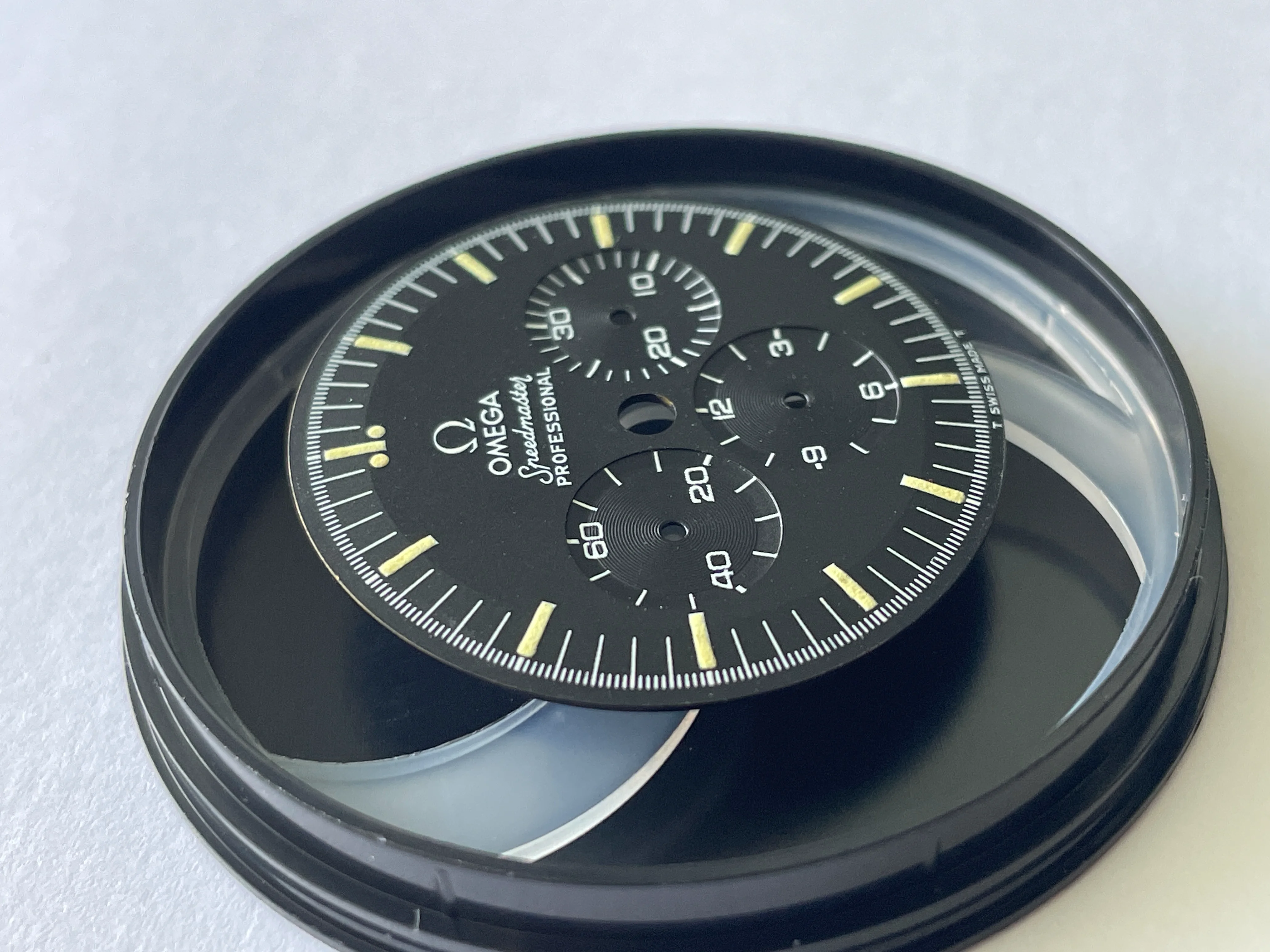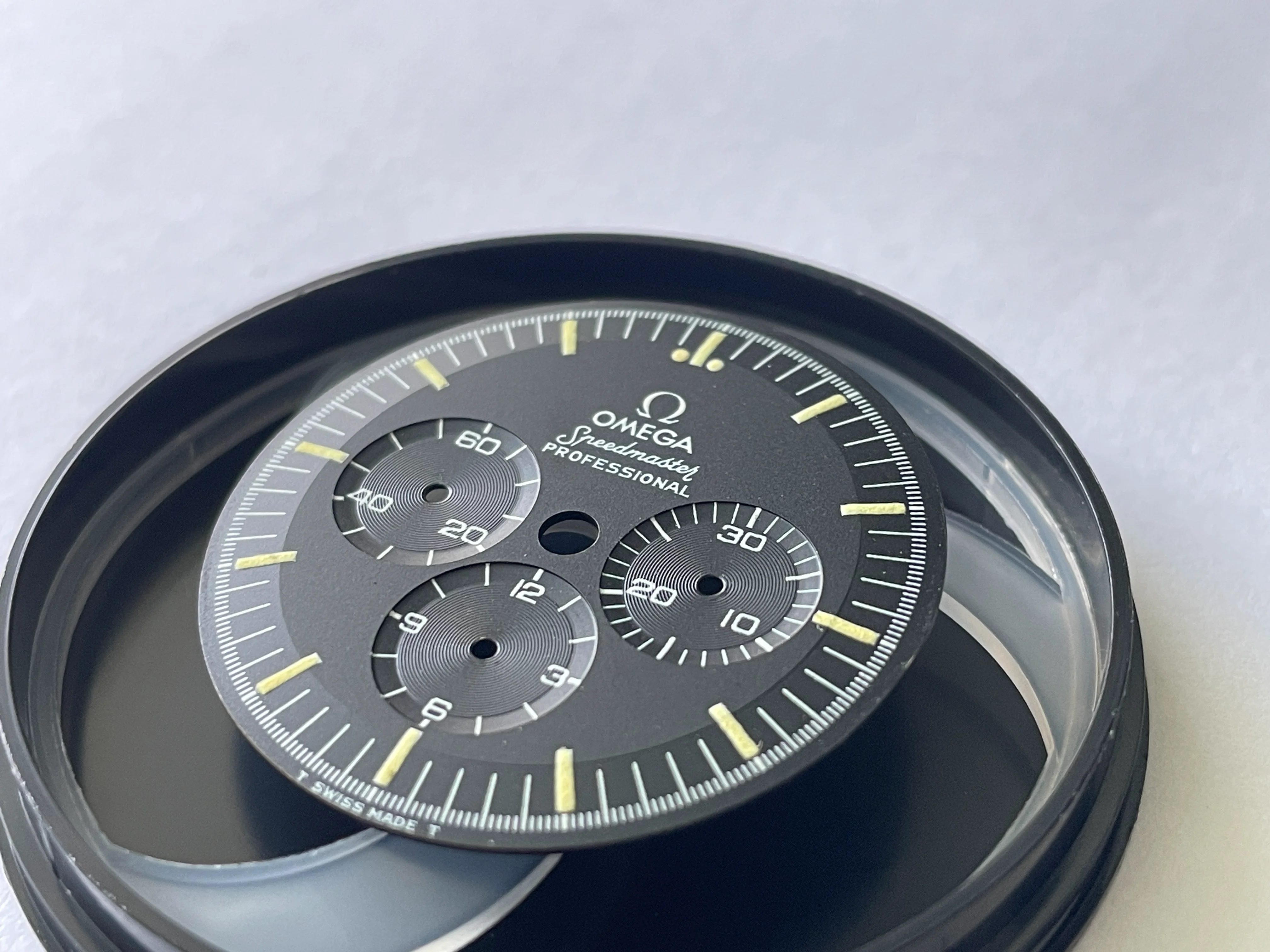 Dial appears to be in very nice to excellent condition with puffy lume and no obvious flaws, but I'll leave the judgement to you all OF. It may just be me but it looks like when the shape of the dial was stamped, the stamped it heavy because it almost looks as if it's stepped. There is one slightly glossy small area near the S of Speedmaster but it's almost impossible to photograph as well as see with the naked eye. If interested to see, send me a DM and I'll do my best. TM Watch Co dial container is included in the sale and dial will be shipped in it as well.