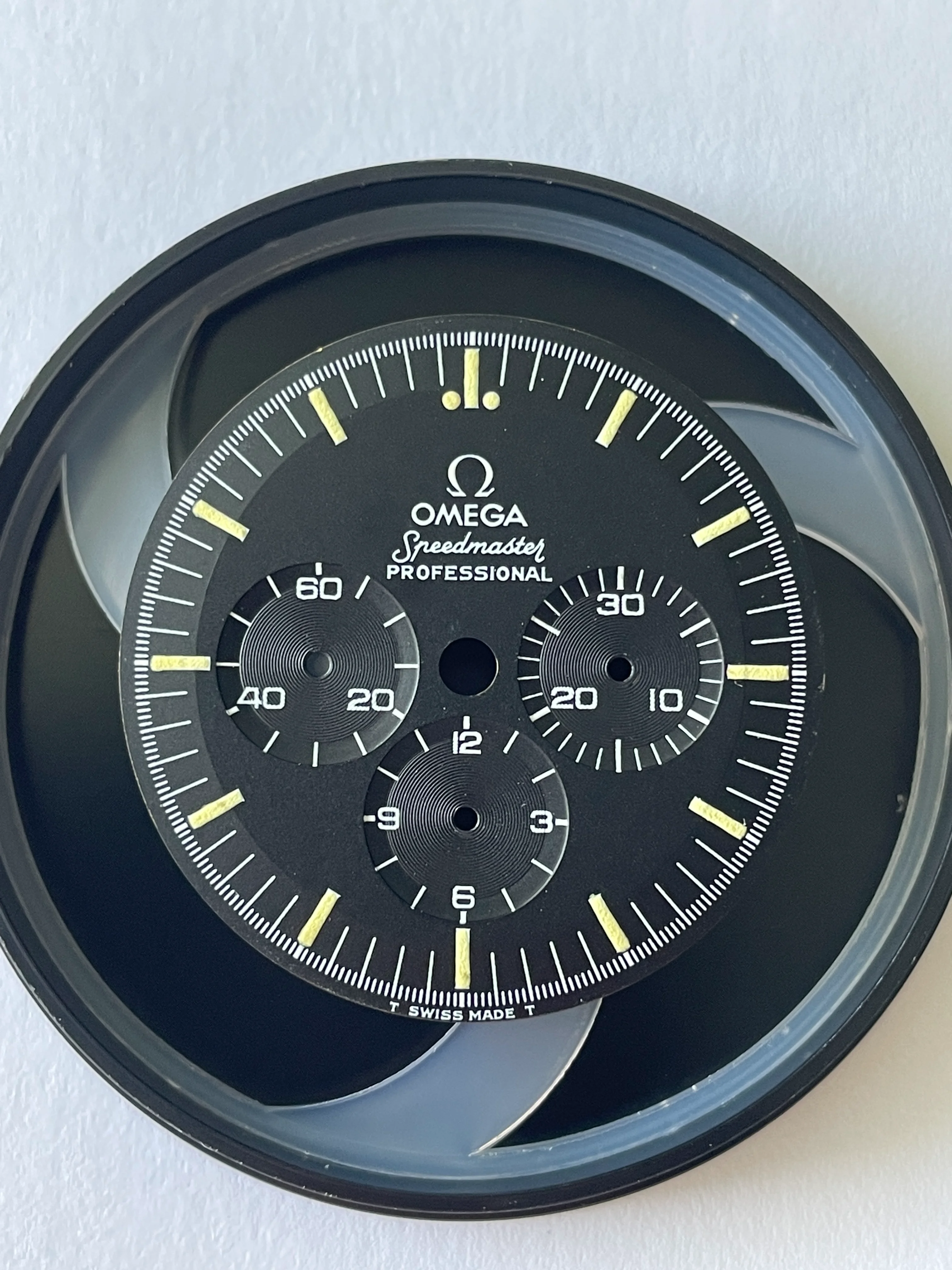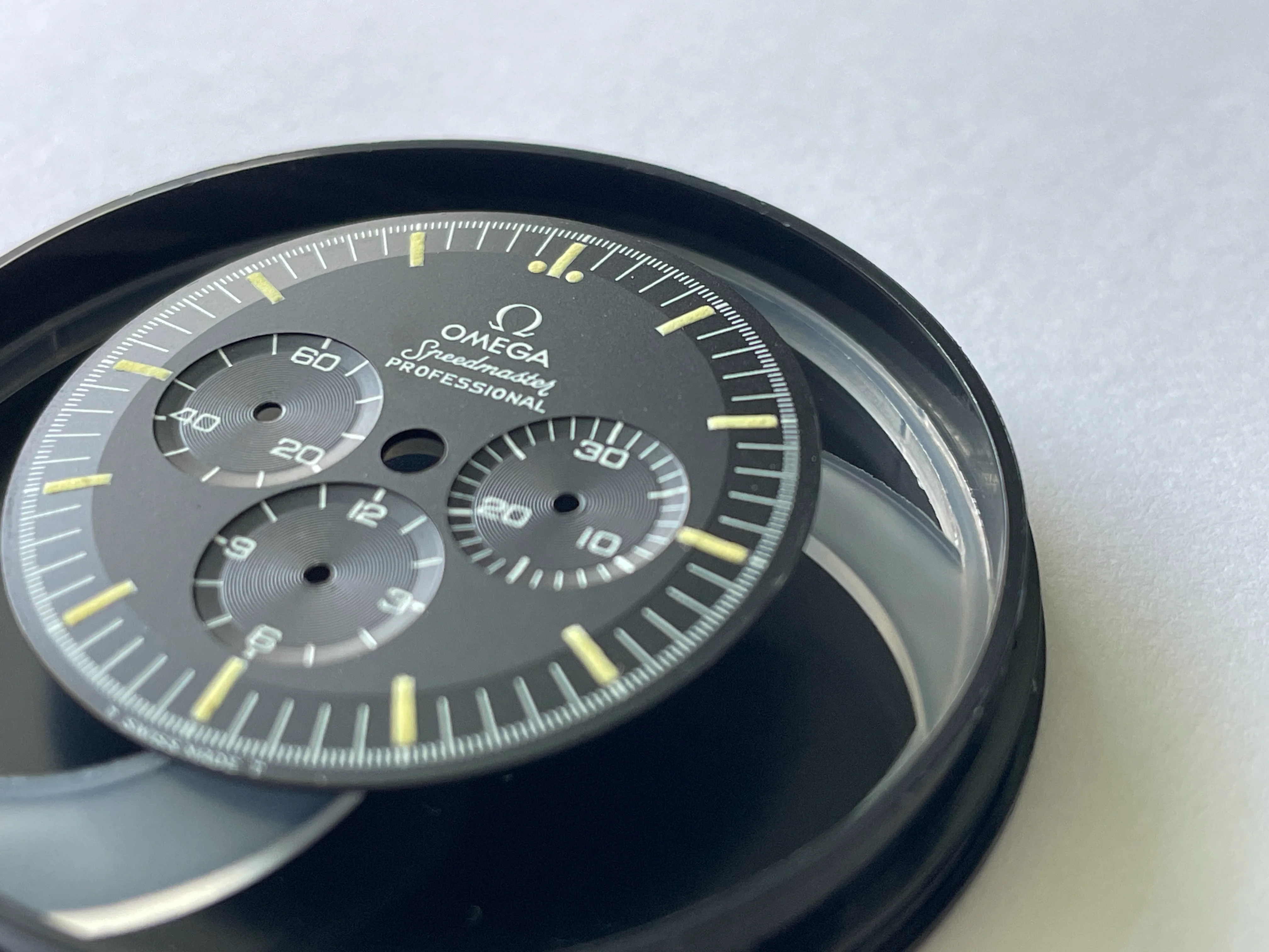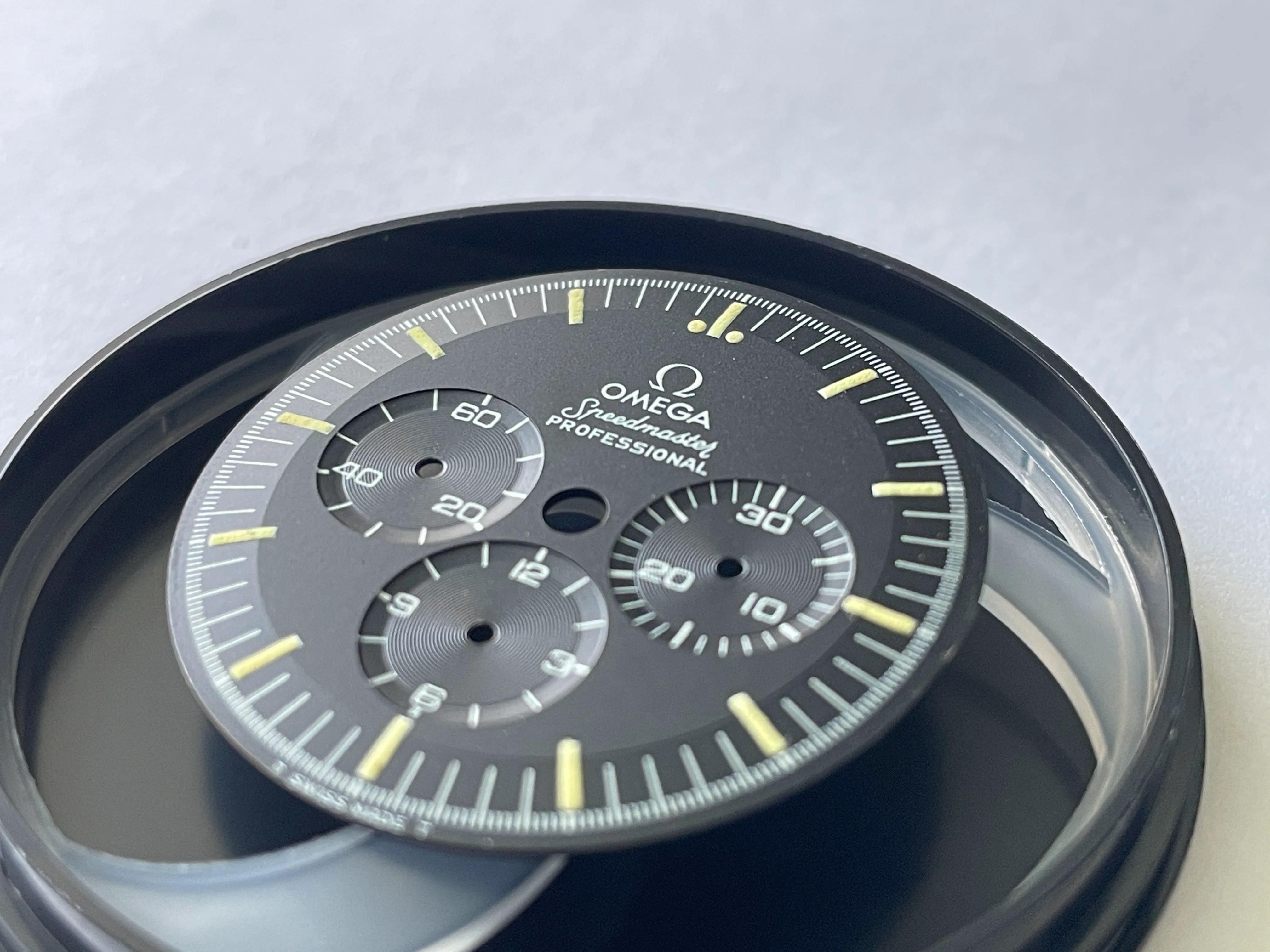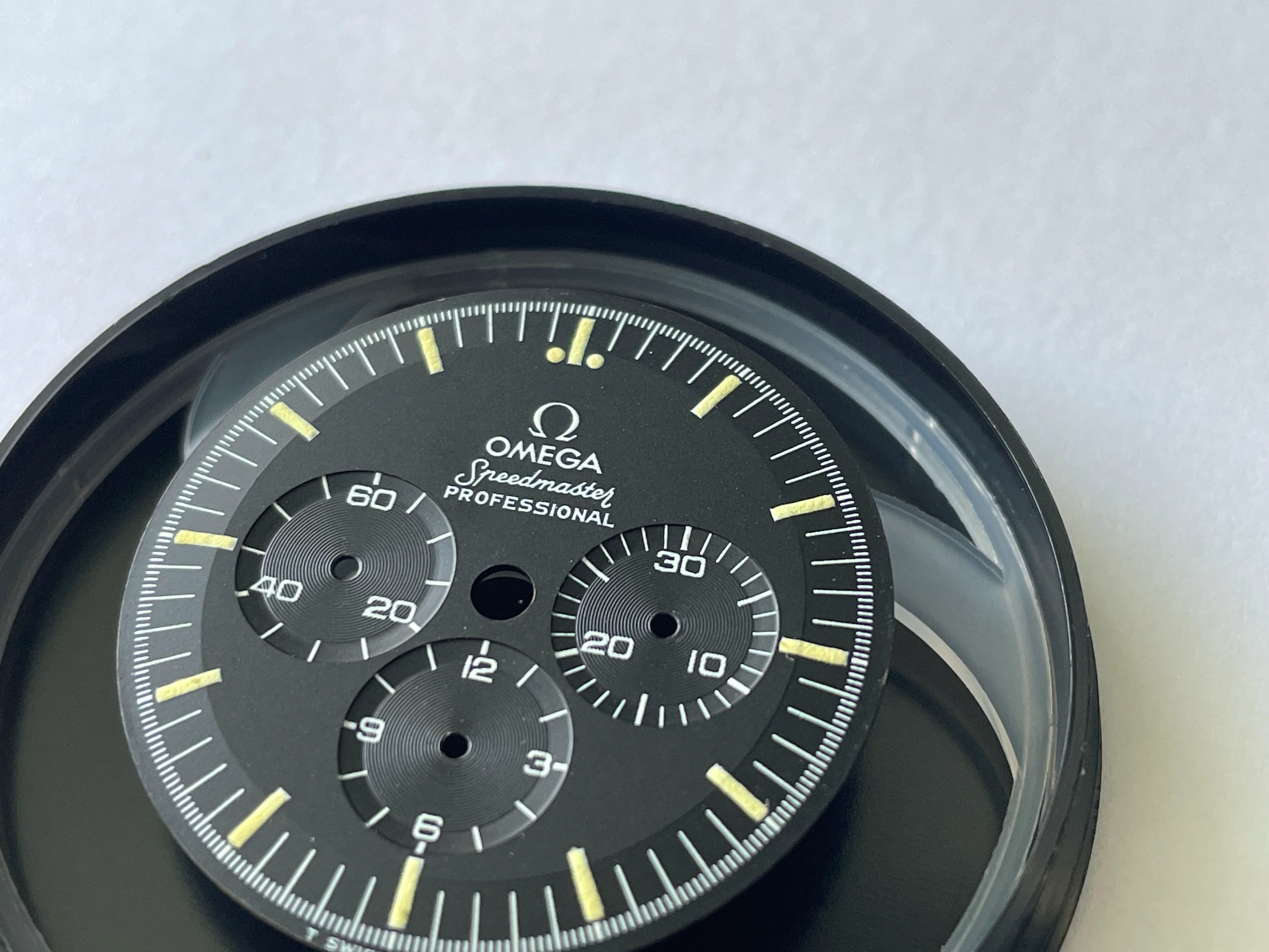 Dial appears to be in very nice to excellent condition with puffy lume and no obvious flaws, but I'll leave the judgement to you all OF. It may just be me but it looks like when the shape of the dial was stamped, the stamped it heavy because it almost looks as if it's stepped. There is one slightly glossy small area near the S of Speedmaster but it's almost impossible to photograph as well as see with the naked eye. If interested to see, send me a DM and I'll do my best. TM Watch Co dial container is included in the sale and dial will be shipped in it as well.