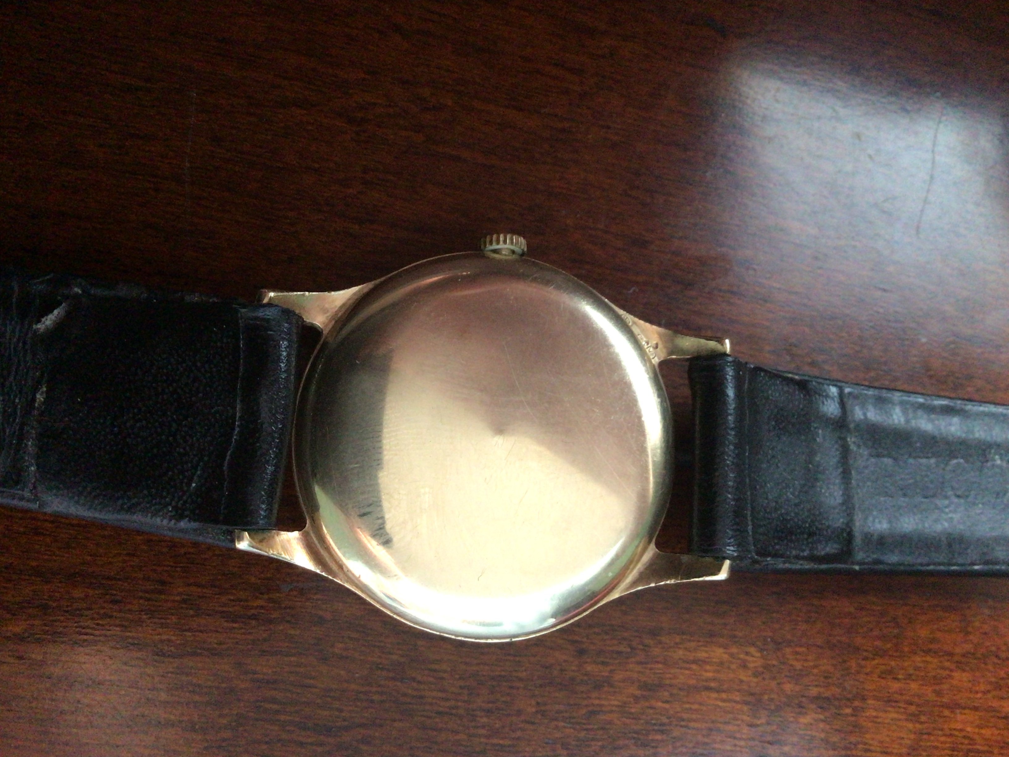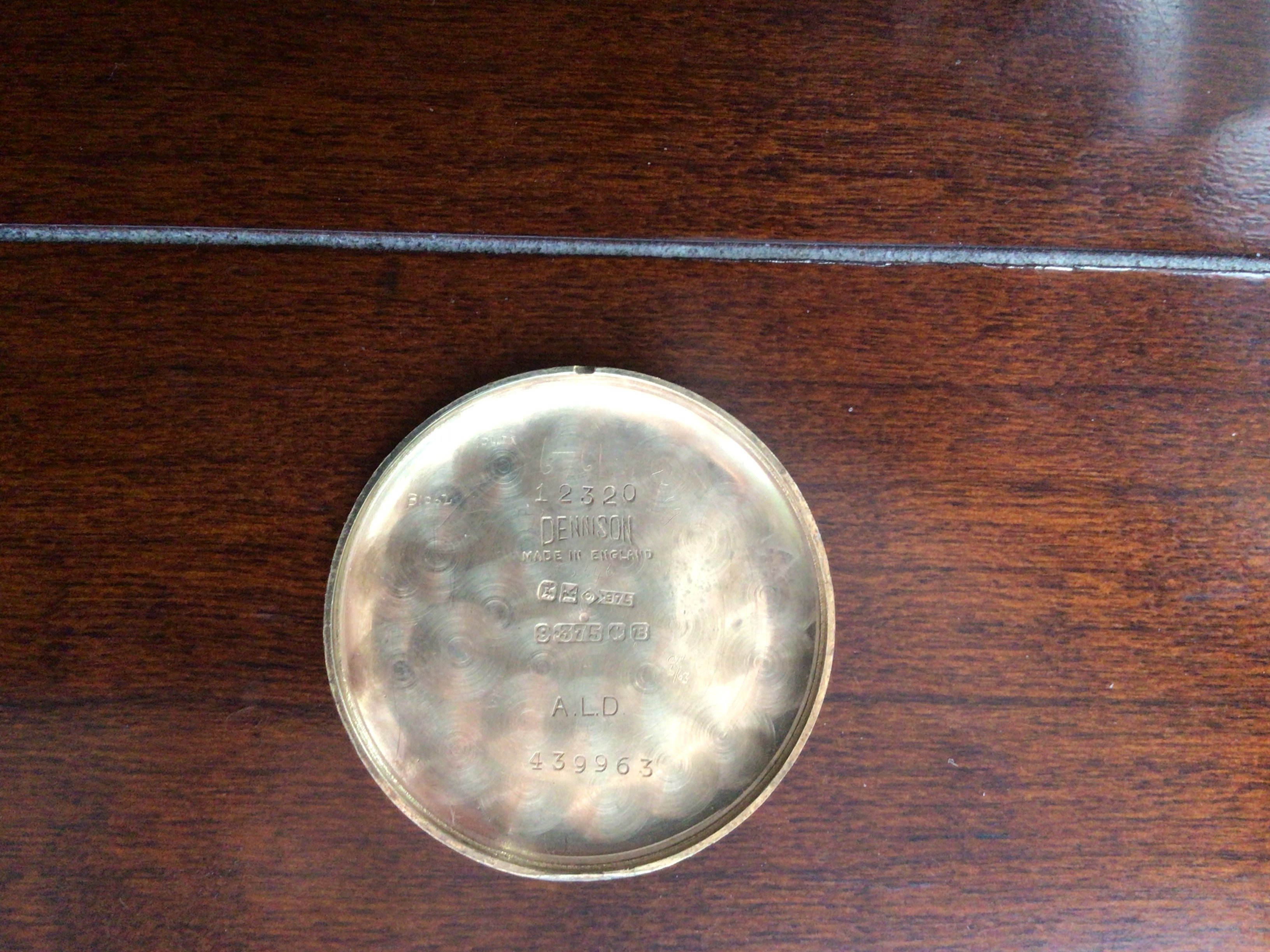 Case - 9ct gold Dennison. Hallmark stamp dates it to 1951/52. Size, appears by my imprecise measurement (a ruler), to be 33mm including crown. Case number from the case back is 439965. Last three digits (965) are also stamped into the 9ct main case frame. Tool marks are obvious on the case opposite the crown once the back is removed. Currently the case back can be removed with care using just a fingernail, and snaps shut again with ease. I have only lightly polished the case with a microfibre cloth to remove obvious signs of tarnish.