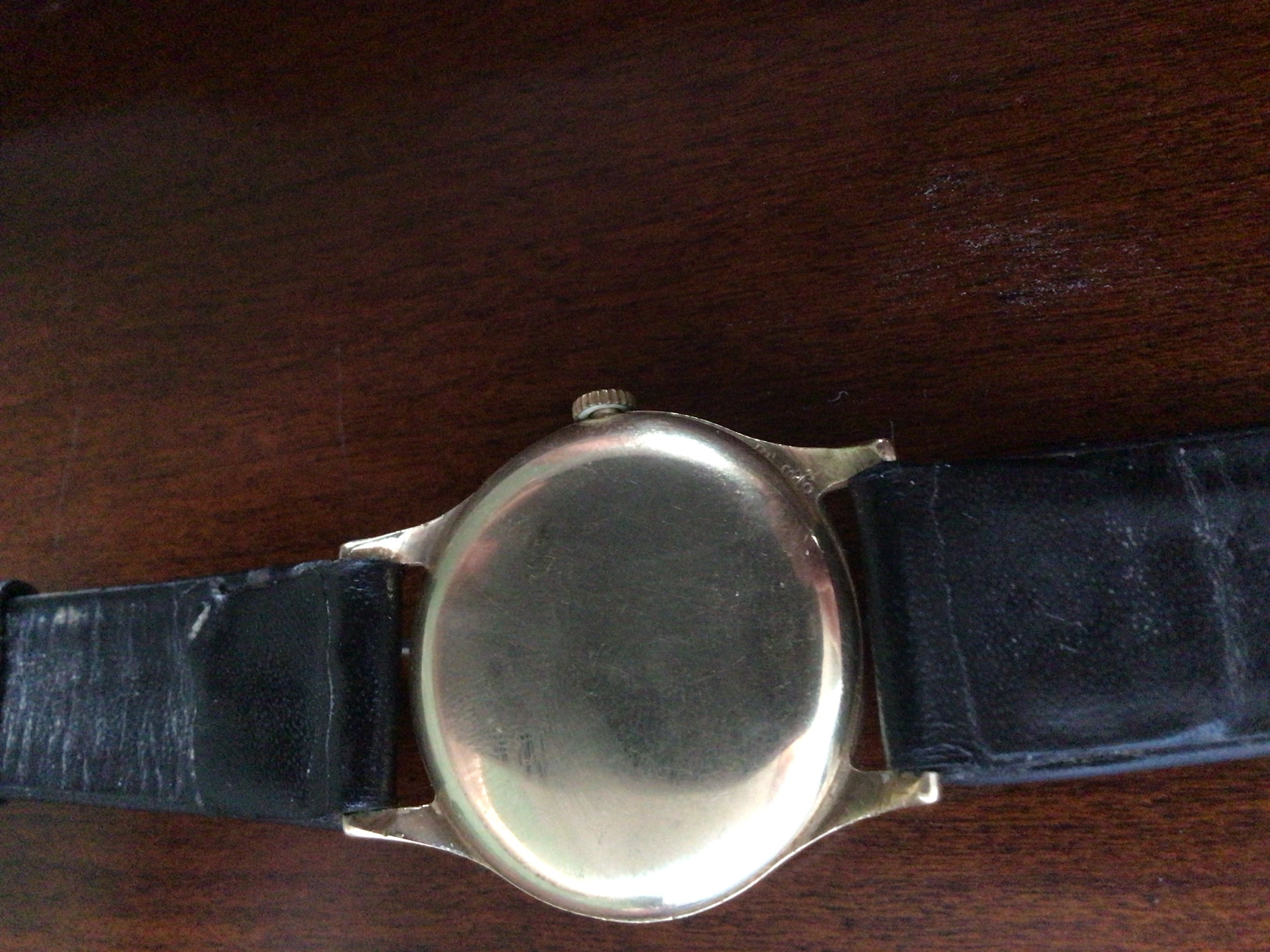 Dial - appears to be off white with gilt arrow head indices, and Dauphine hands. Numerals appear to be painted flush with the dial surface in gold outlined in black. They do not appear to be actual manufactured numbers stuck to the dial giving a raised appearance as I have seen in some other sub second dials of this vintage. The dial appears to be in generally good condition to the naked eye but there are age spots (patina?) at various positions on the outer edges of the dial when viewed with an optical device capable of magnification. These are most visible as ‘smudges’ between the 10 and 11 and 7 and 8 positions.