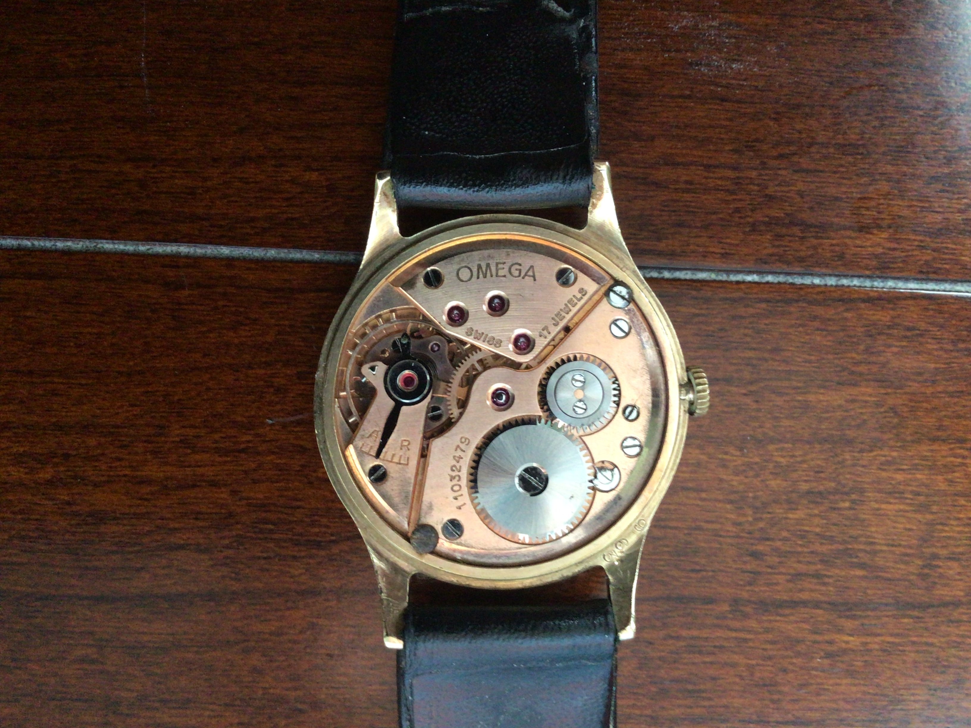 Movement - stamped ‘Omega’, ‘Swiss’ and ’17 JEWELS’. The serial number is 11032479 that probably dates the movement to late 1947 or early 1948, depending on what website you visit. One of the case screws appears to be badly corroded in comparison with its opposite number. Otherwise the movement looks clean. The movement currently does not work. The crown is stamped with the Omega symbol. The crown will rotate anti-clockwise emitting a clicking noise (to my mind a normal winding noise), but will not rotate clockwise, there is firm resistance when you test it lightly and I do not want to apply any further pressure in a clockwise direction. The crown and stem will extend to allow the hands to be adjusted manually. There is no stamp concerning the Calibre on the Barrel Bridge as I have seen in other similarly aged Omegas, though according to some internet sources this process apparently only started in the late 1940s. Some sources I have read also suggest that the Calibre may be stamped underneath the Balance wheel and assembly.