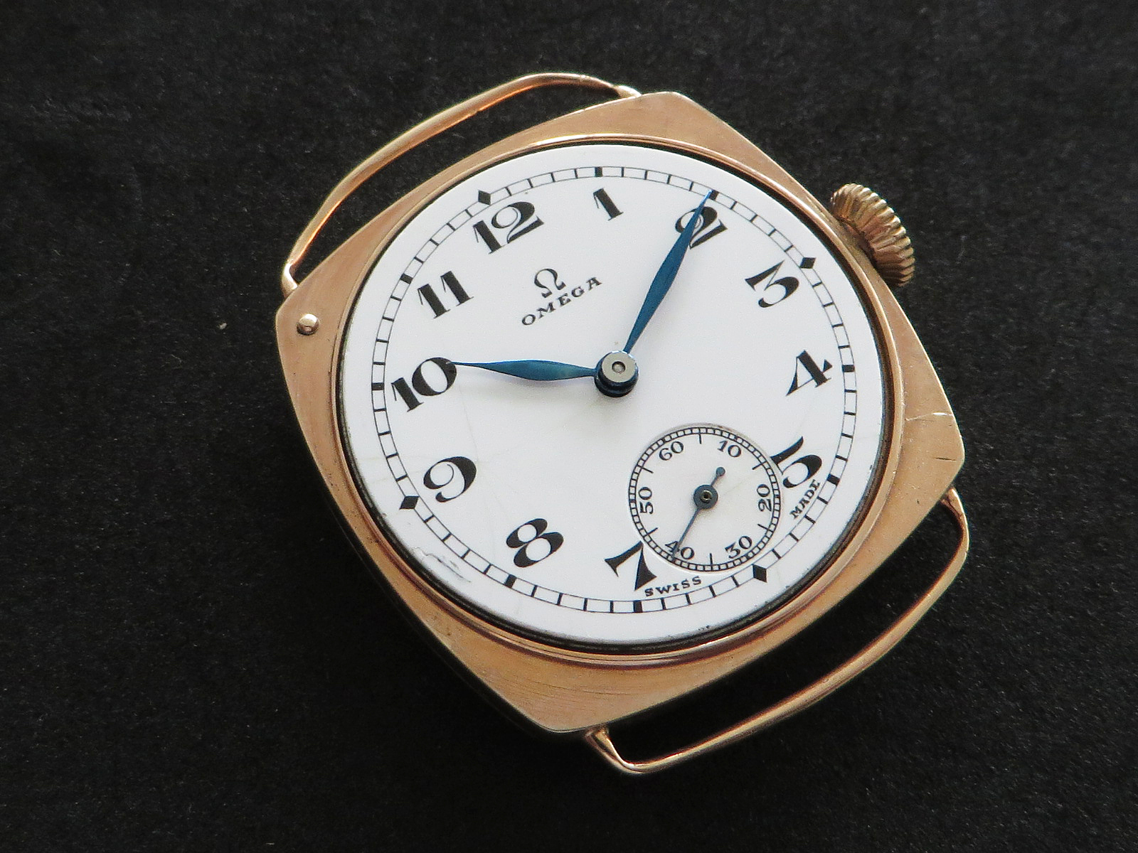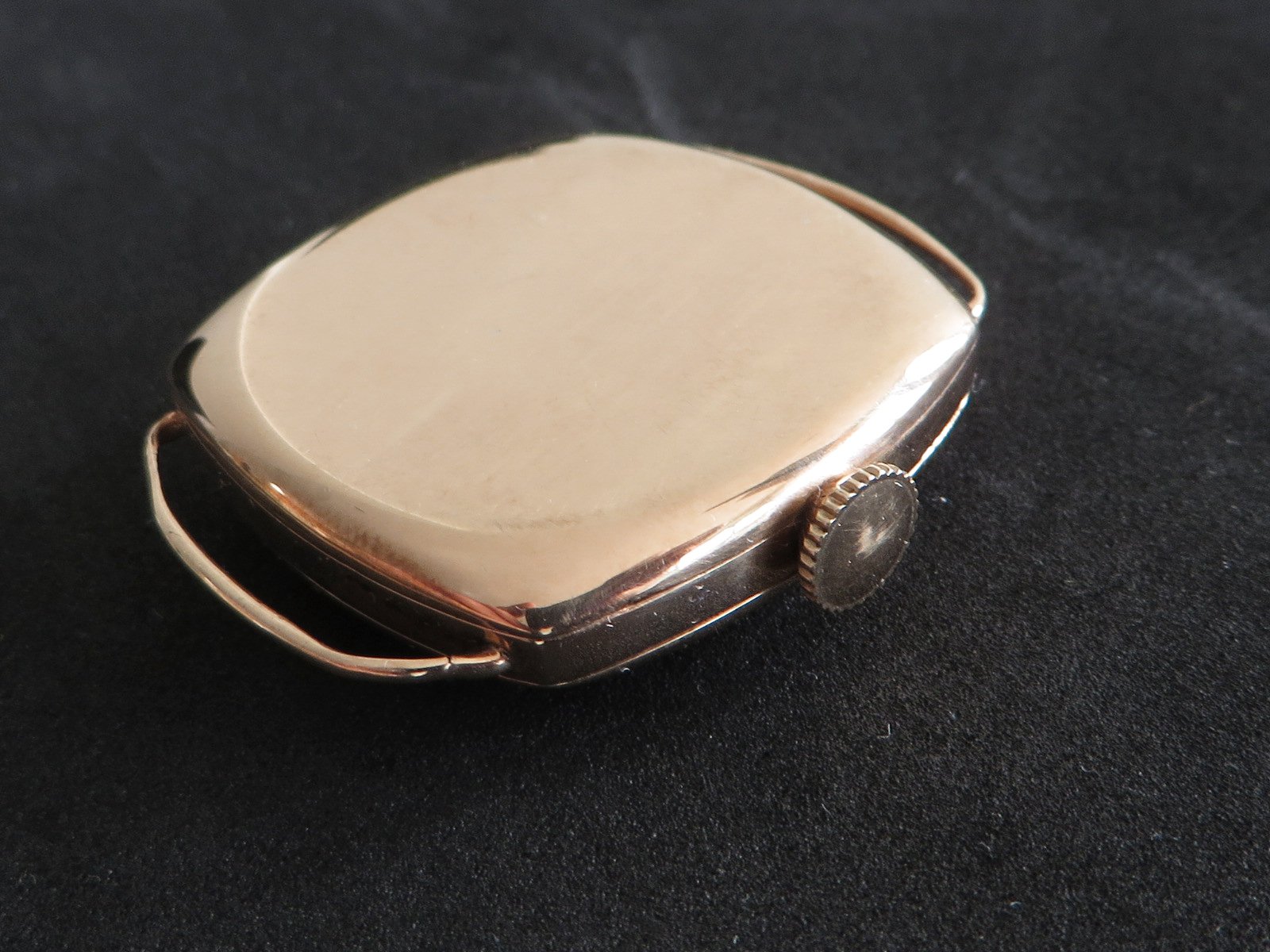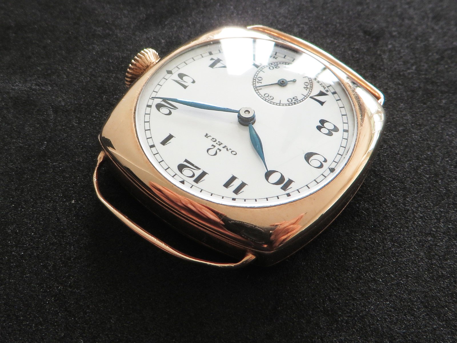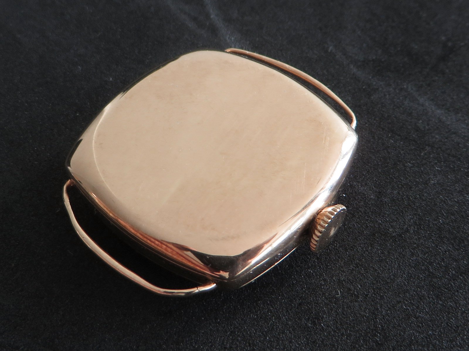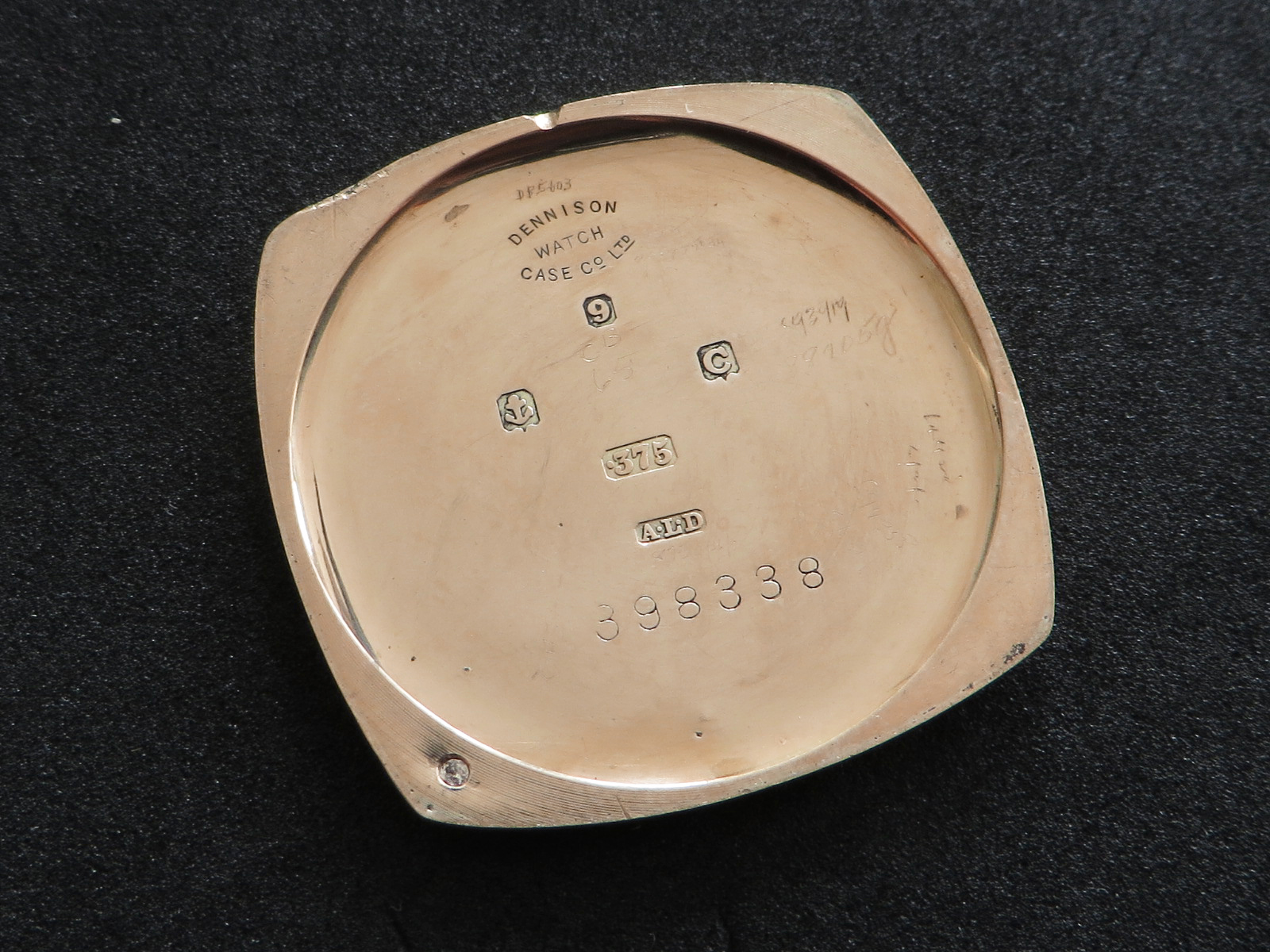 ··Vintage Omega AficionadoDennison 9K solid rose gold cushion case, hallmarked (Birmingham "anchor" - 1927 "C"), bezel, case and back all marked 9 .375. Bezel and back both snap on securely, crystal is scratch free. Please note there has been a repair inside the bezel and the wire lugs could use a little tweaking.