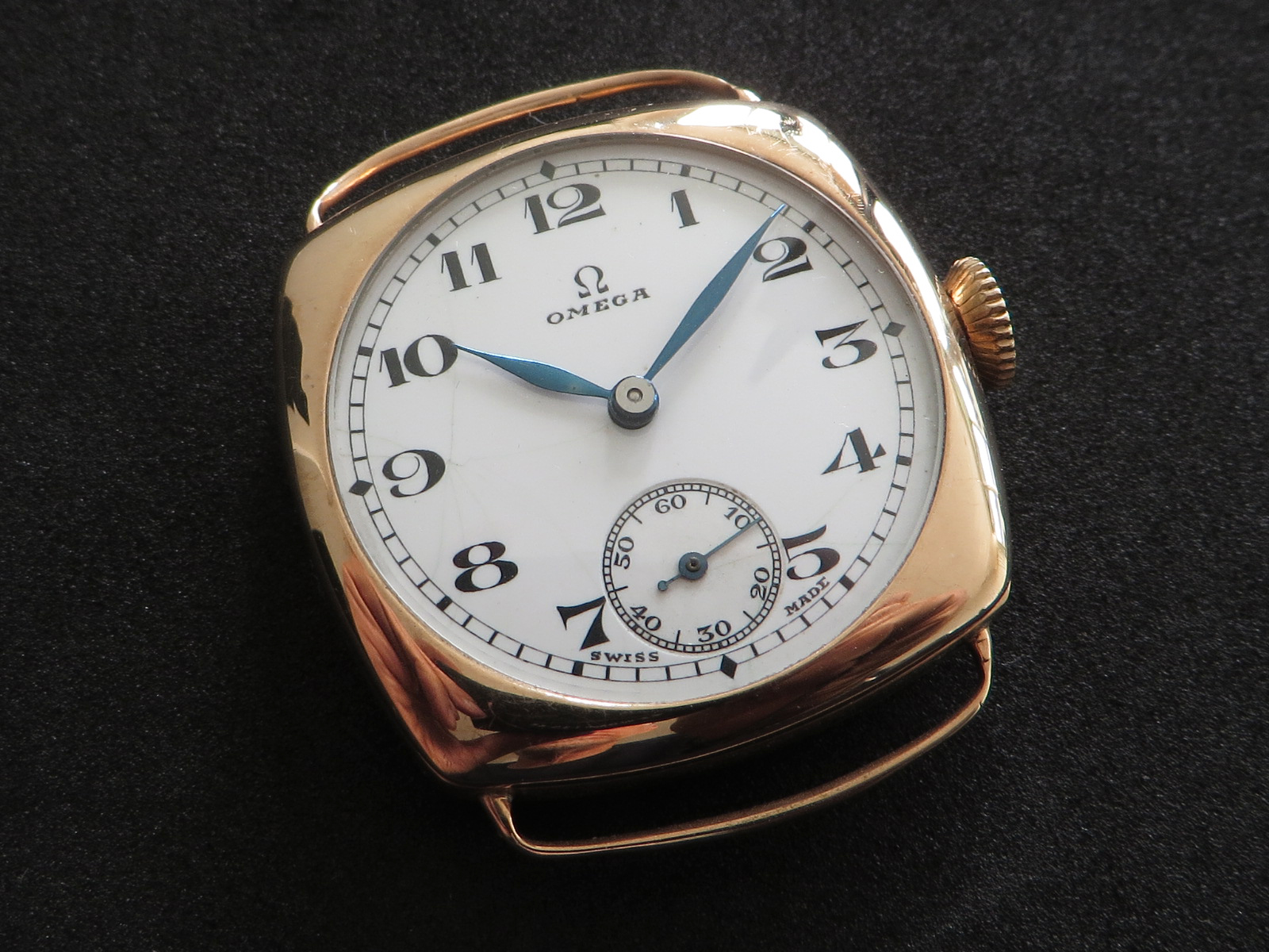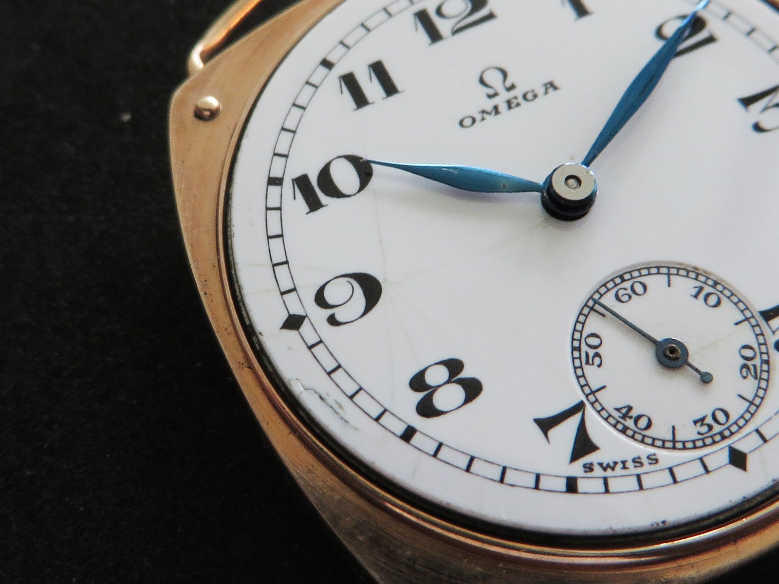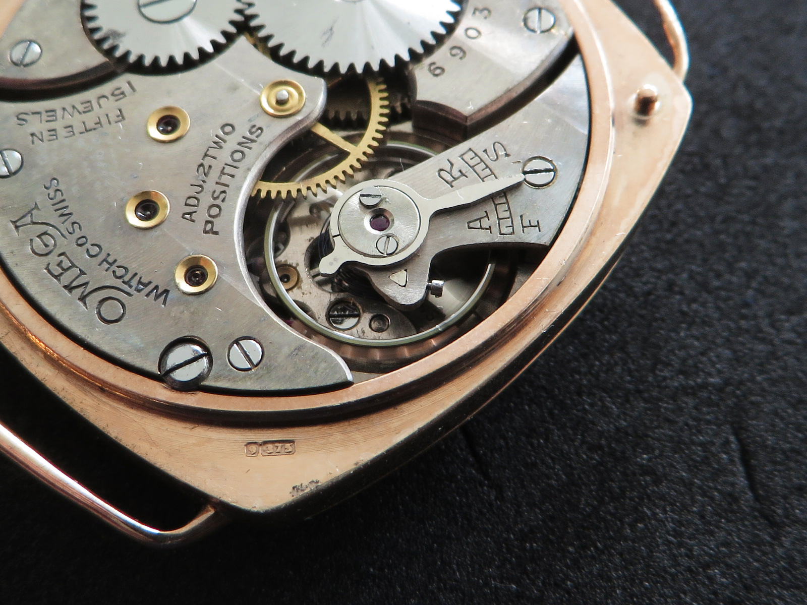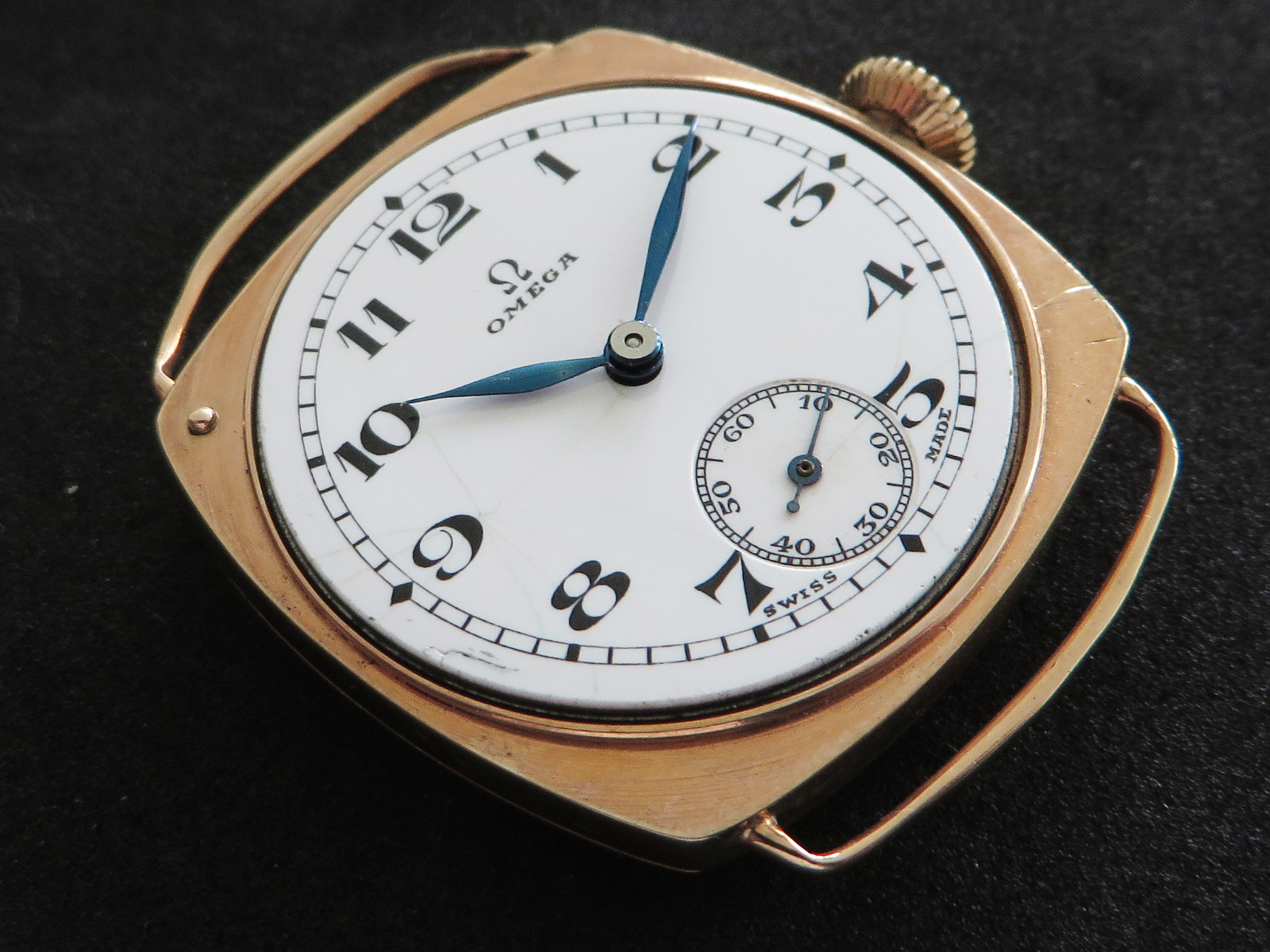 ··Vintage Omega AficionadoDennison 9K solid rose gold cushion case, hallmarked (Birmingham "anchor" - 1927 "C"), bezel, case and back all marked 9 .375. Bezel and back both snap on securely, crystal is scratch free. Please note there has been a repair inside the bezel and the wire lugs could use a little tweaking.