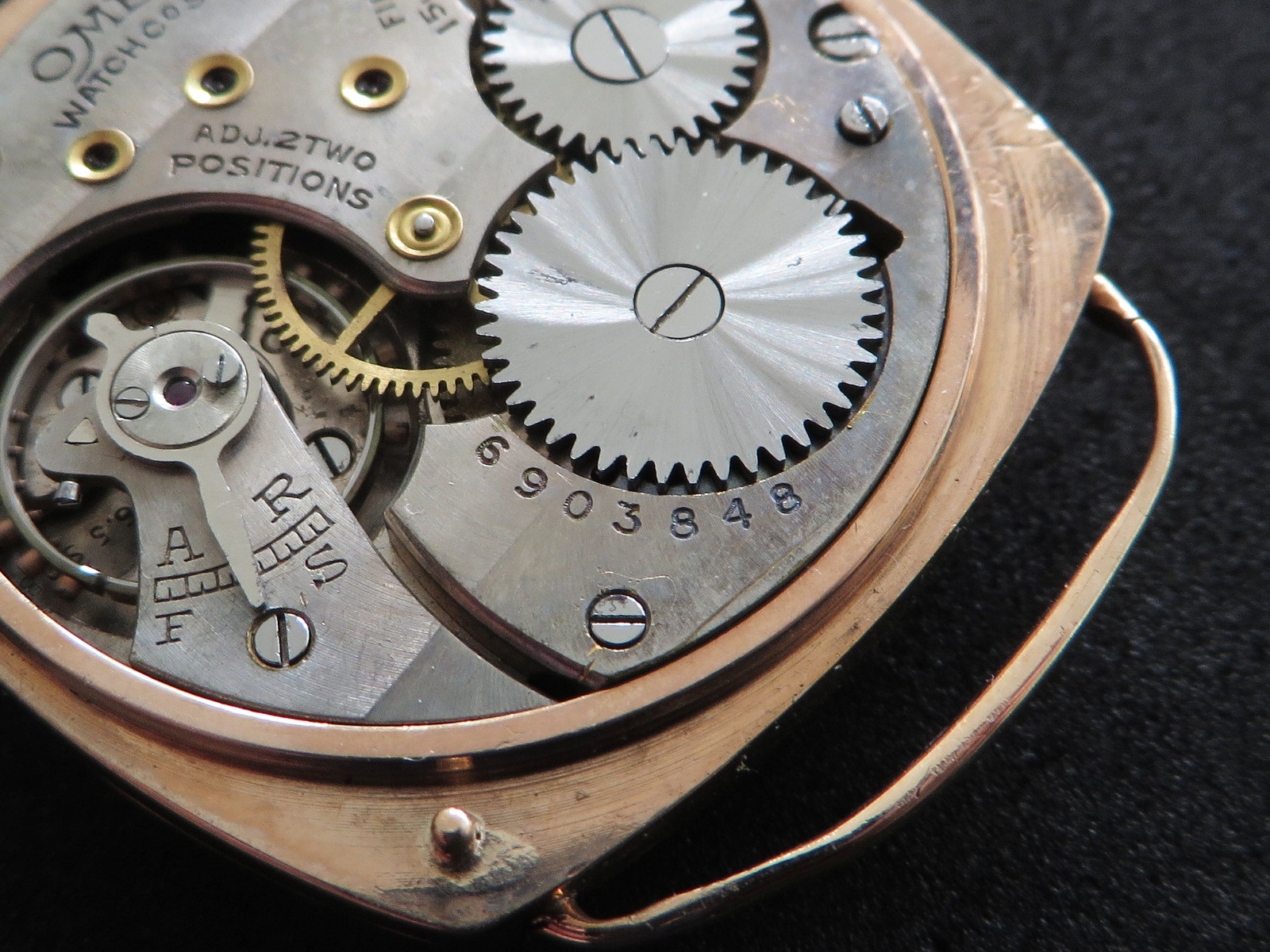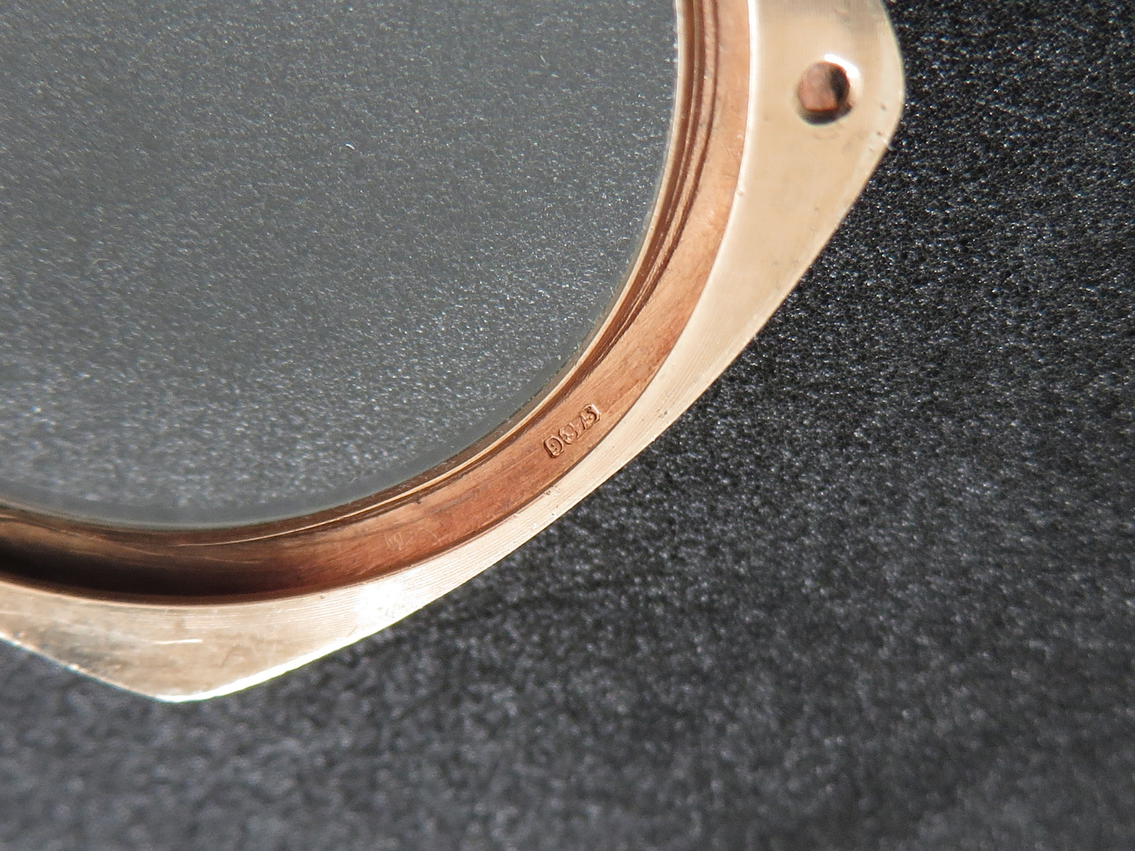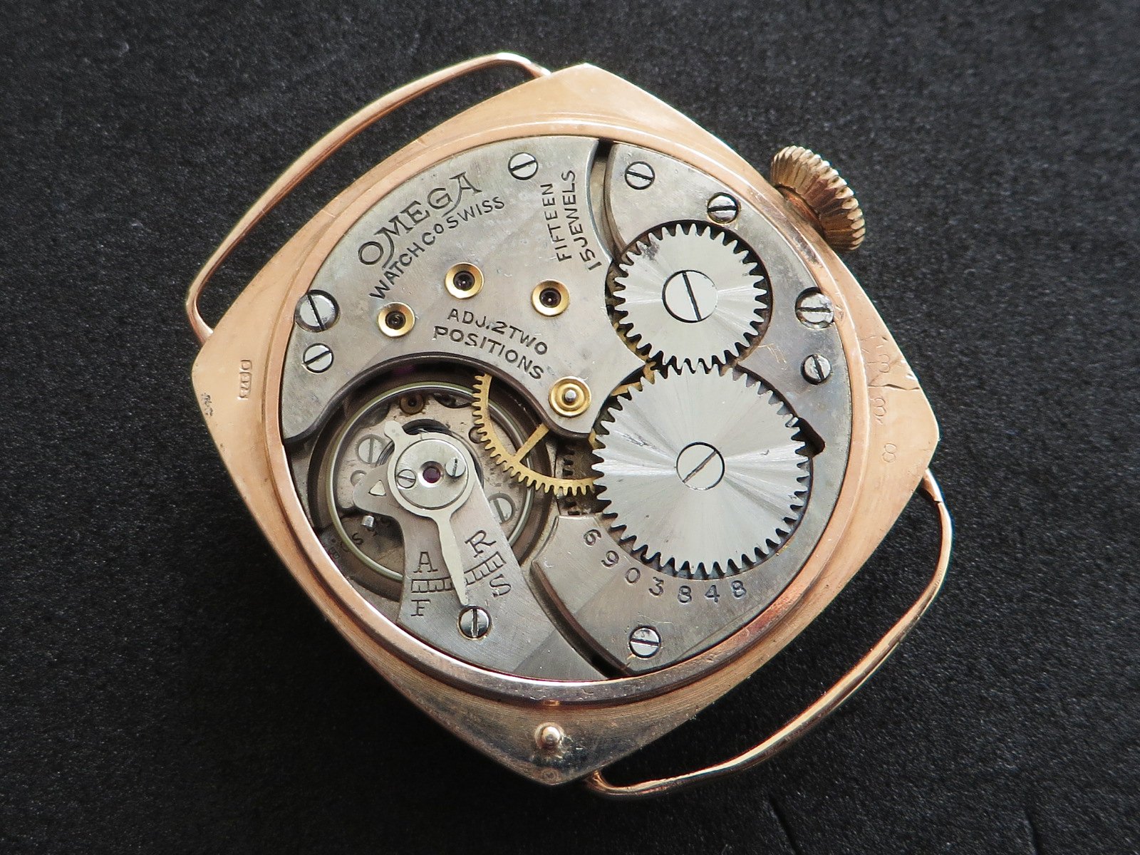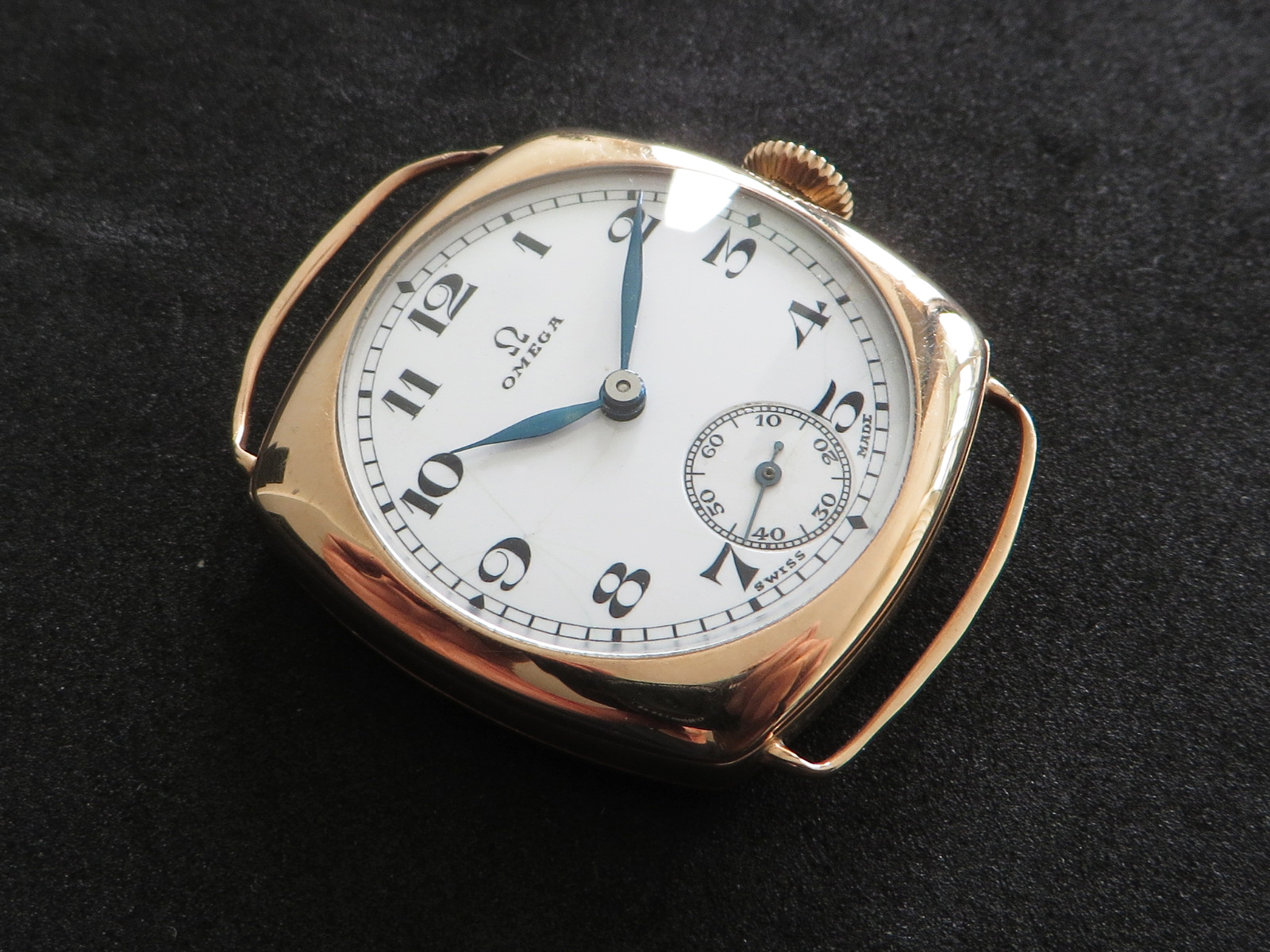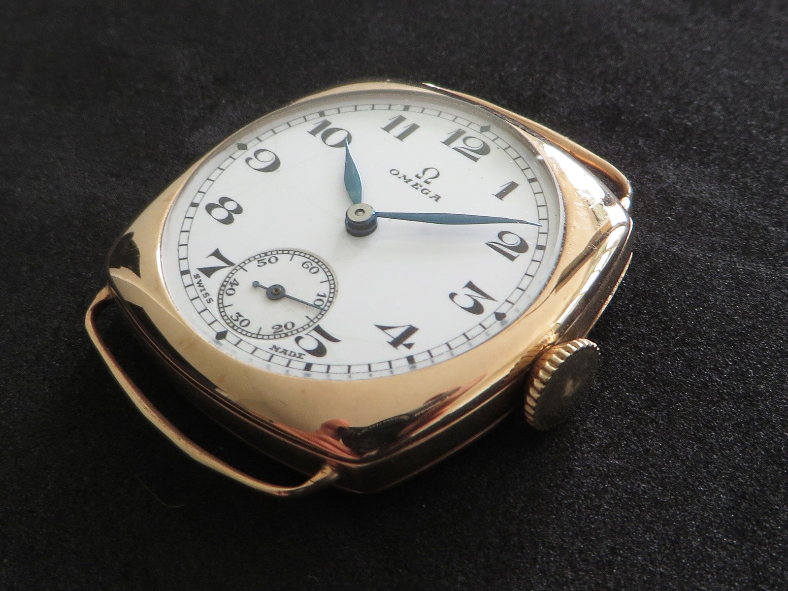 ··Vintage Omega AficionadoDennison 9K solid rose gold cushion case, hallmarked (Birmingham "anchor" - 1927 "C"), bezel, case and back all marked 9 .375. Bezel and back both snap on securely, crystal is scratch free. Please note there has been a repair inside the bezel and the wire lugs could use a little tweaking.