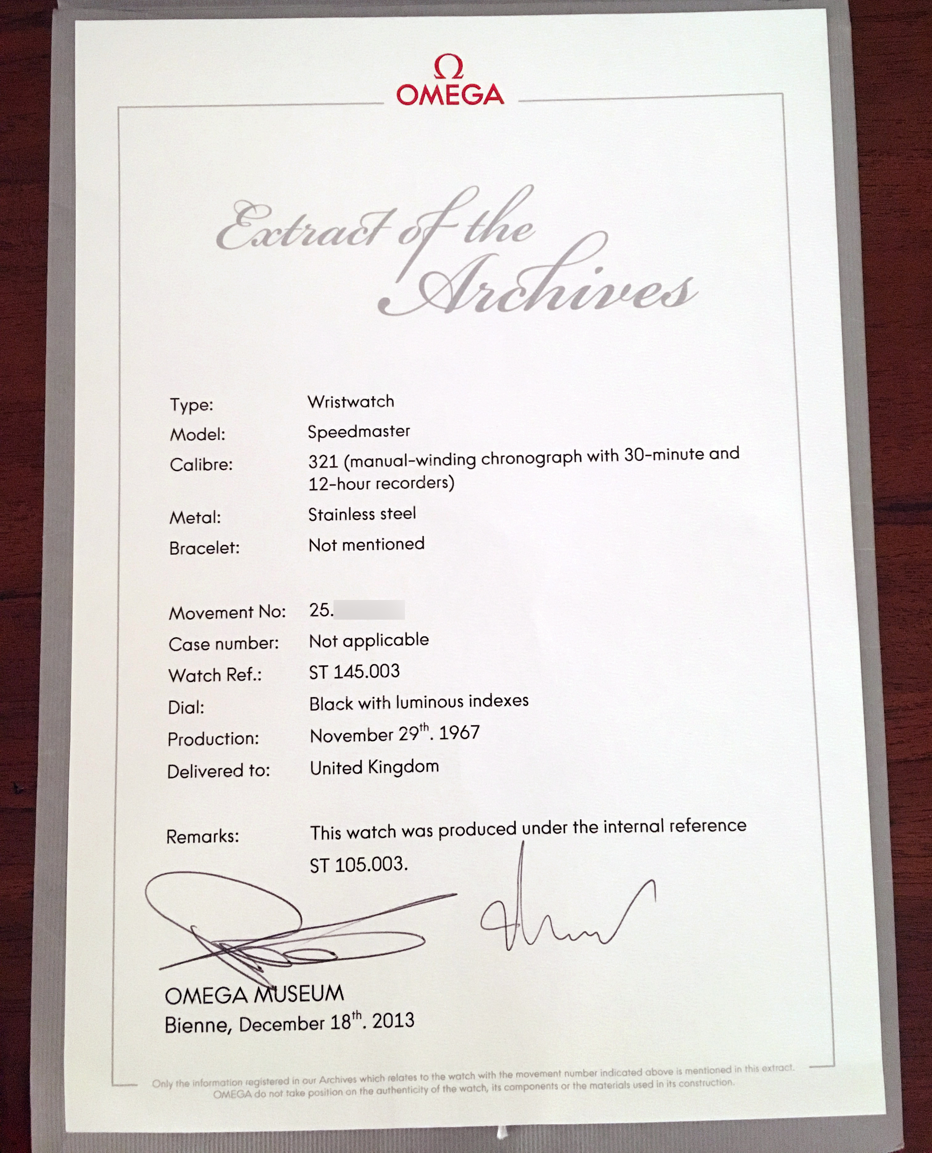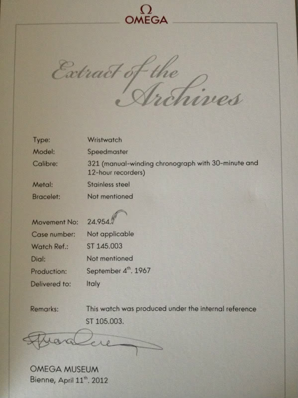 We may have told you the watch was identified with a 145.003 reference, but this reference was never produced and engraved inside the case back, it was a reference used at that time only by the logistics department. In fact, all the 145.003 was officially named 105.003. This is why we cannot provide you with an extract that mentions a 145.003 reference.