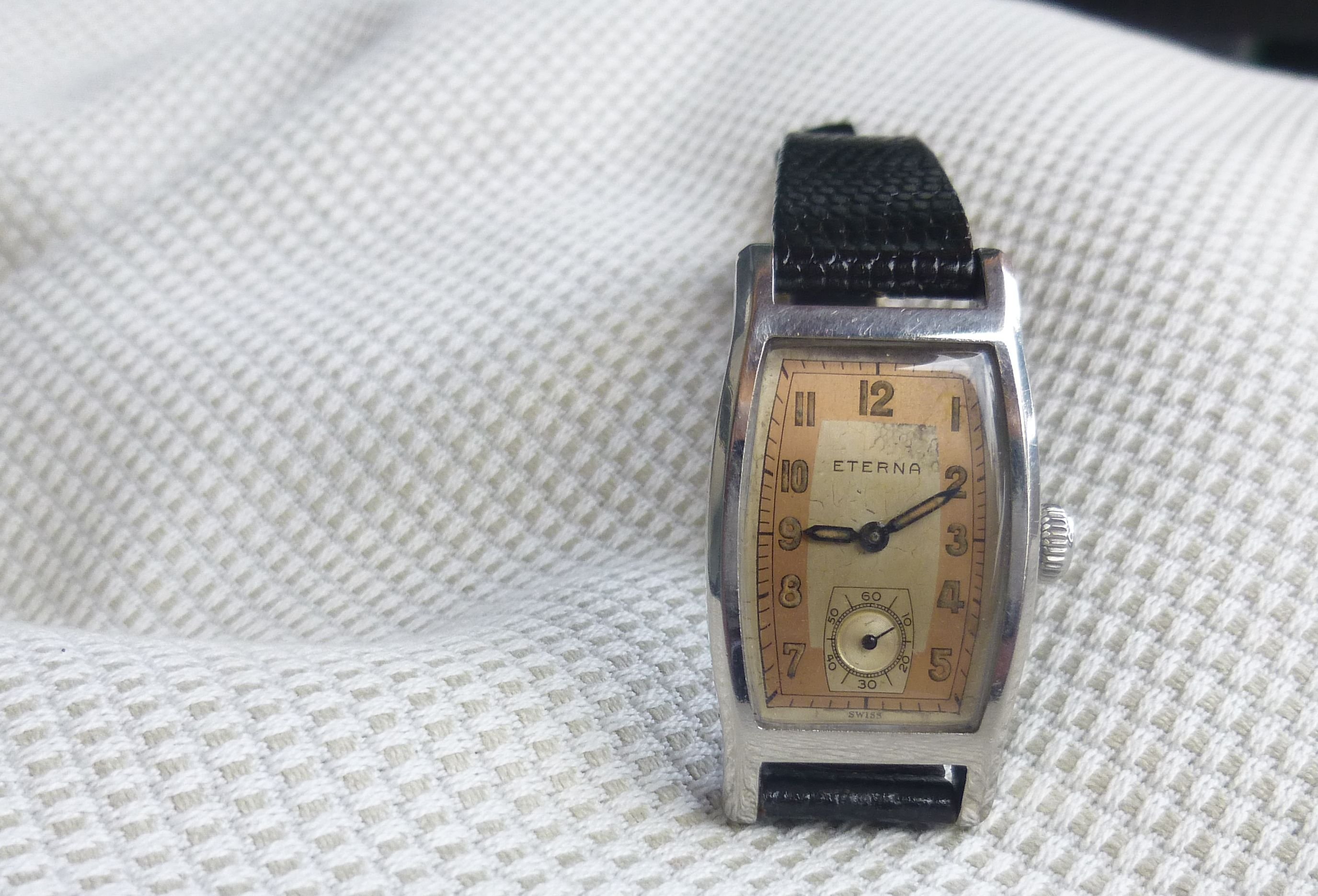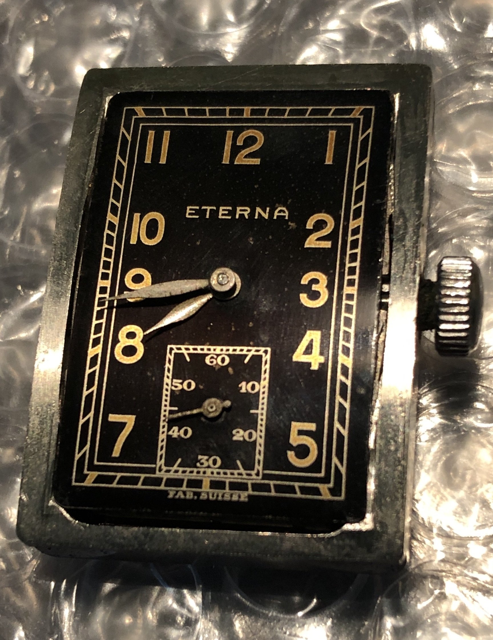 ·Pretty little tank watch that is a new arrival for me. Not a style normally in my wheelhouse, but it captured my attention in a recent auction because of the beautiful dial and early clamshell waterproof-style case with a slight curve.