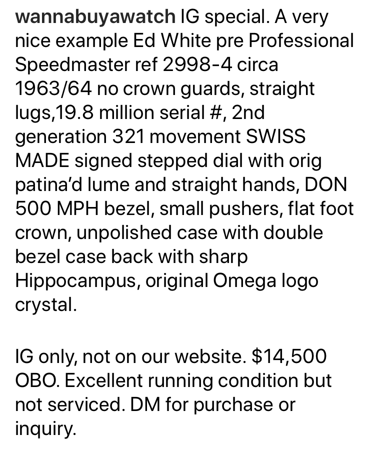 ·i saw this 2998-4 Speedmaster for sale on Instagram this morning. At first glance the price of 14.5 OBO seems very fair... but, all isn’t right. No images of the movement or inside of case-back, the hands are baton and the movement number is listed as 19.8, a little high for a 2988-4, more likely a 105.002-62, maybe a 2998-5.