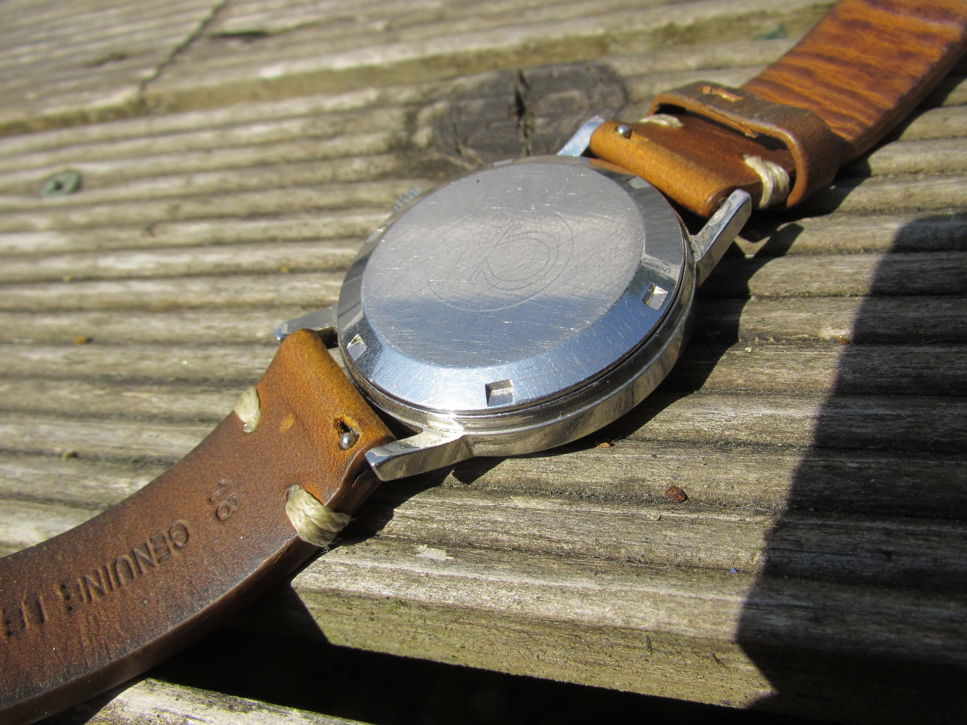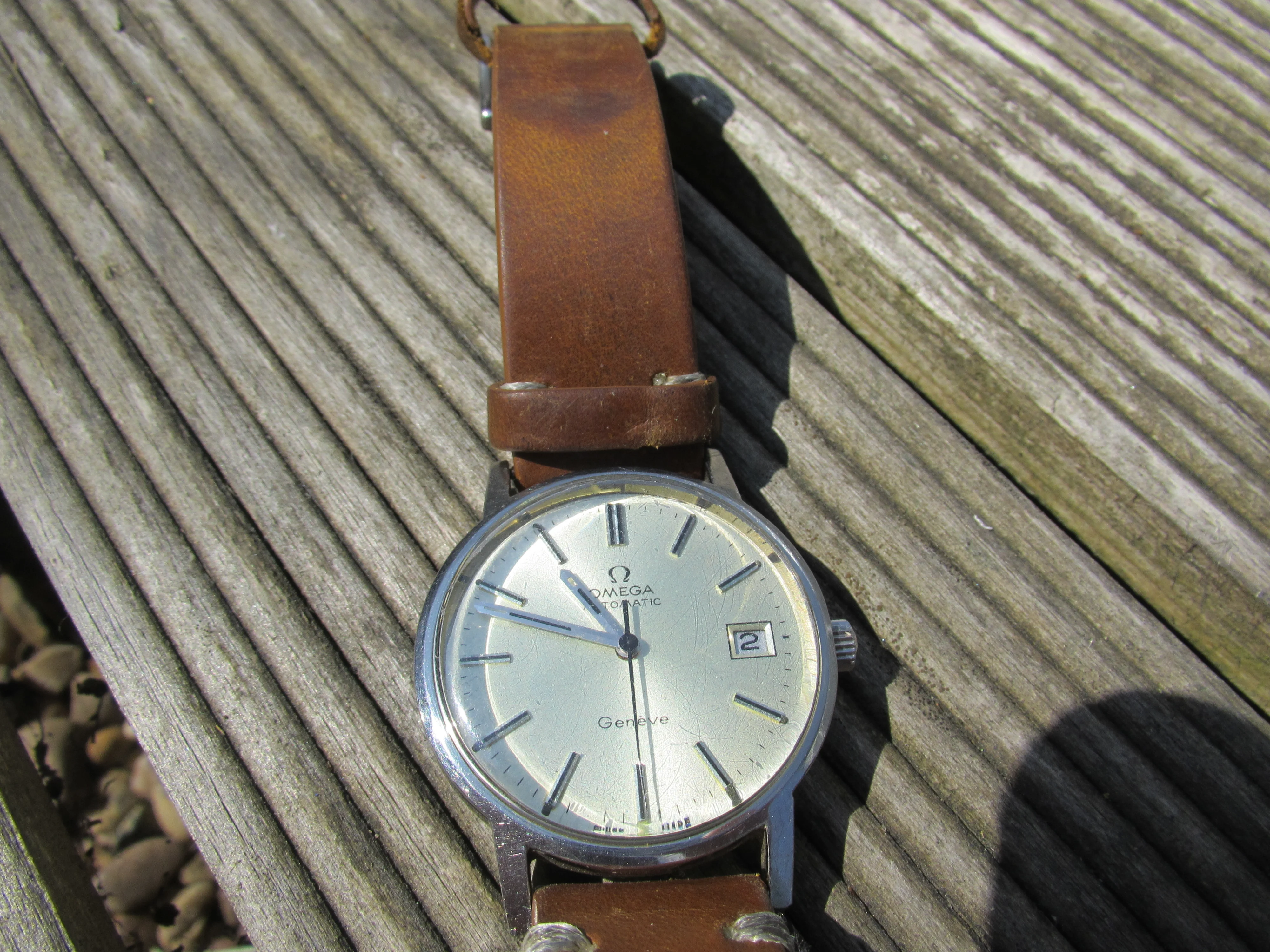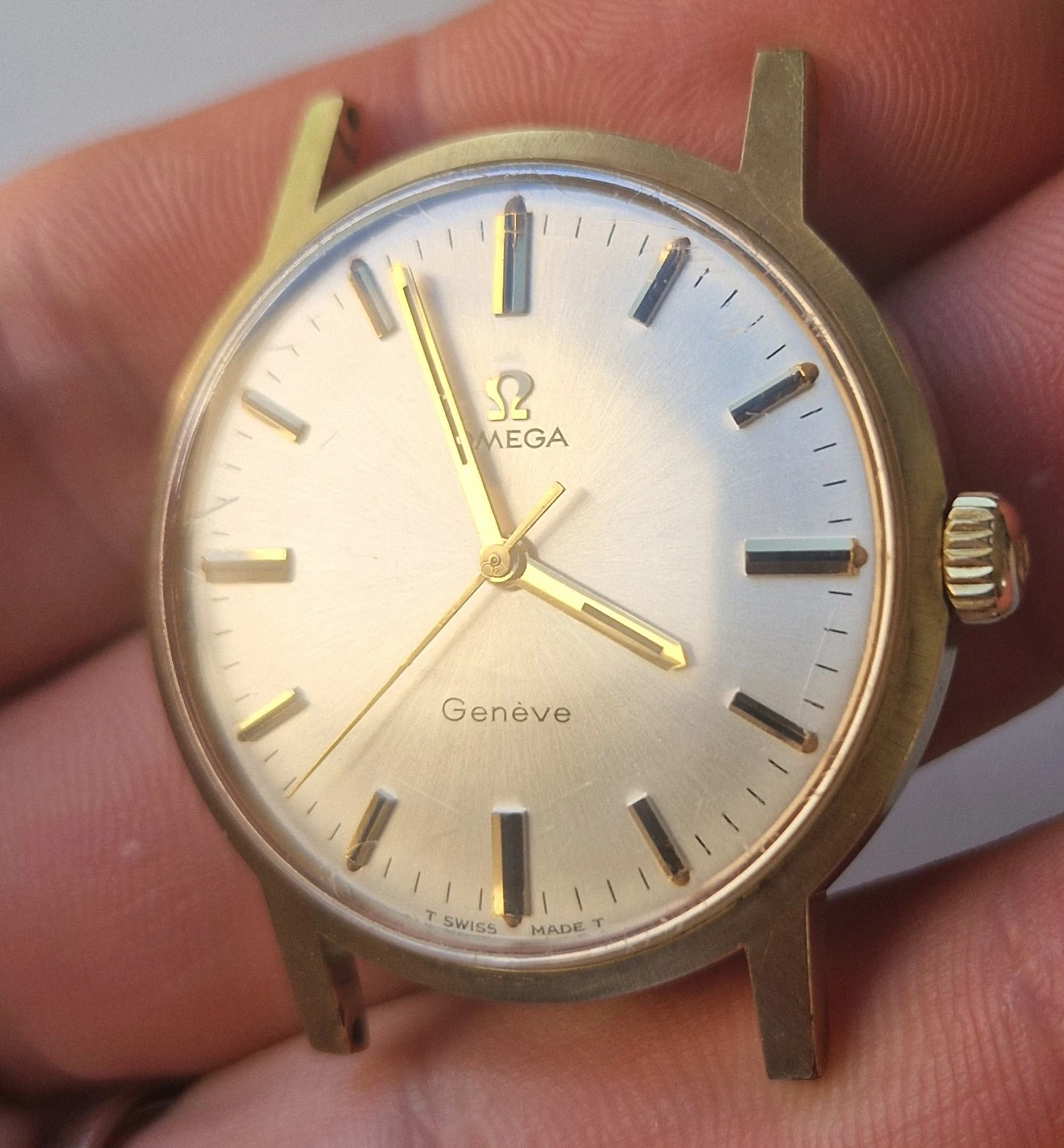 Anyways the watch is a 1973 166.0163 Geneve with the much maligned 1012 movement in it. Only fault is hacking doesn't work which is not really a problem for me. A light champagne? sunburst dial, almost mint bar a small discolouration in between 1 and 2 indices. No lume behind the indices however no discolouration to suggest there was lume there and the lumed ends of the hands have no lume, again no sign on the back there ever was lume. Maybe a previous owner had this tidied up?
