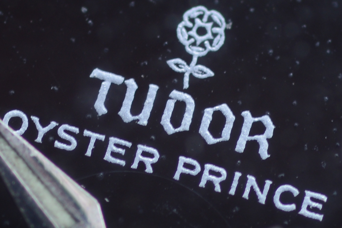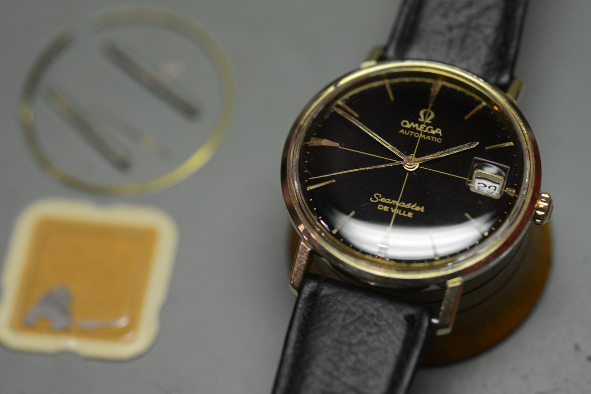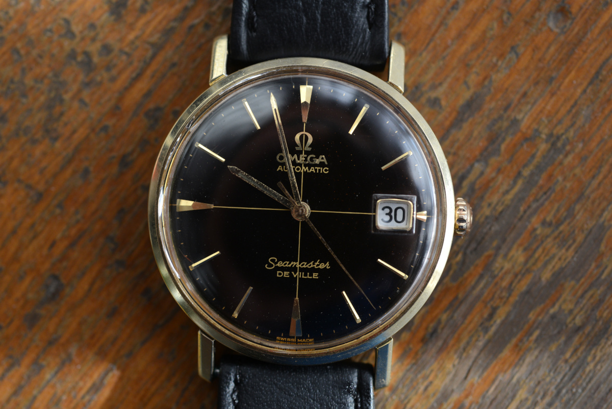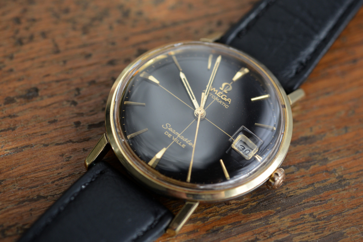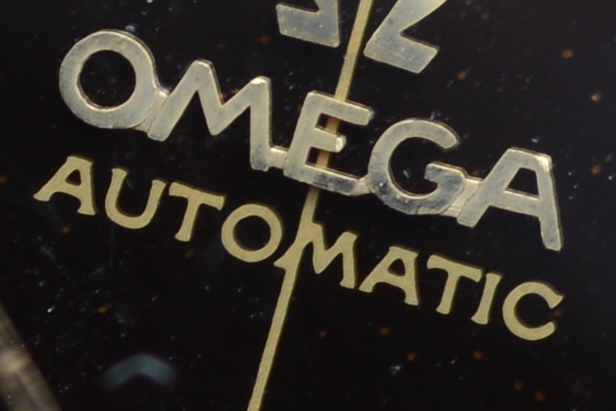 A close up of the differences between gilt and paint (both are glossy black dials of roughly the same vintage, around 1964)
