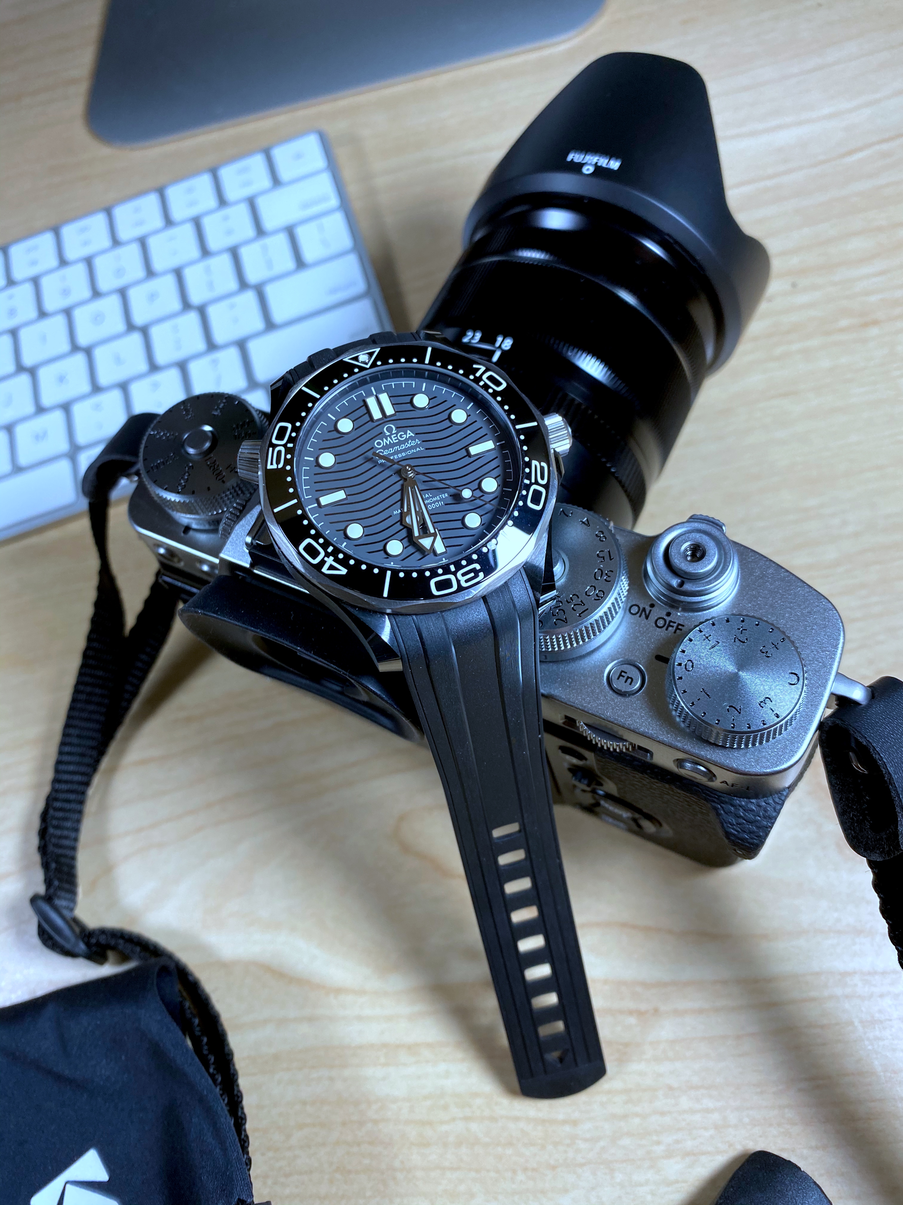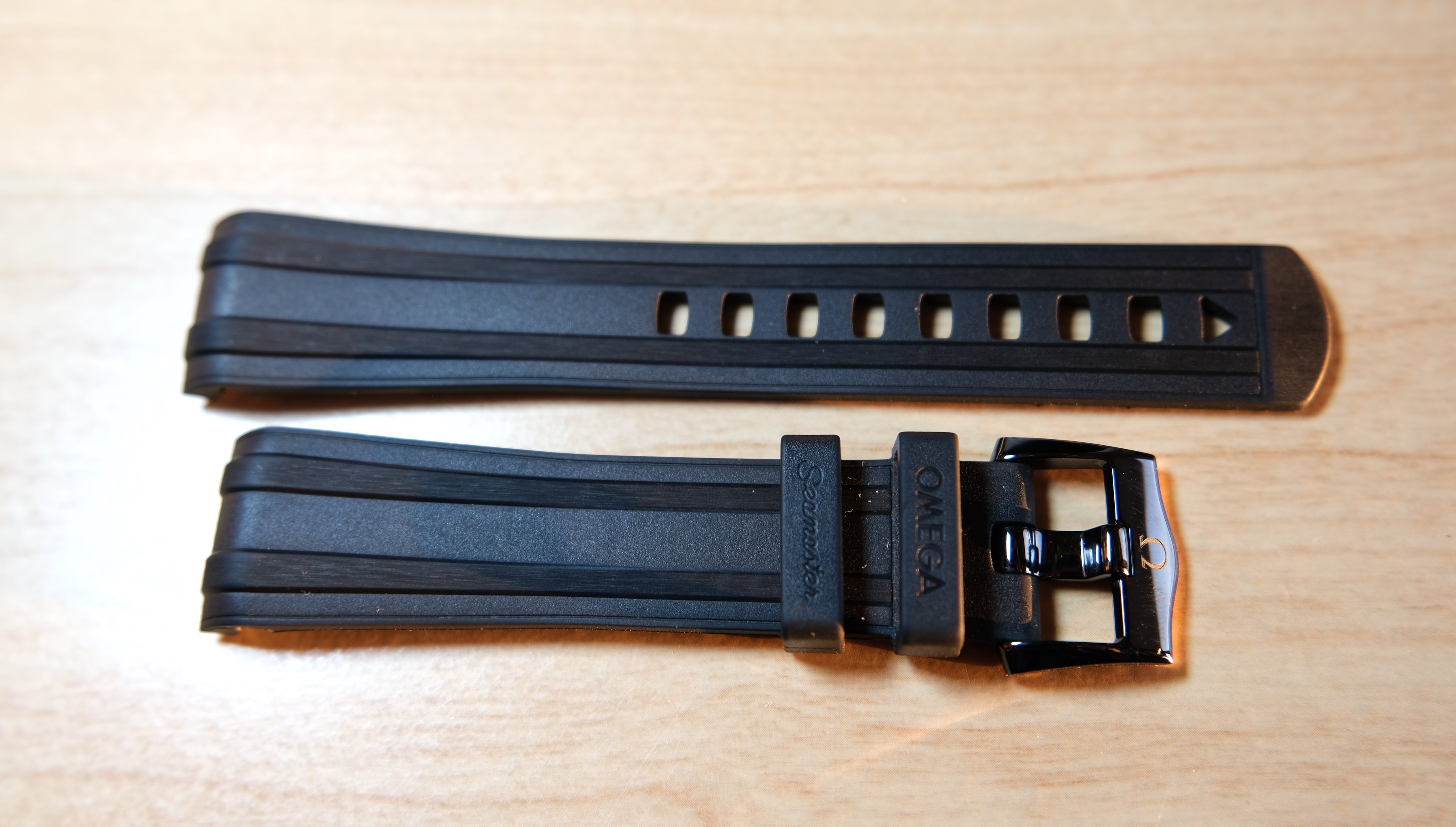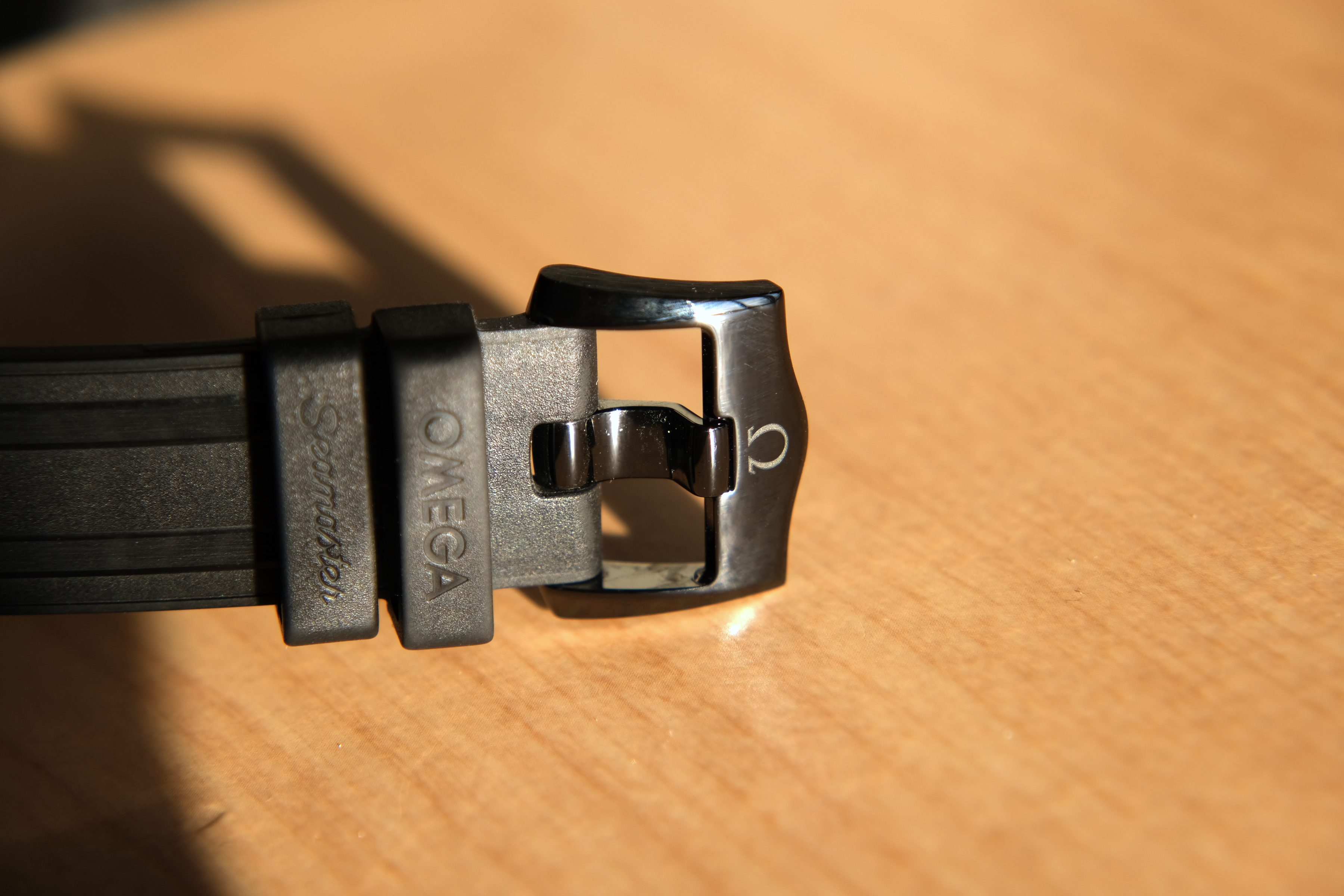 The strap that the black ceramic/titanium Seamaster Professional comes with is essentially the same as the one that comes with the stainless steel versions. The only differences are that this strap is 21 mm in width at the case end and that it has a black ceramic pin and buckle. Like the standard Seamaster Professional rubber strap, this one is dense, but flexible. The rubber does not have any particular smell and also does not attract lint - I am told these are traits of a high-quality rubber. It also features a titanium-reinforced keeper and a nicely polished black ceramic buckle. The strap is very comfortable and seems durable. With an MSRP of $8100 USD, however, I really think this watch should have come on a titanium bracelet. As I paid well below retail, this was not a deal-breaker for me.