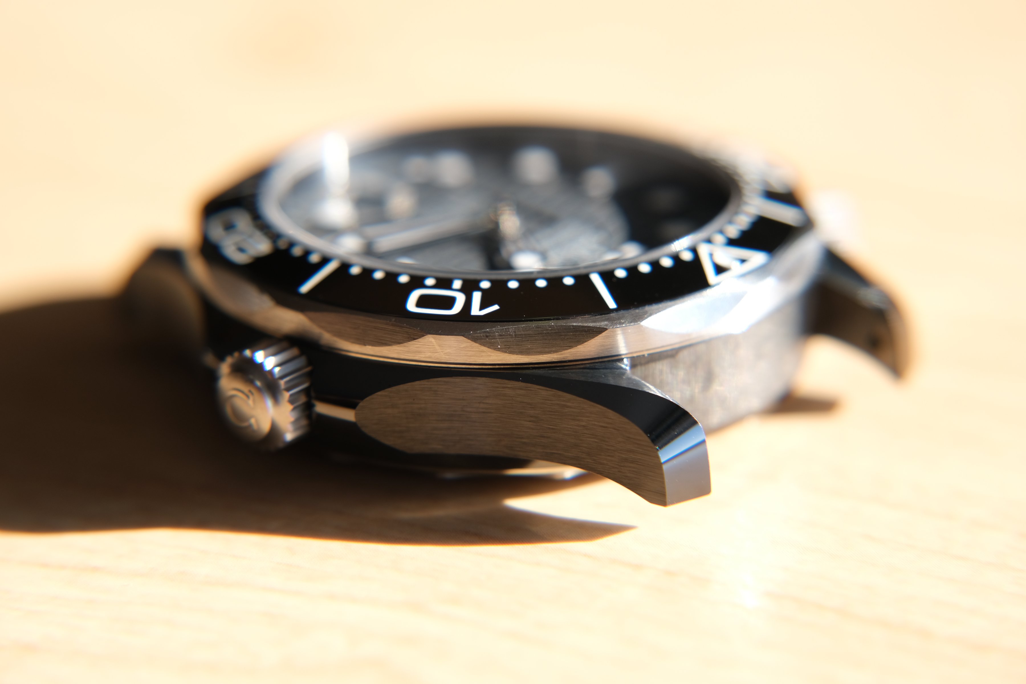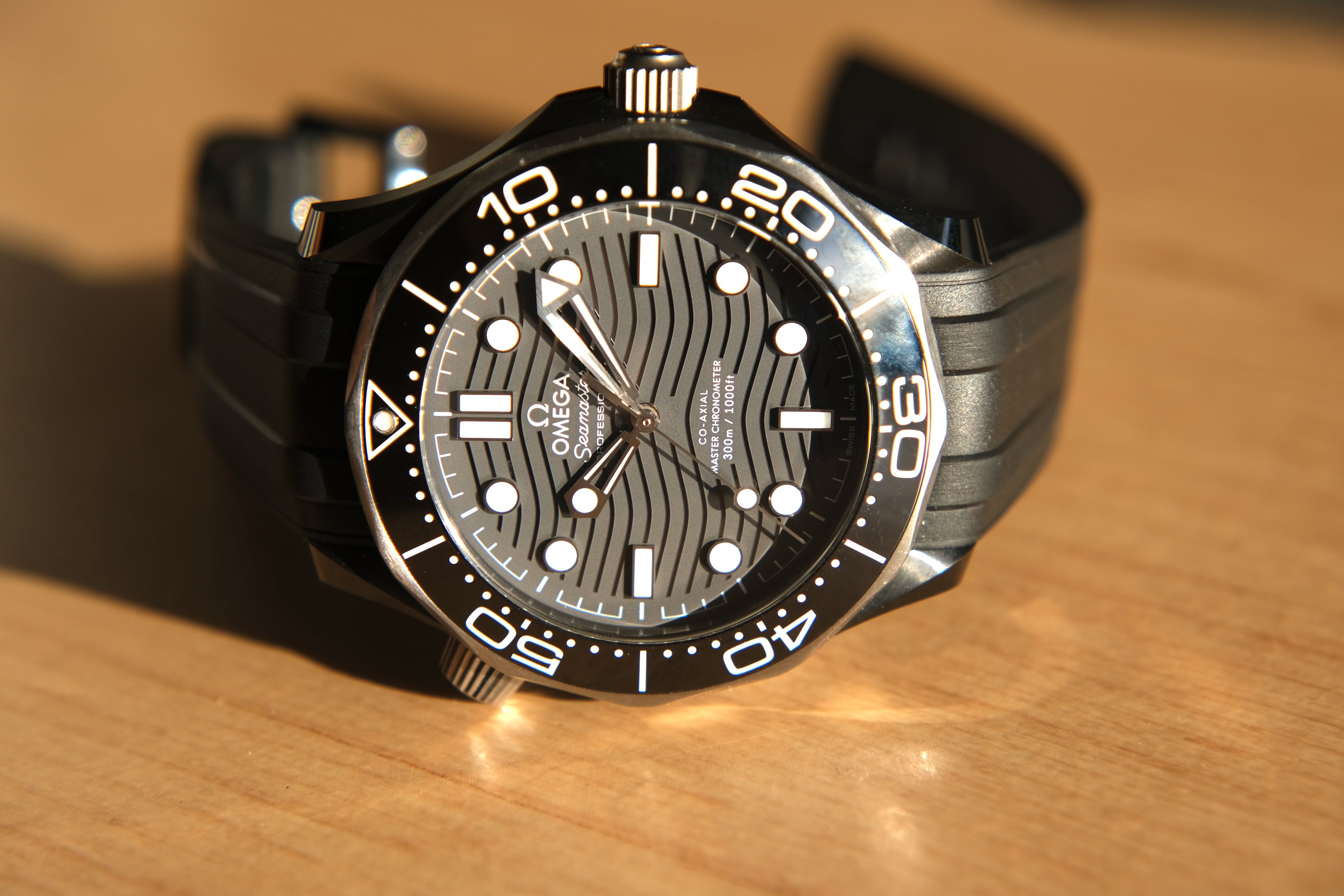 I initially had some concerns about the size of the black ceramic/titanium Seamaster Professional. Coming in with a diameter of 43.5 mm and a lug-to-lug length of 51.5 mm, this watch is the largest I have ever owned. That said, due to the immediate downward angling of the rubber strap, the watch is easily accommodated by my 6.8 to 7.0-inch wrist. The black ceramic case also has a slimming effect on the overall height of the watch, which makes the 14.5 mm height much less pronounced on the wrist than one might otherwise expect - even on a big fat OEM NATO strap.