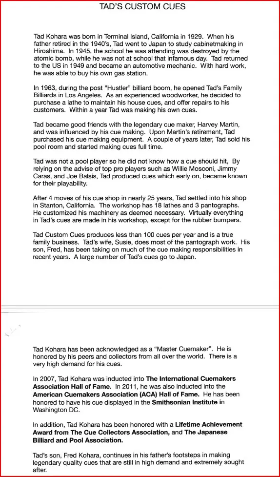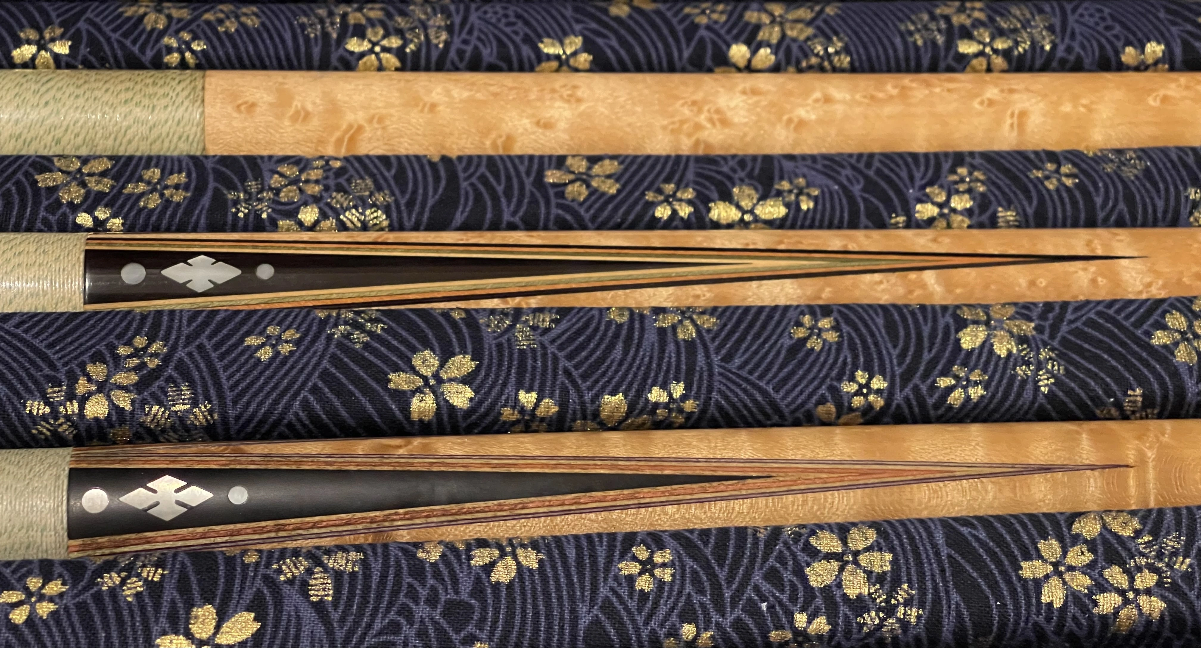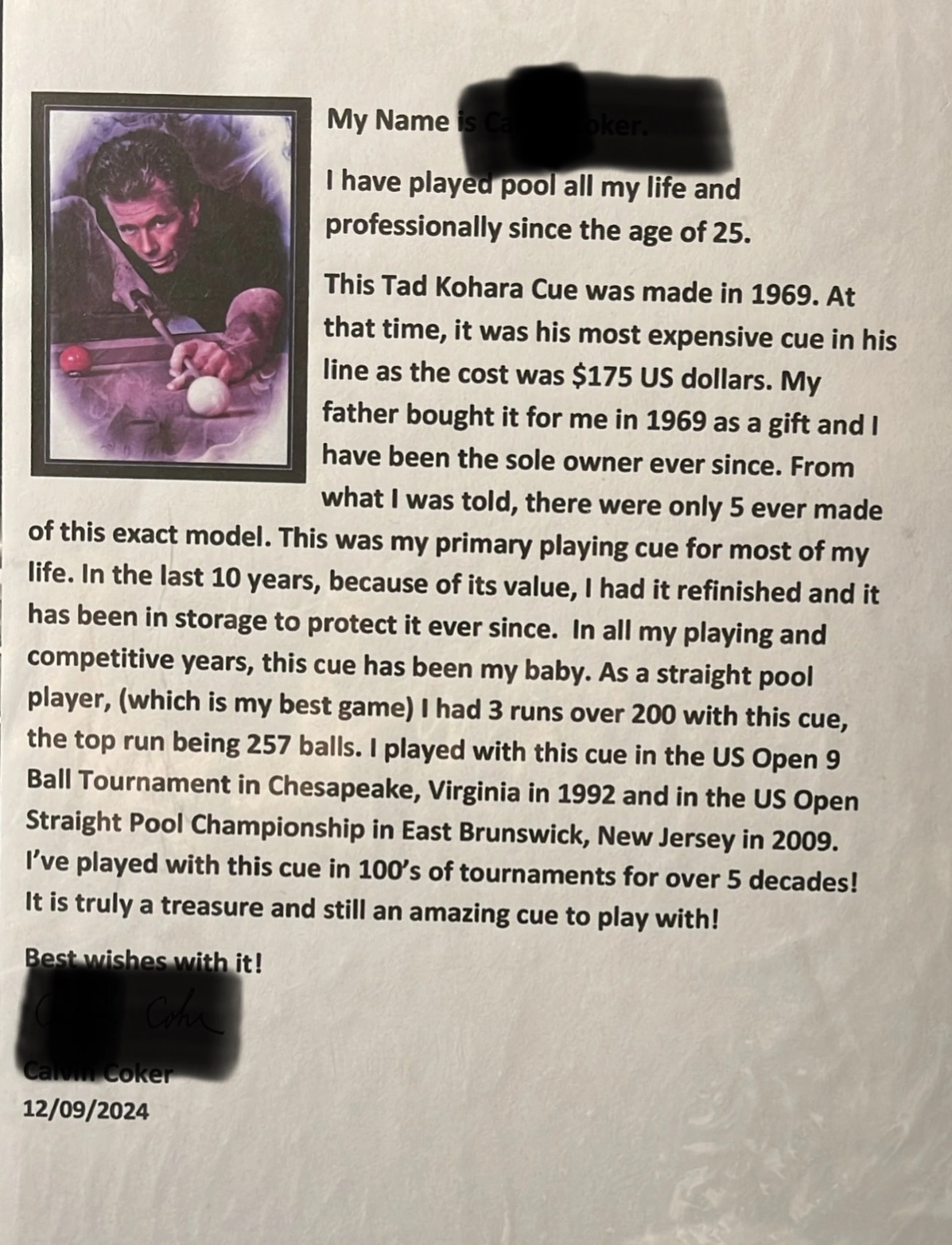 But one cue is above all else, it's been a champion many times in the hands of its former owner. It was created by Tad Kohara who was a Billiards Cue Hall Of Fame cue maker of the level of George Balabushika.
