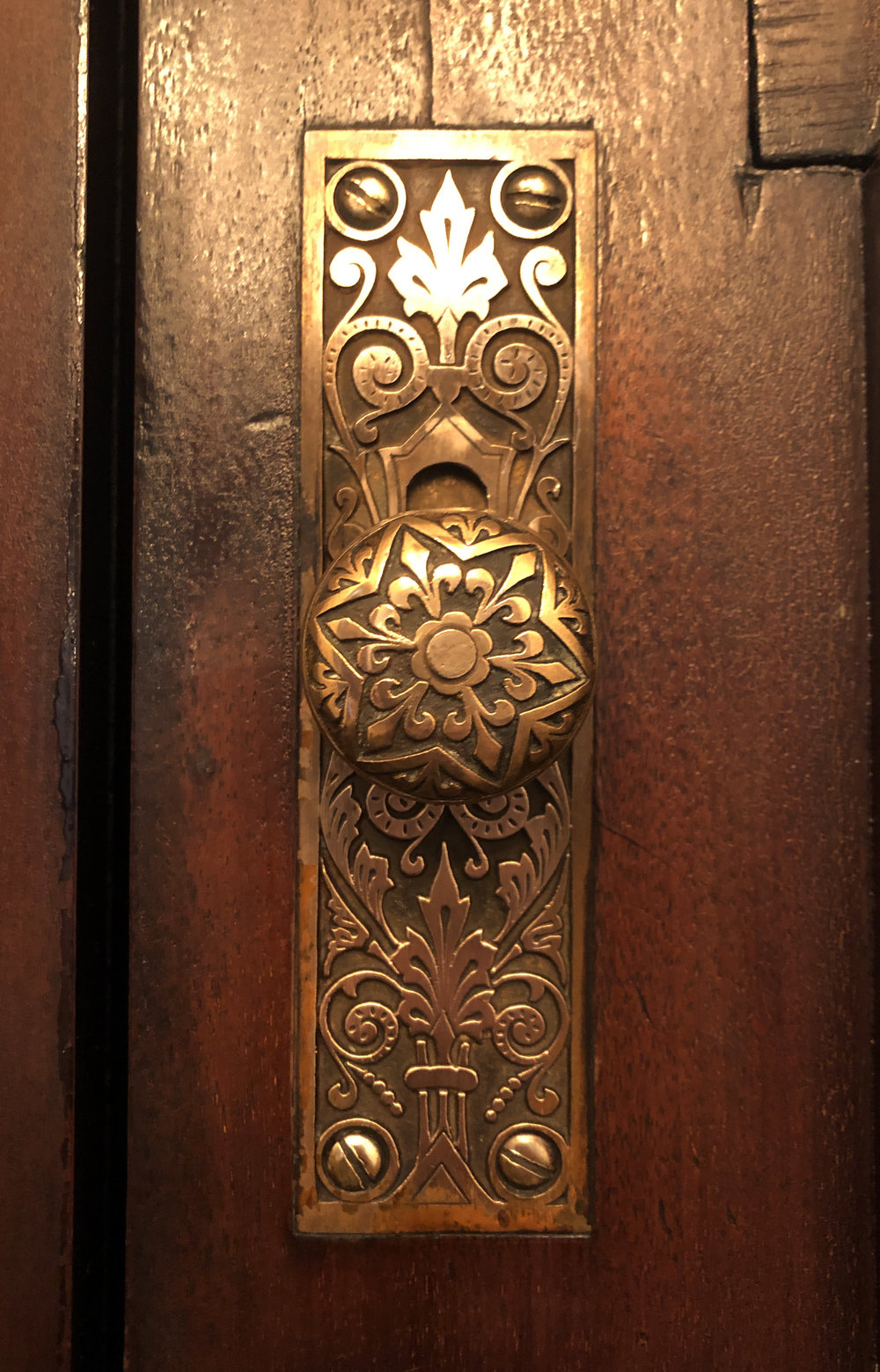 Cast bronze flush bolt on the front door made by Russel & Irwin in 1885. Credit: https://threebirdscoffee.com/building-1