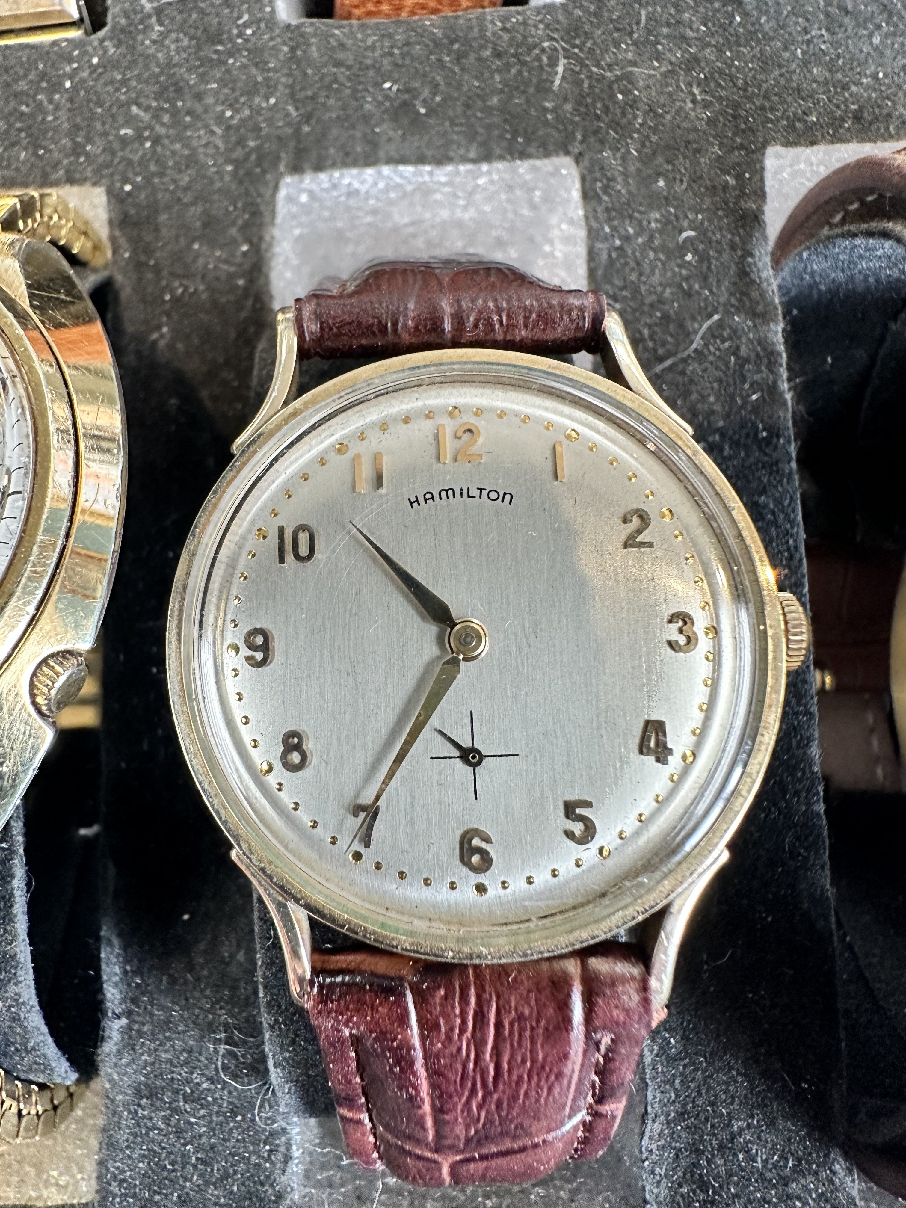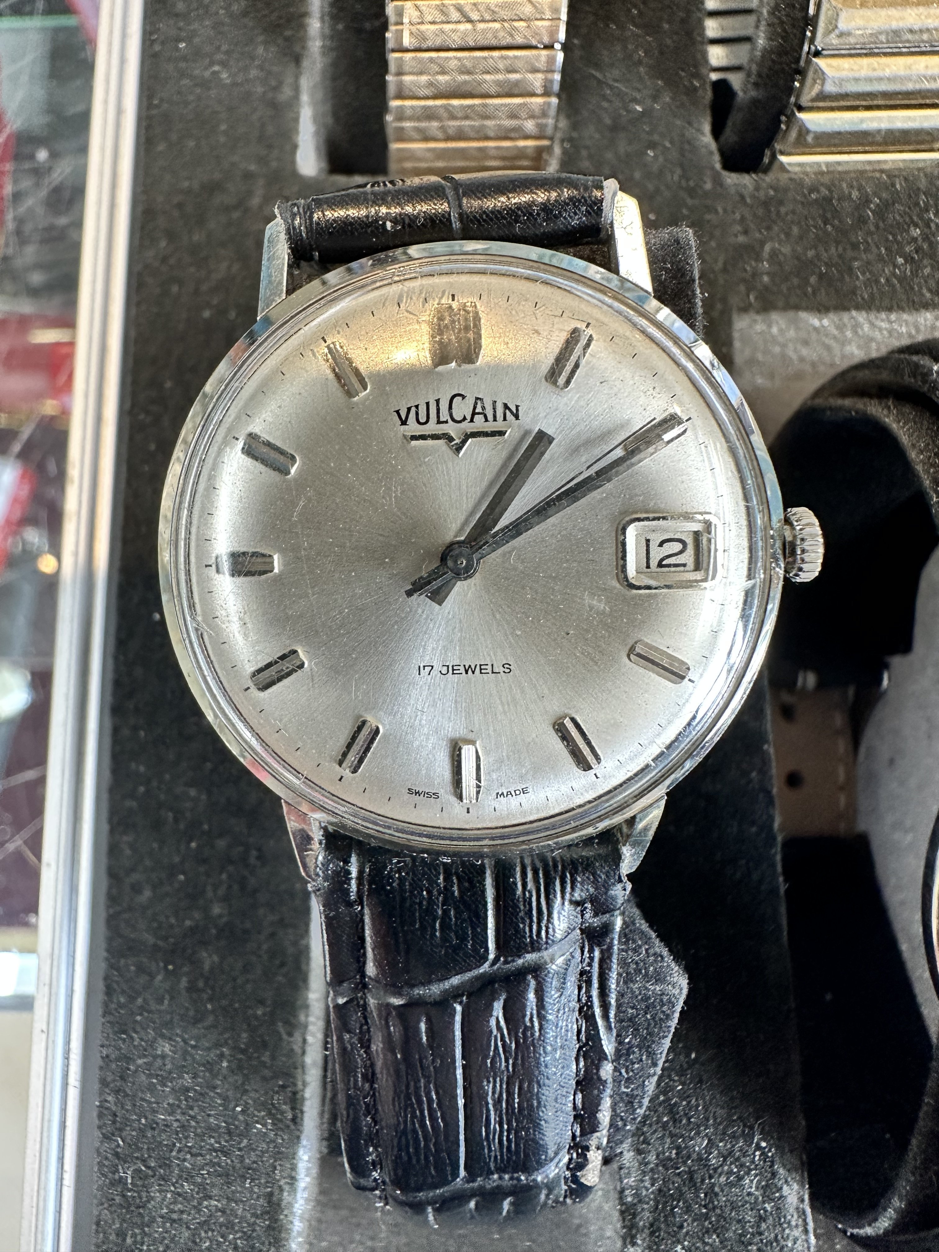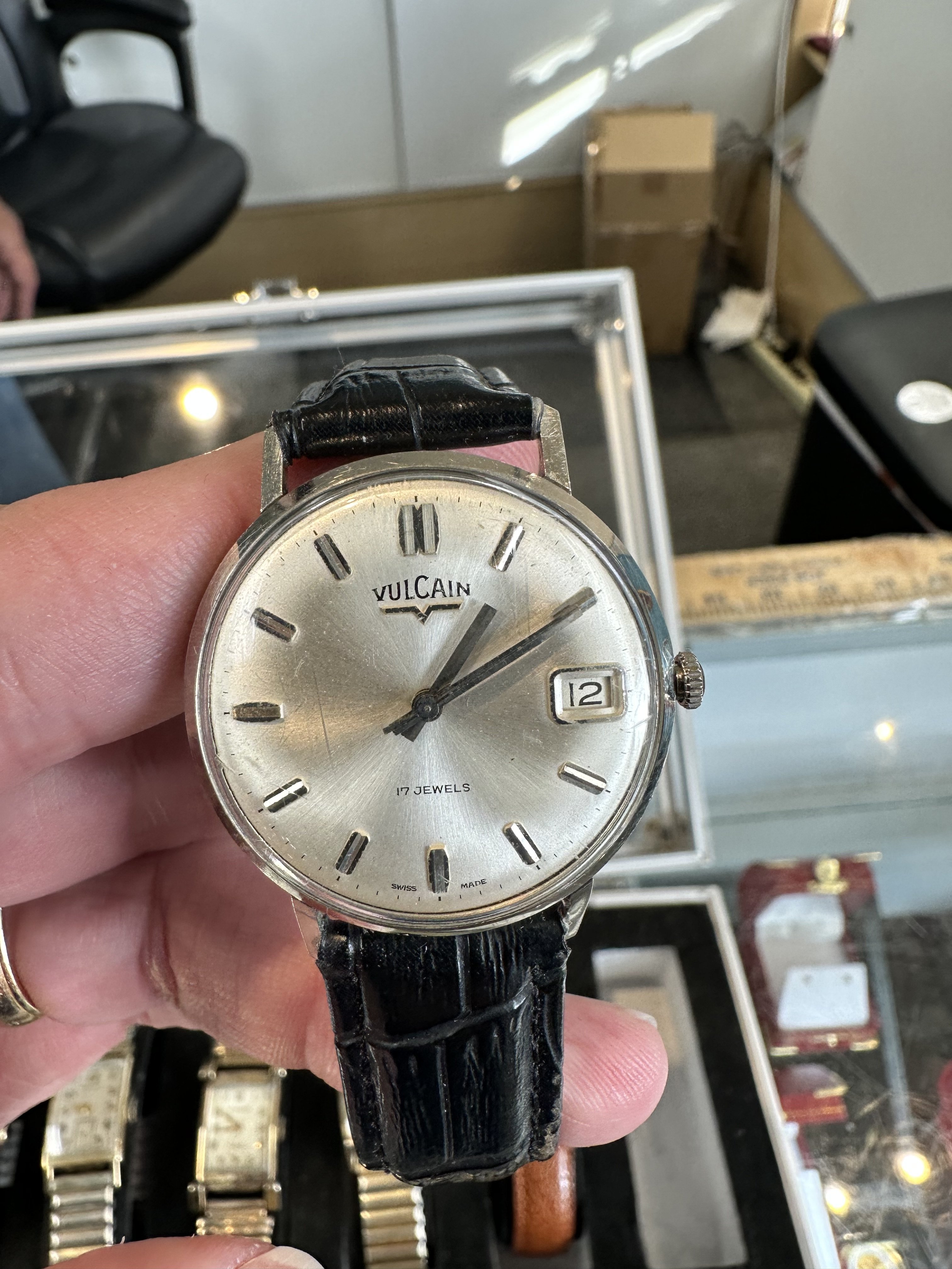 ·Went in the hunt locally to see what might be lurking around. Found a few Omegas (posted in the Vintage forum) and these two watches. A 1940s (so he says) Vulcain 14k white gold watch with box and papers and a Hamilton. 1100.00 for the Vulcain and 550.00 for the Hamilton. Pics below. The Vulcan is a sharp watch but is overpriced from what I can quickly research. No idea on the Hamilton. The best part of the day was getting out and on the hunt. Enjoyed that…