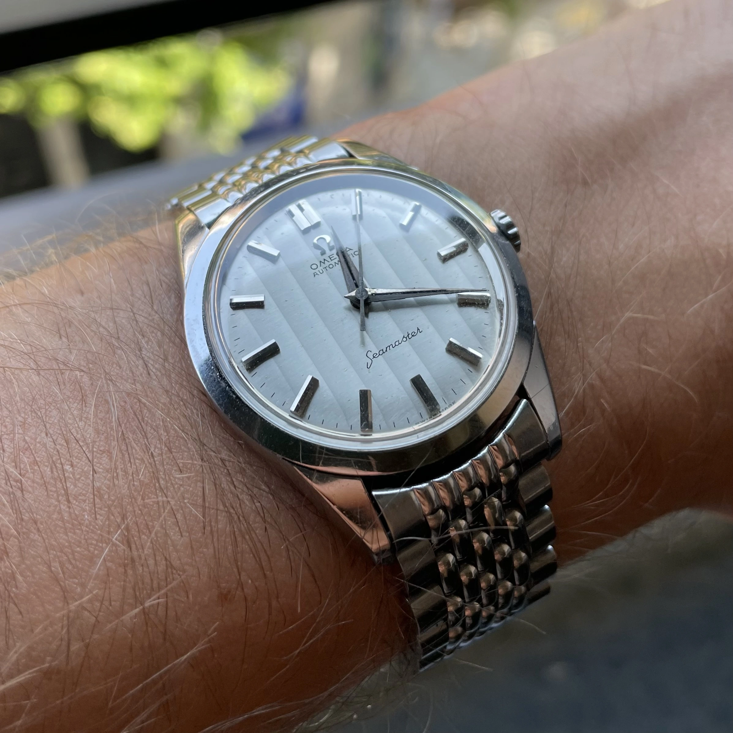 I recently gave myself permission to start looking into the prospect of buying a nice watch for some big forthcoming life events and found myself here. After lurking for a while, I've narrowed my search down to a stainless steel 1960's Seamaster, particularly reference 166.010 with cal 565. This one which was sold here yesterday had pretty much everything I want -- good condition, 5xx movement with date, white sunburst dial, onyx hour markers, beads of rice bracelet. That price of around $1200, is technically feasible for me but while I initially did like the idea of buying from a reputable expert/collector, as I learn more I'm becoming rather fond of the research and hunt and don't want to rush the process which is honestly half the fun with this kind of thing. I just had a few questions for the community for anyone who had the time or inclination to help a beginner.