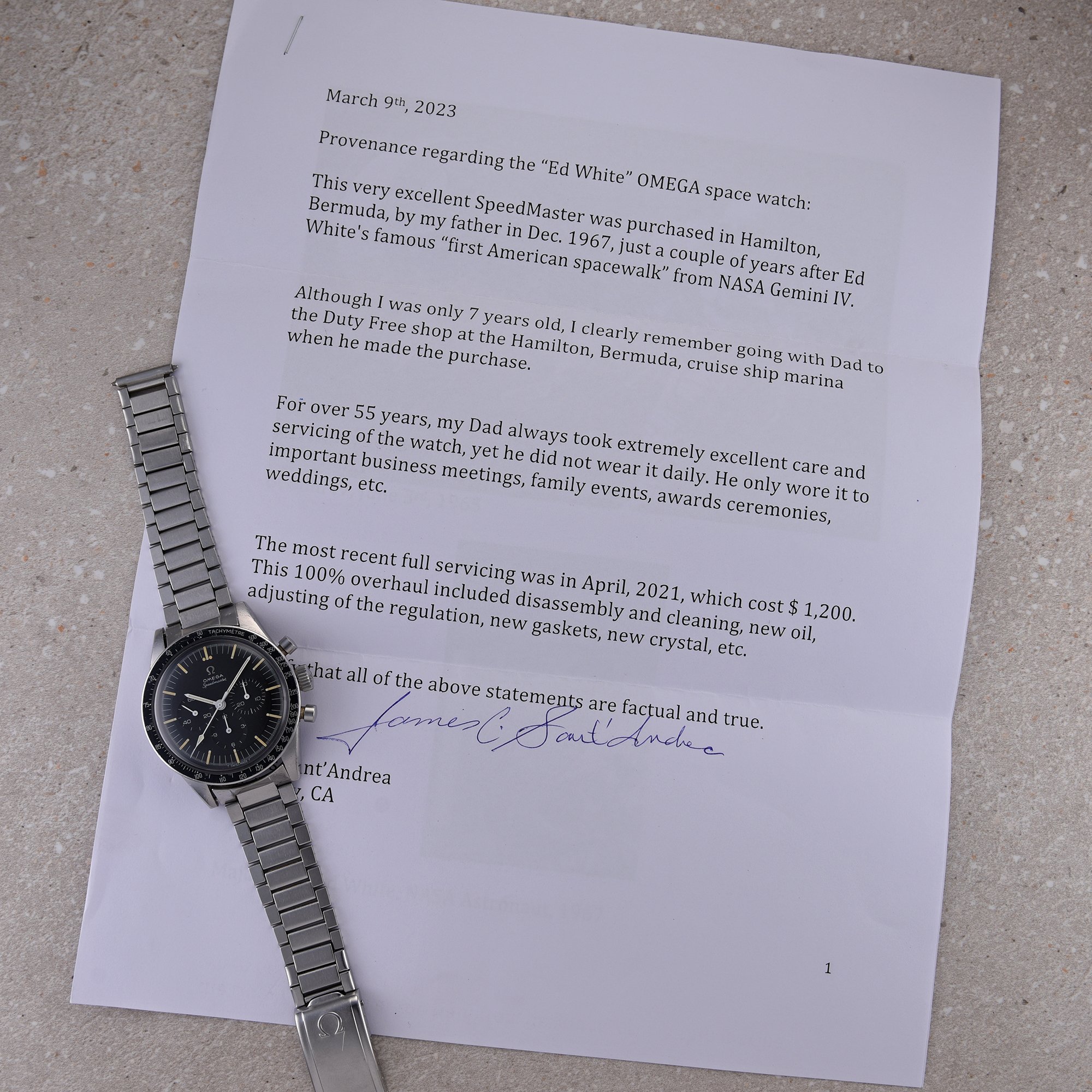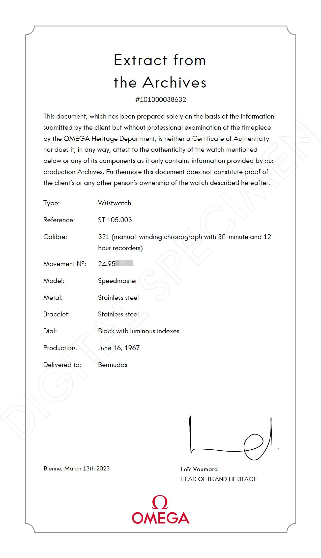 Accessories: Omega Extract Of The Archives confirms production date of June 16, 1967 and delivery to Bermuda.