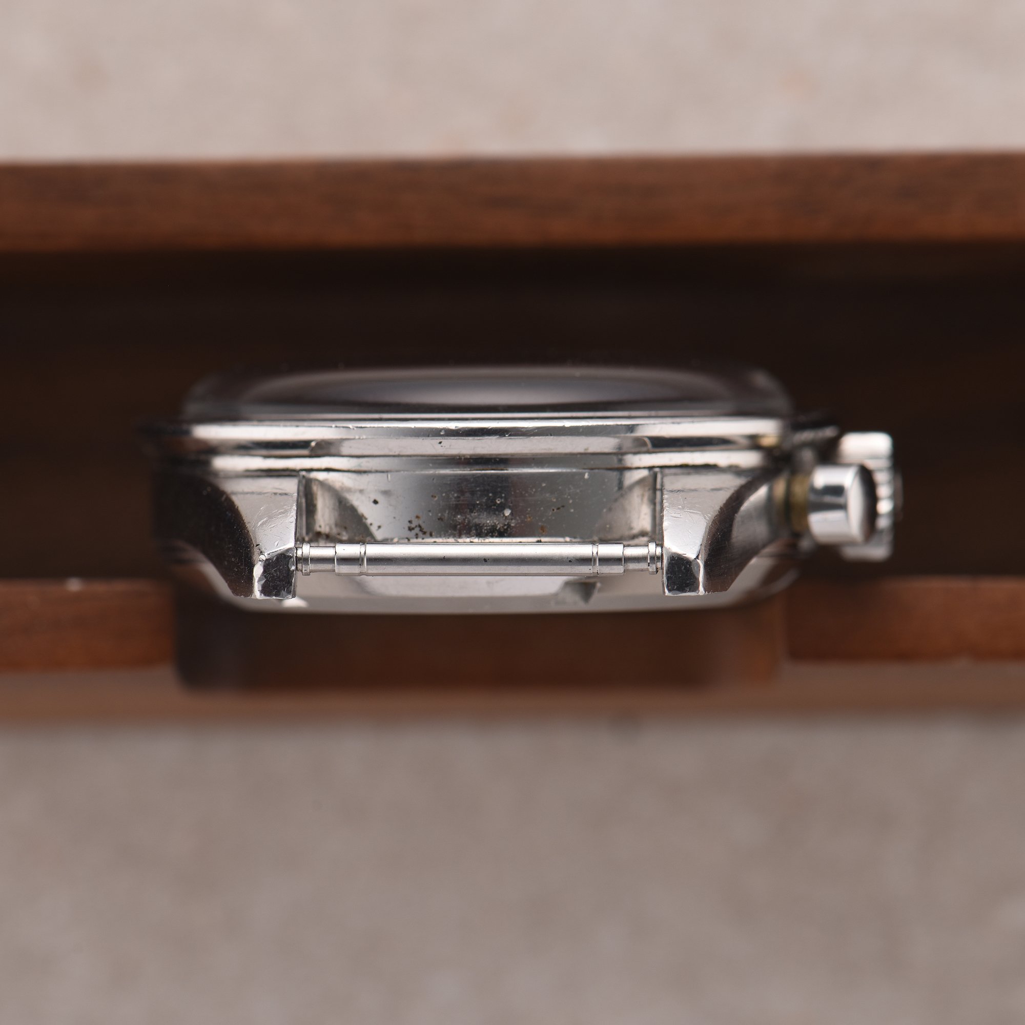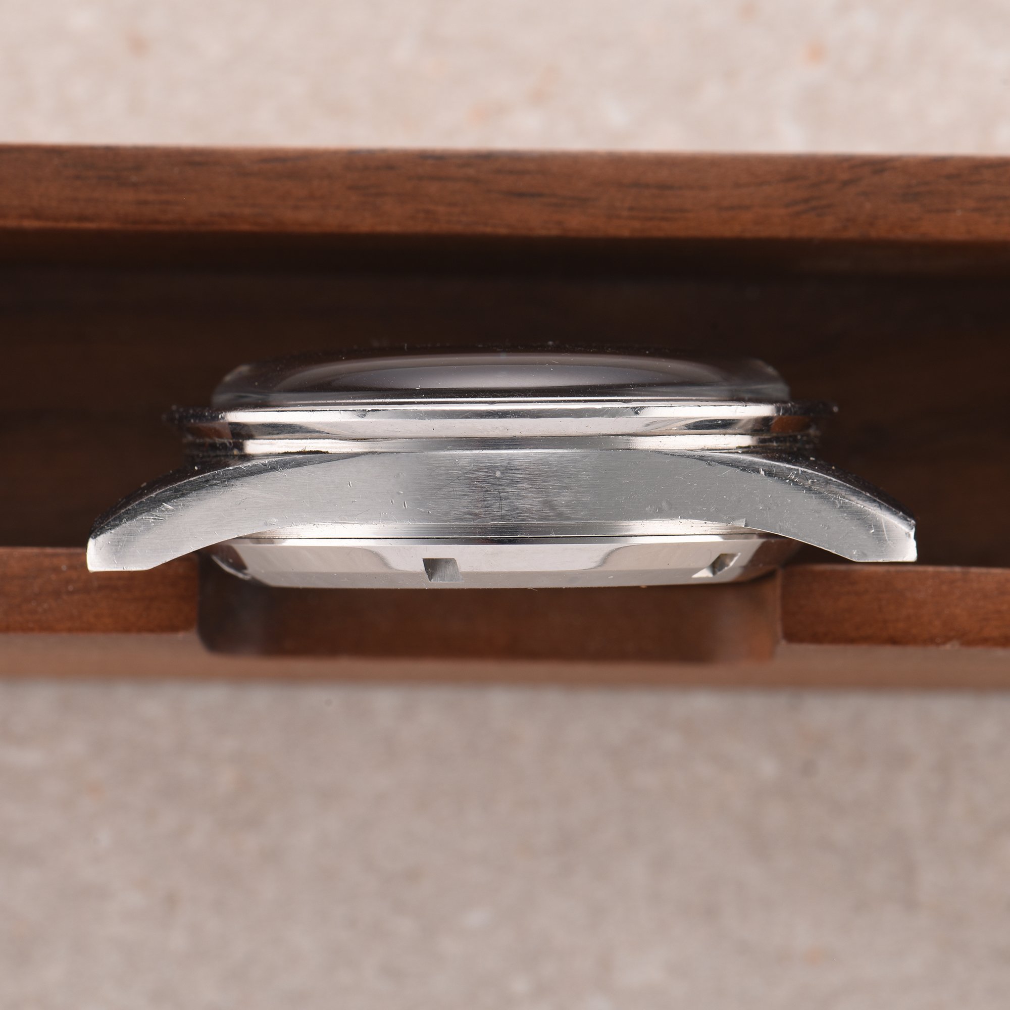 Case: Symmetrical straight lug case. The case is unpolished showing the original factory finish with brushed chamfers. The case exhibits normal wear from use.