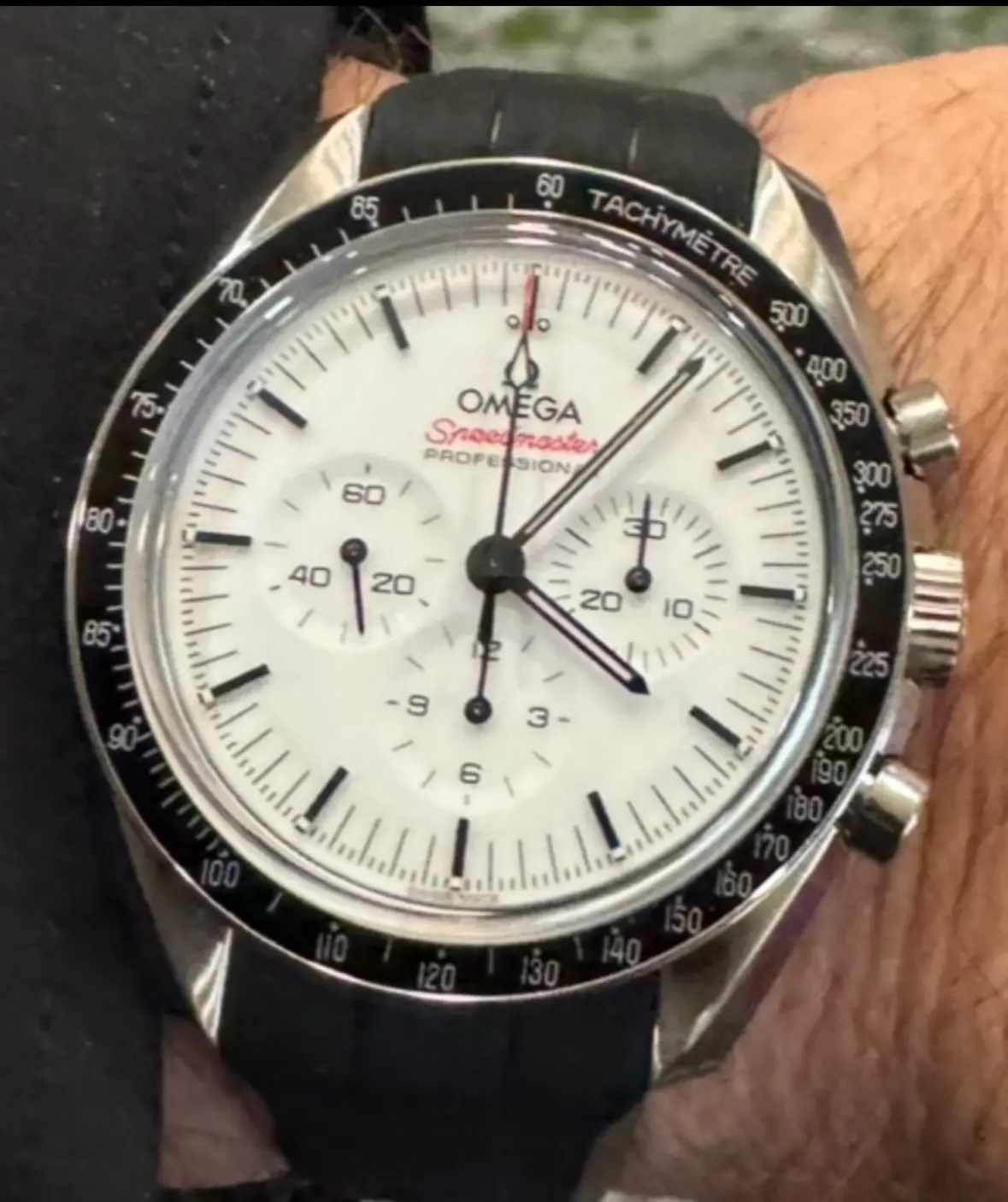 ◦ Authentic Speedmaster Professional models using the Caliber 1861/3861 have distinct subdial spacing. In your photo, the subdials look too close to the center, which is common on replicas using non-Omega movements (like the Seagull ST19 or Valjoux 7750).