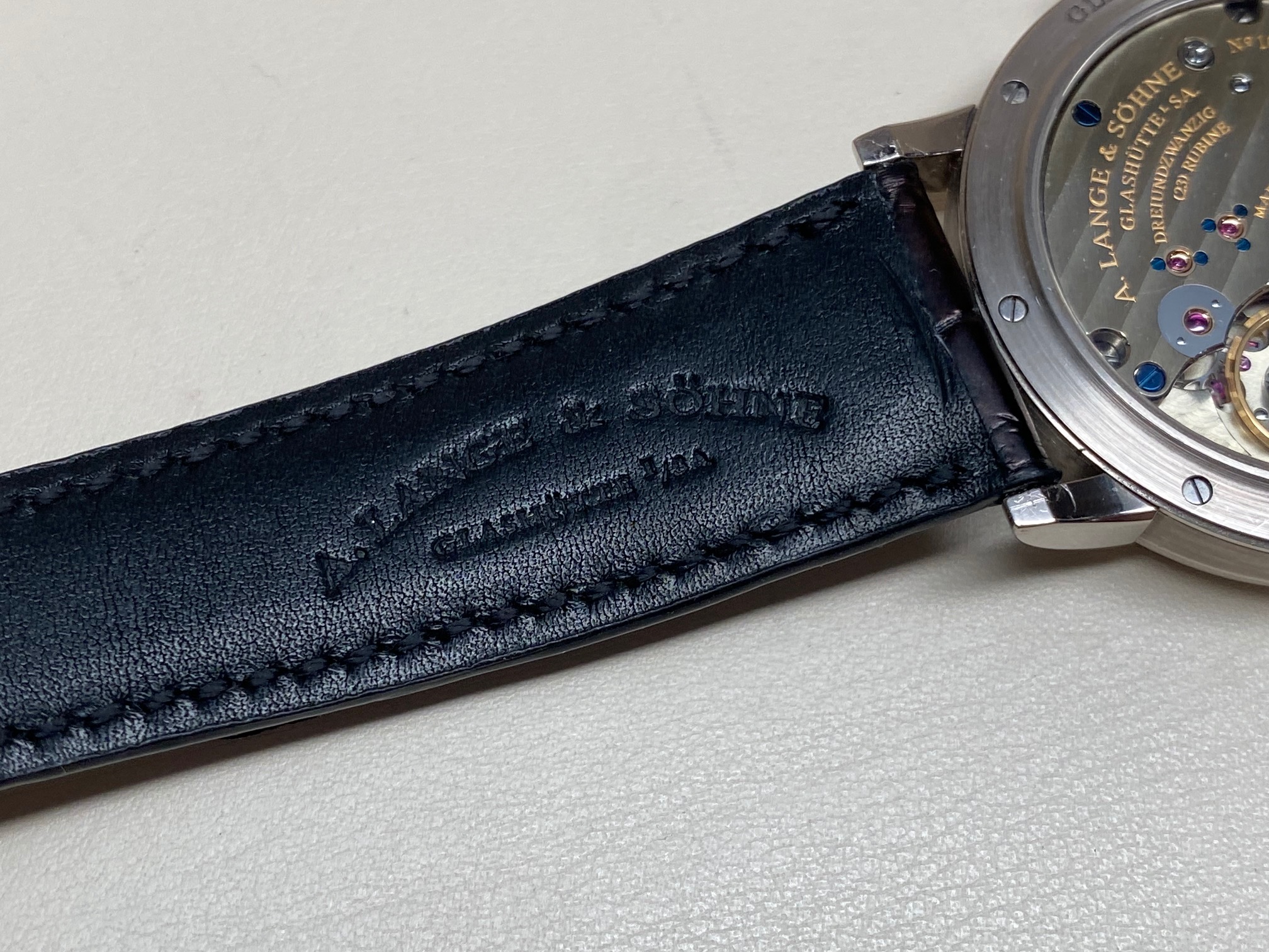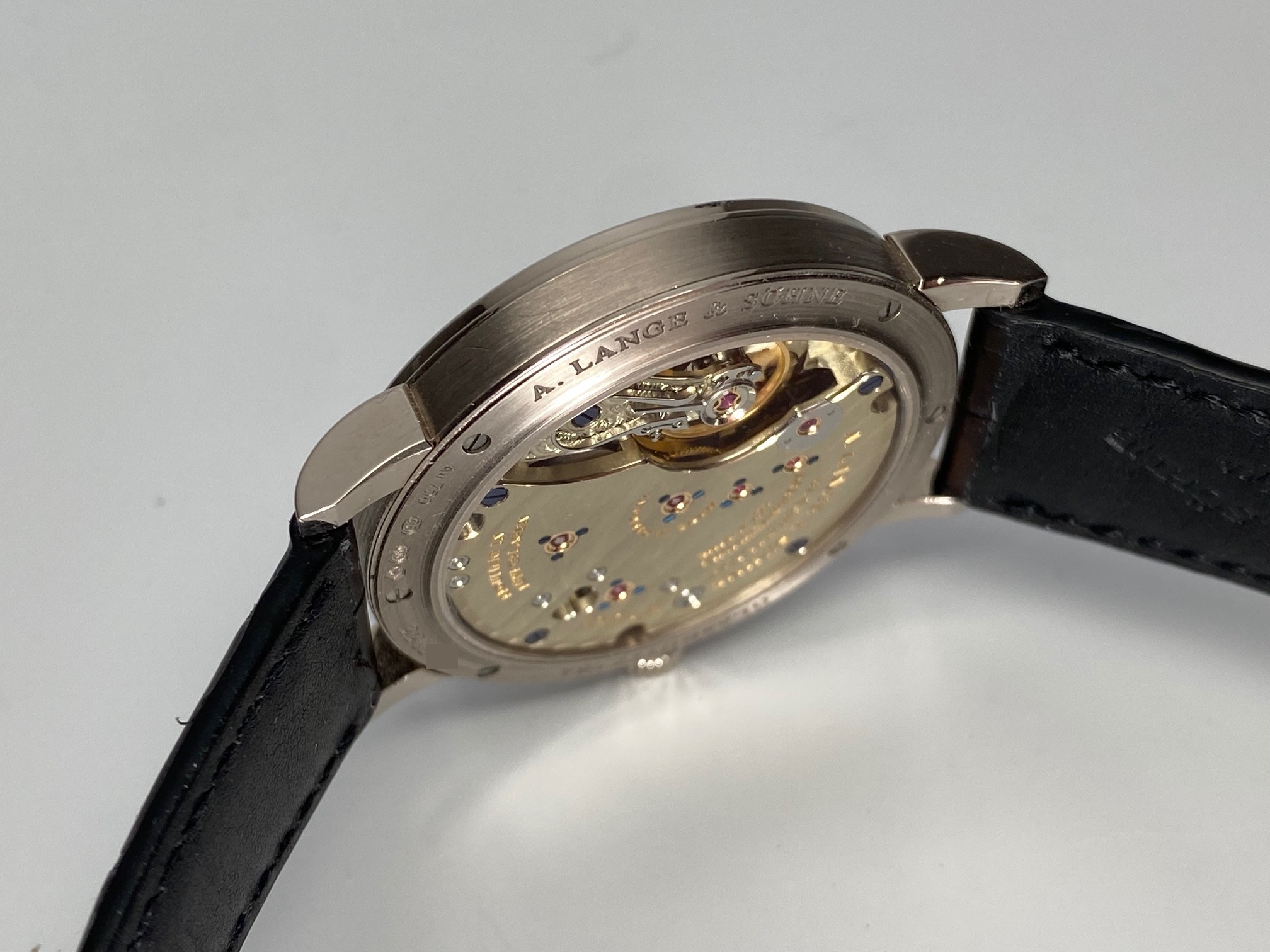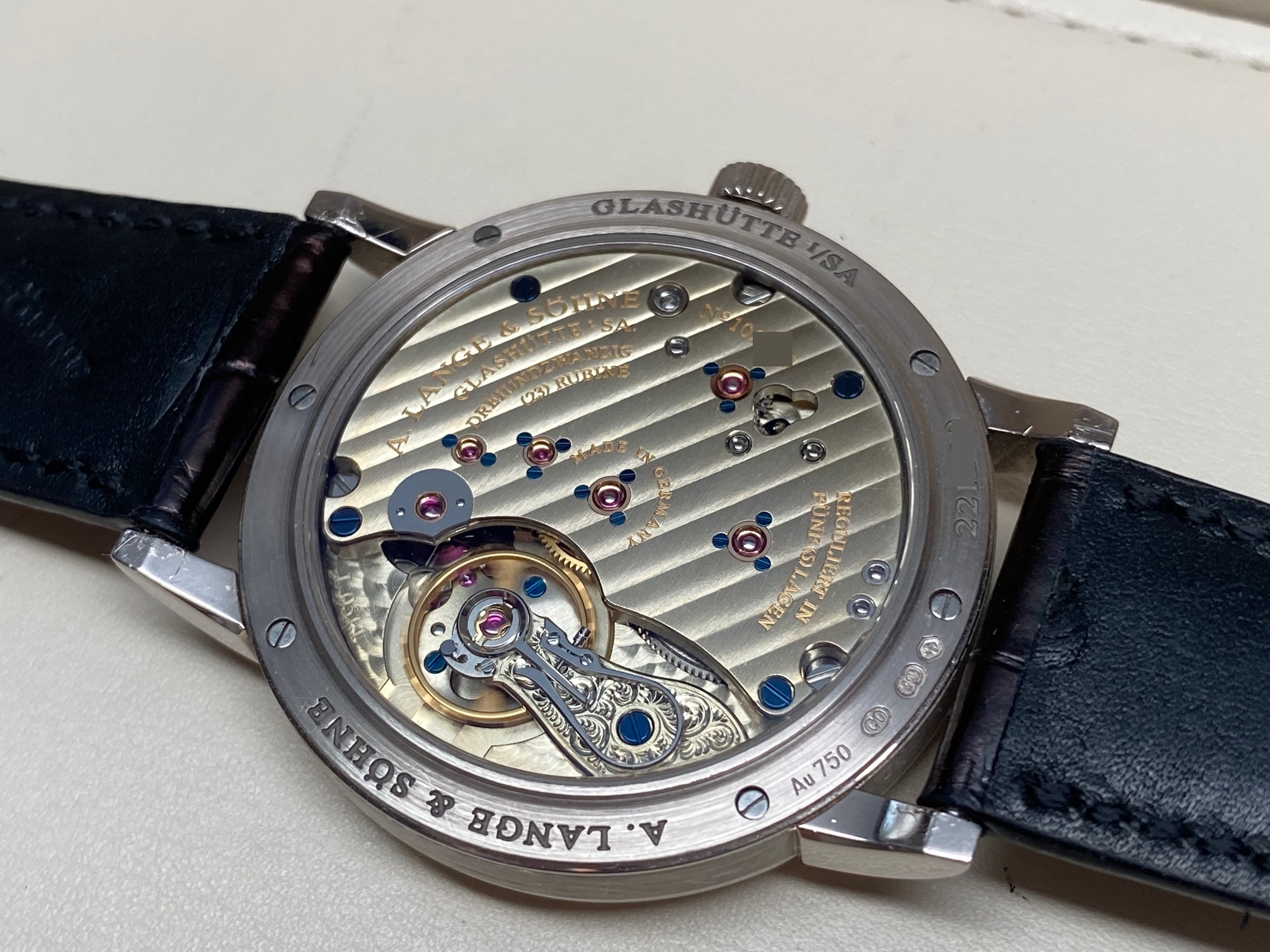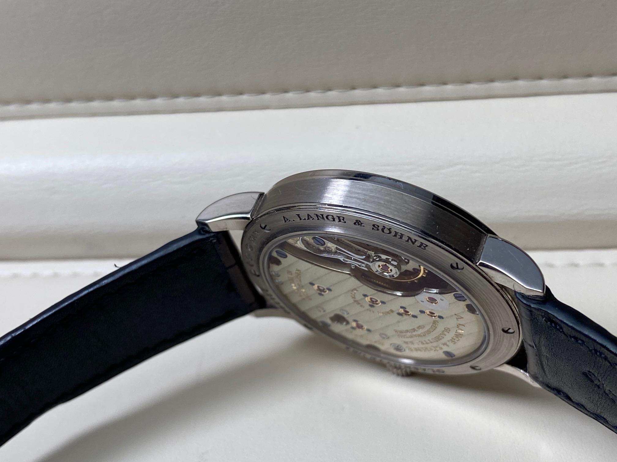 Inside is the A. Lange & Sohne Caliber L051.1, which beats at 21600 vph, is composed out of 188 parts, (contains 23 Jewels), and has an approximate power reserve of 55 hours. The movement 3/4 back plate is finely finished with striped/ribbed finish and polished beveled edges and the balance-cock is hand engraved making each watch unique. The movement has “stop seconds” for accurate time setting.