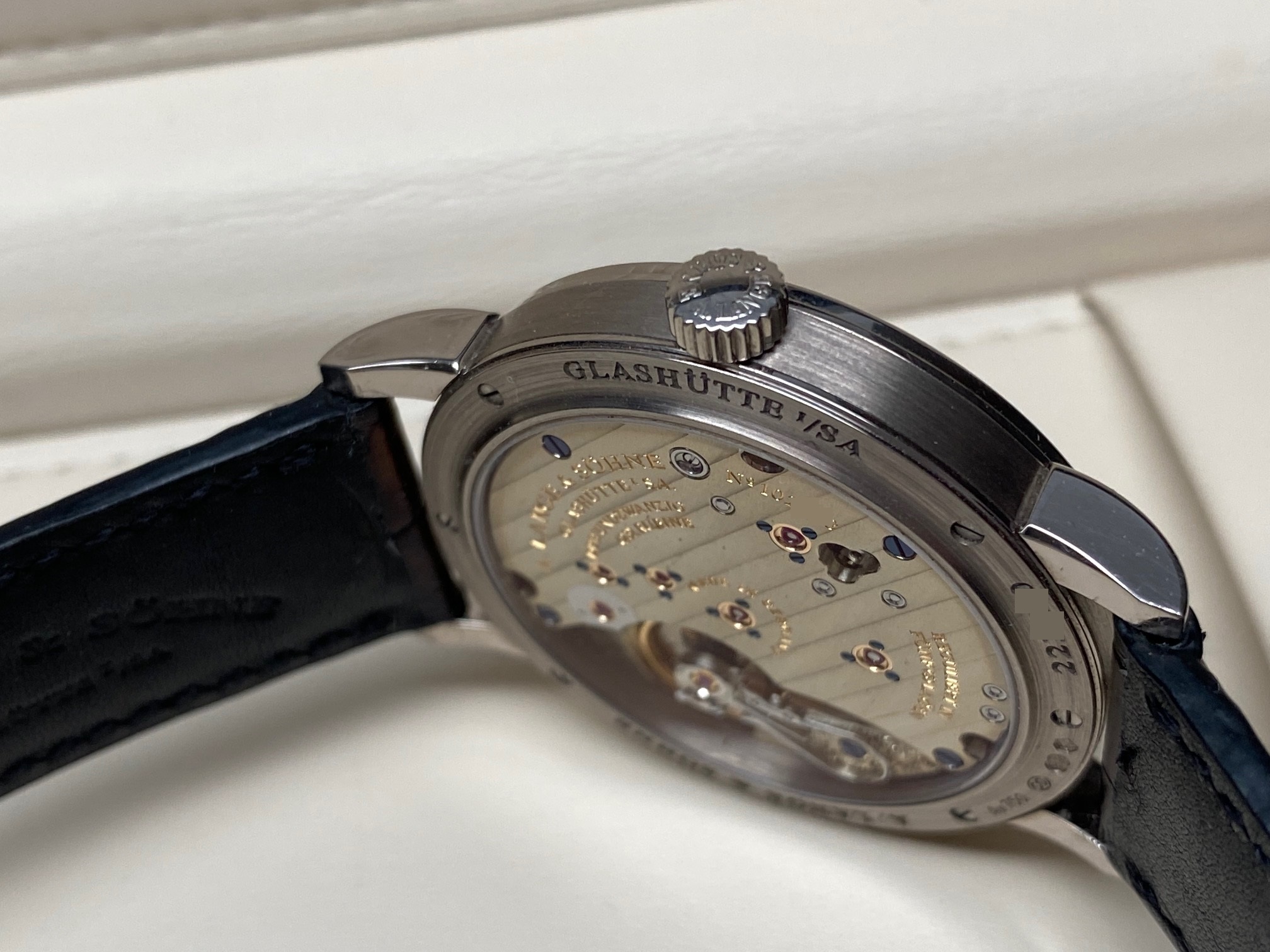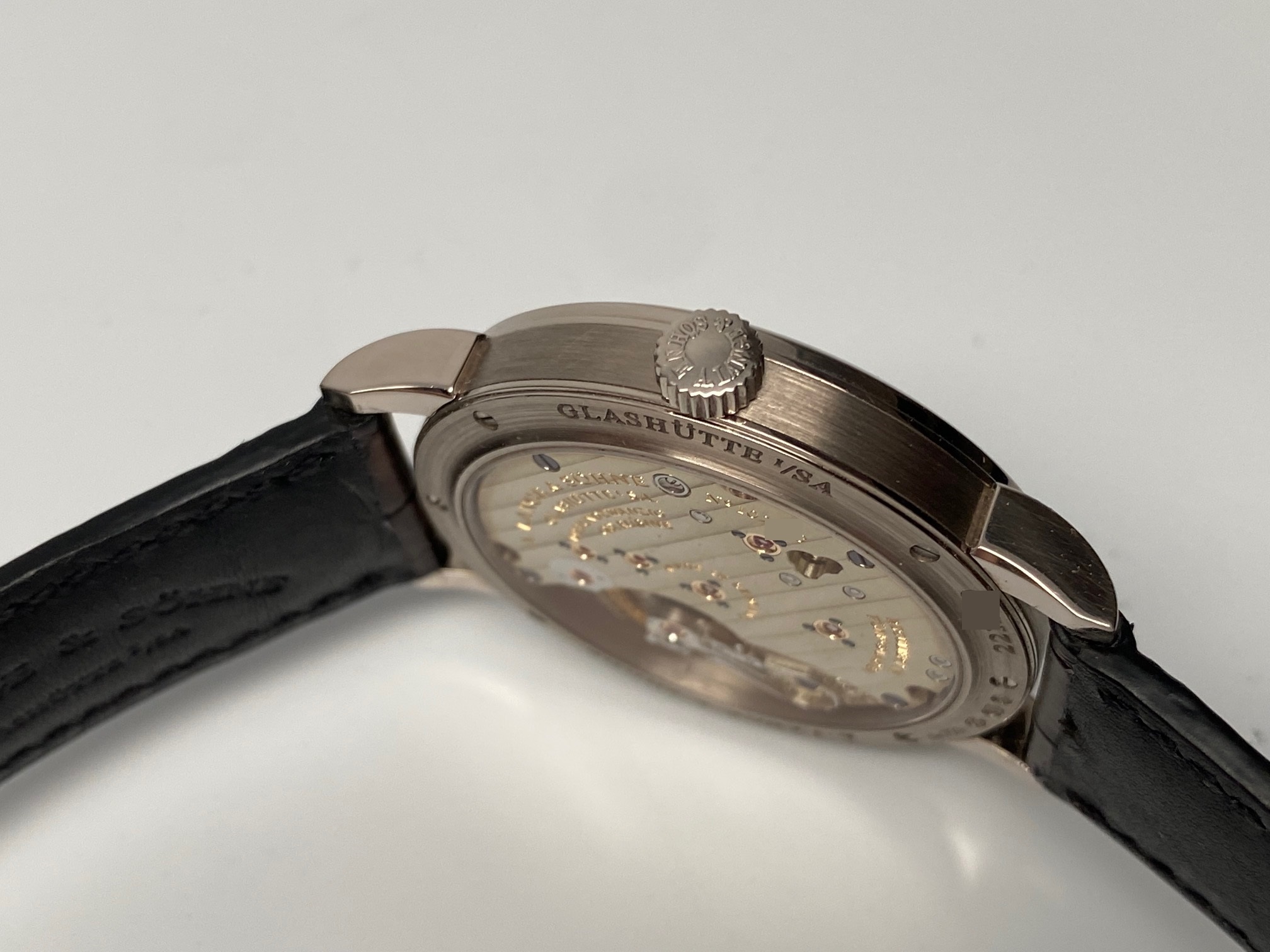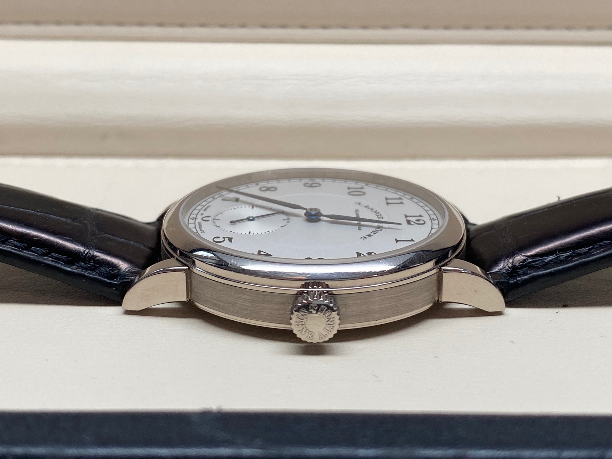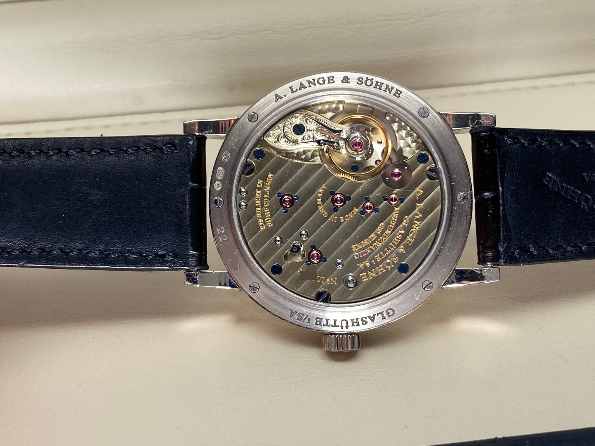 Inside is the A. Lange & Sohne Caliber L051.1, which beats at 21600 vph, is composed out of 188 parts, (contains 23 Jewels), and has an approximate power reserve of 55 hours. The movement 3/4 back plate is finely finished with striped/ribbed finish and polished beveled edges and the balance-cock is hand engraved making each watch unique. The movement has “stop seconds” for accurate time setting.