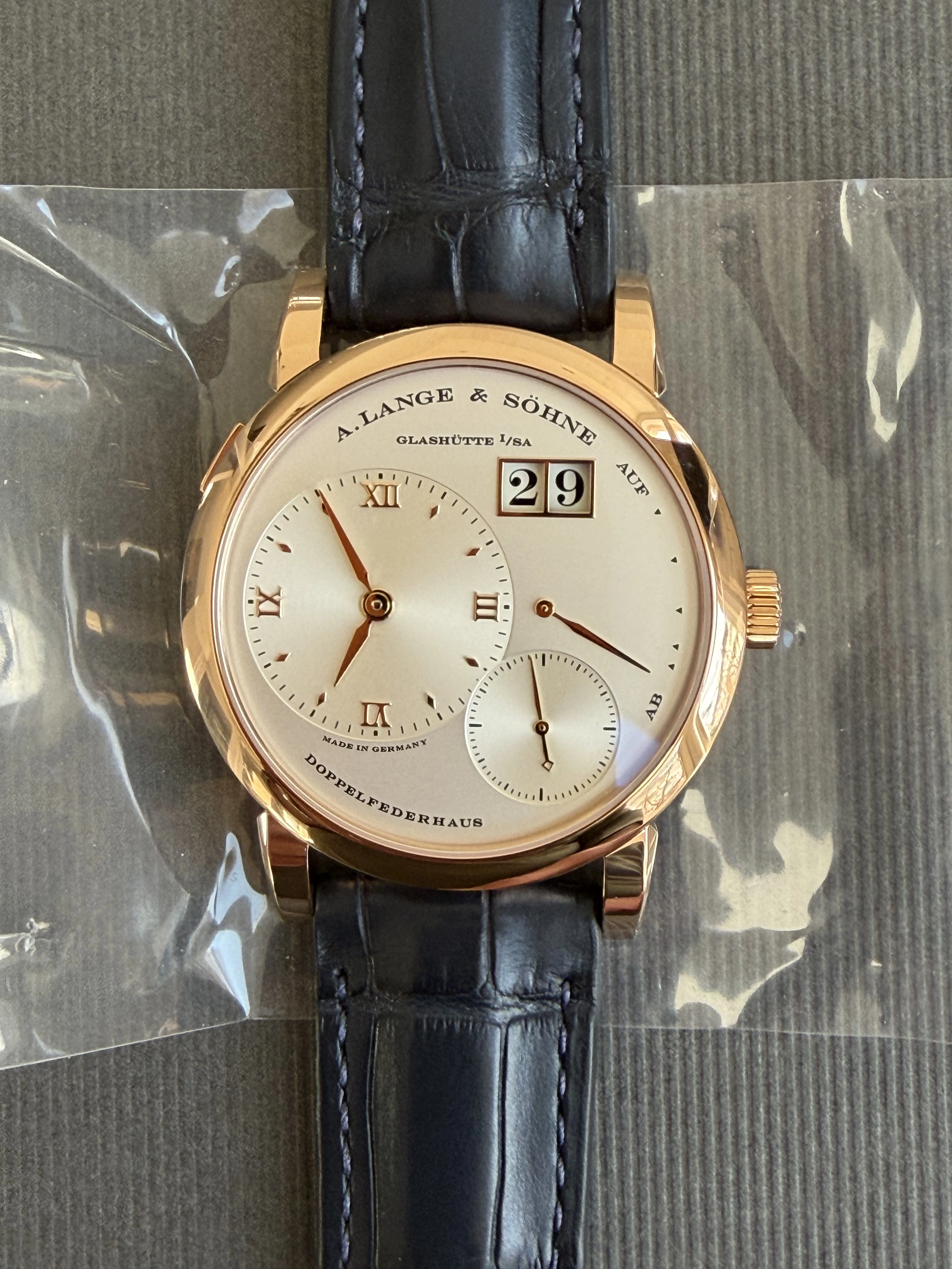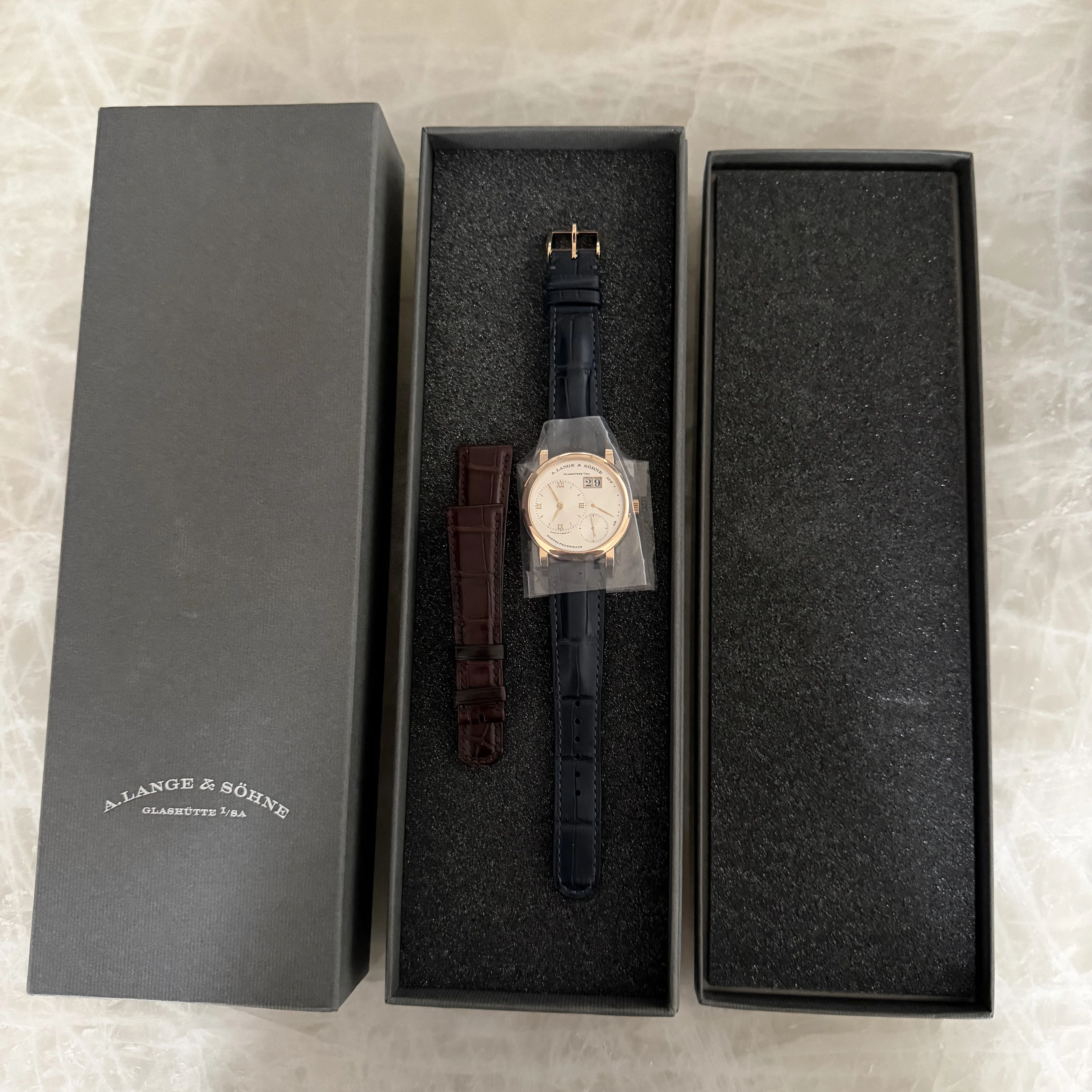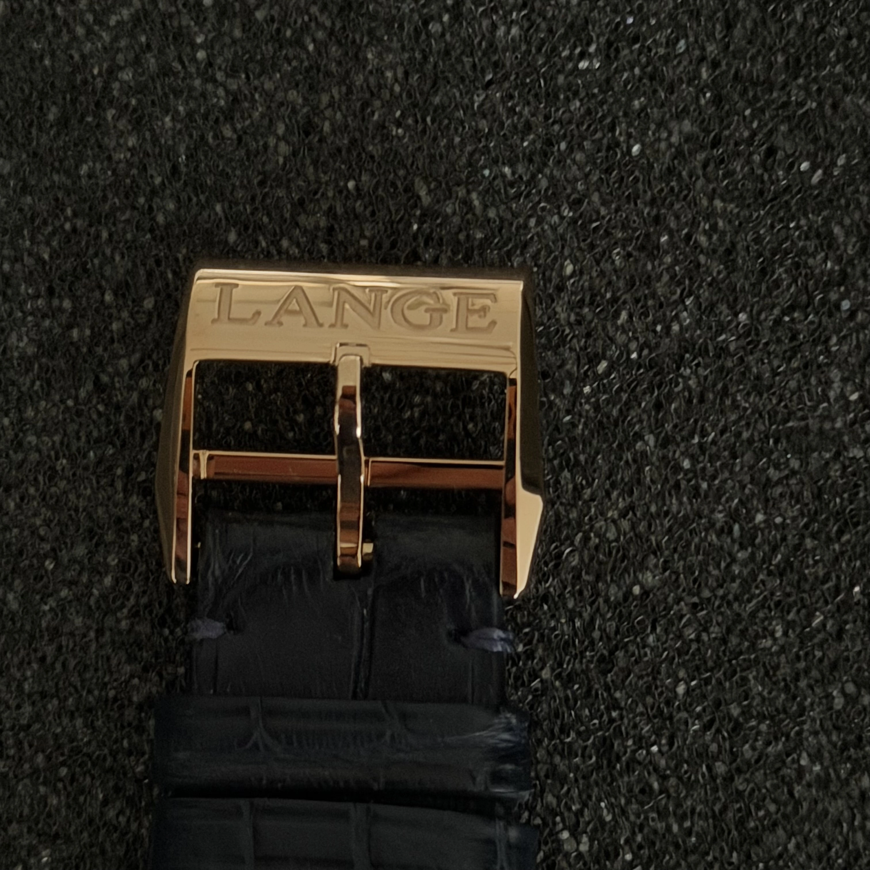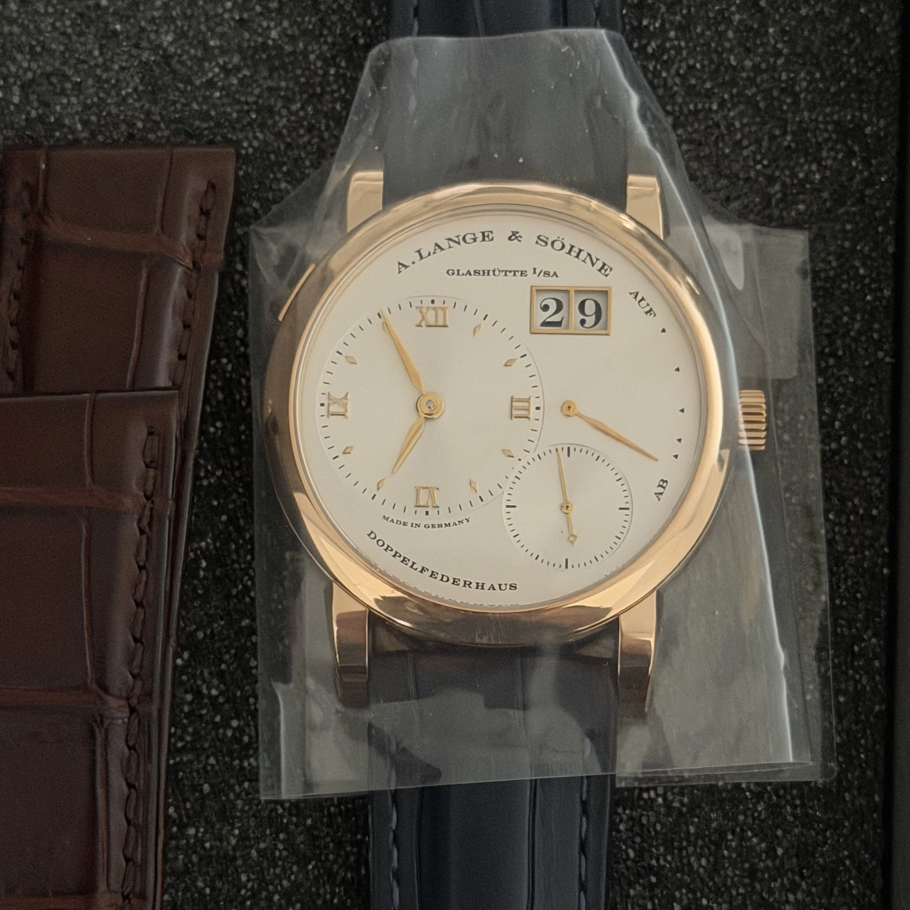 Includes the original Lange alligator strap, rose gold buckle and also a lightly worn Aaron Bespoke leather strap.