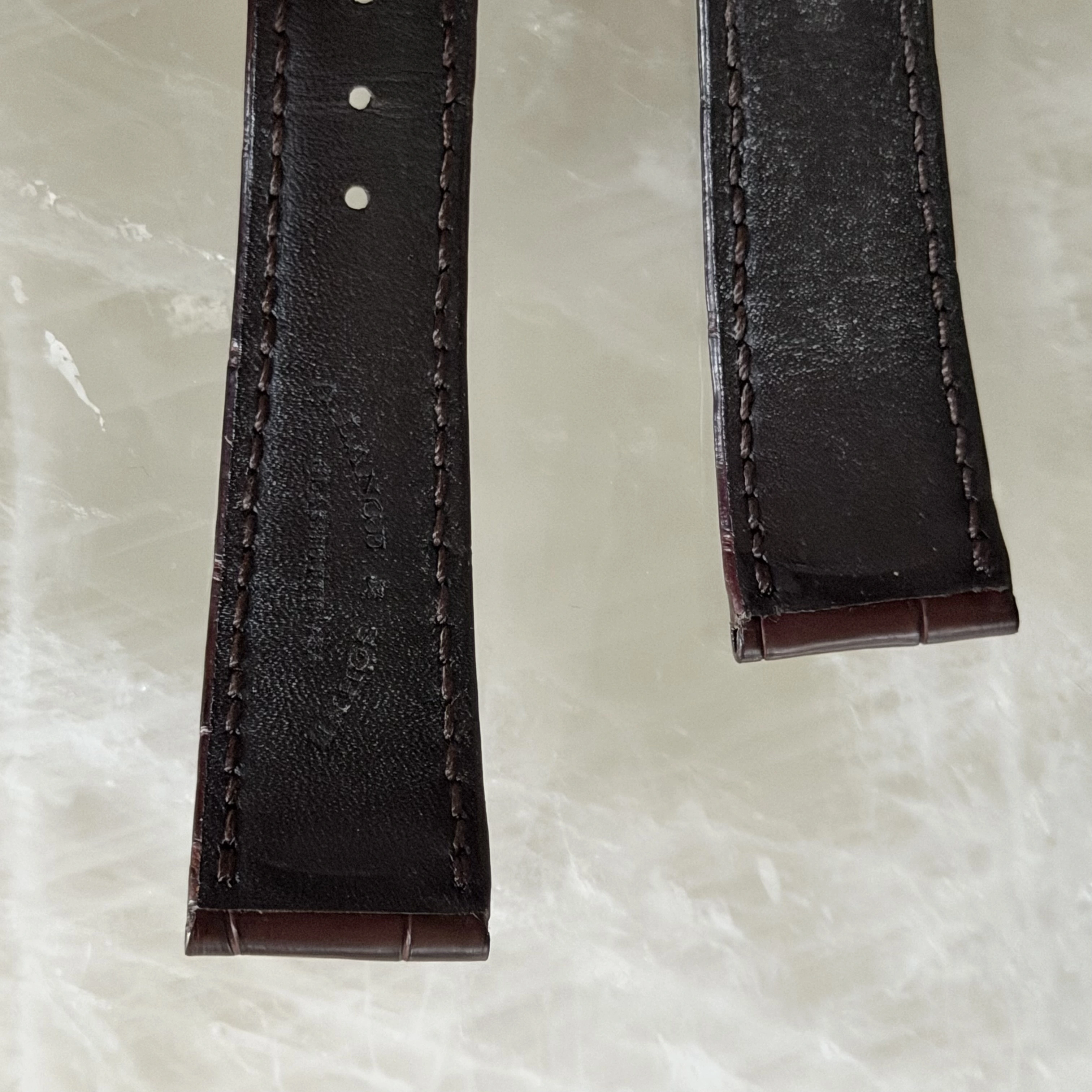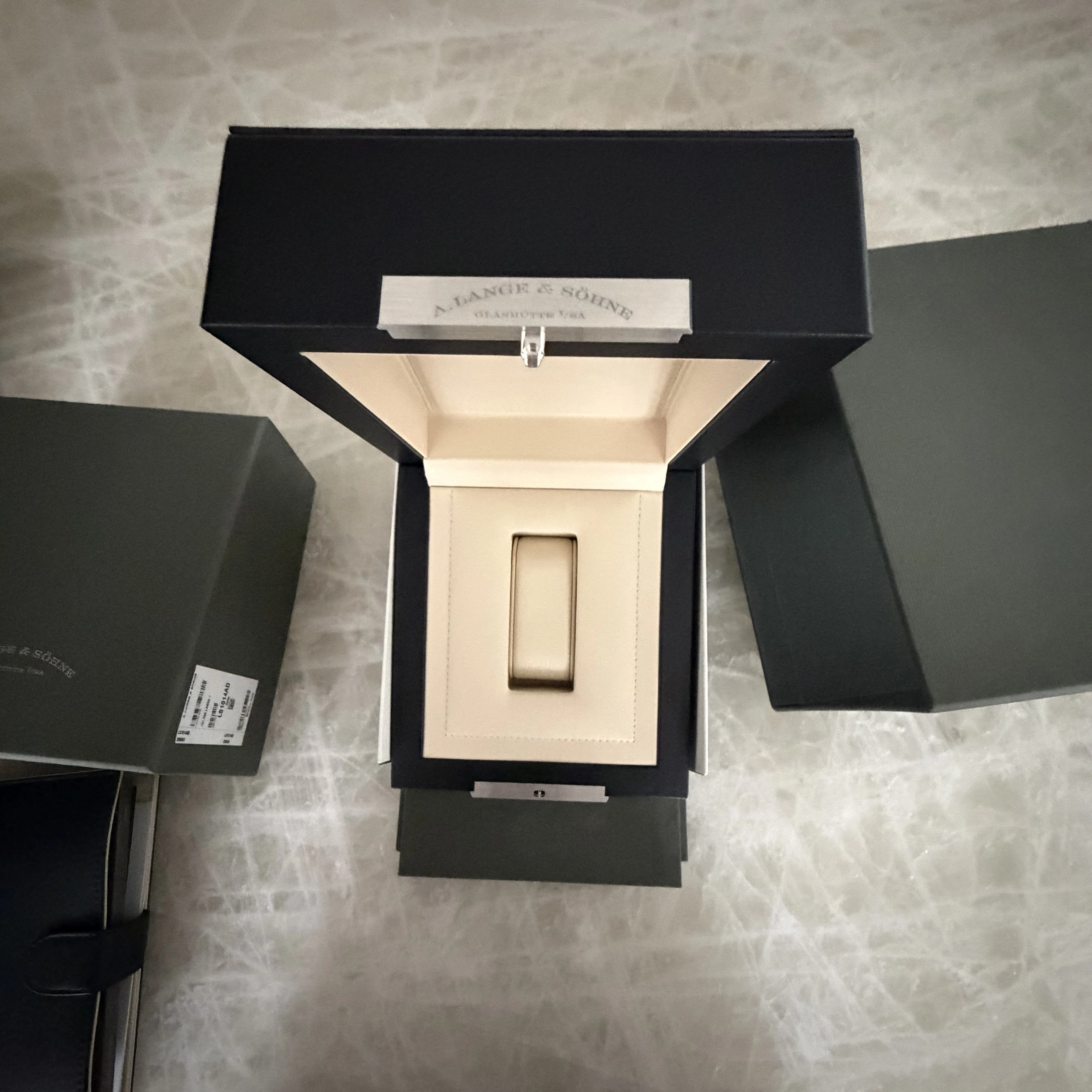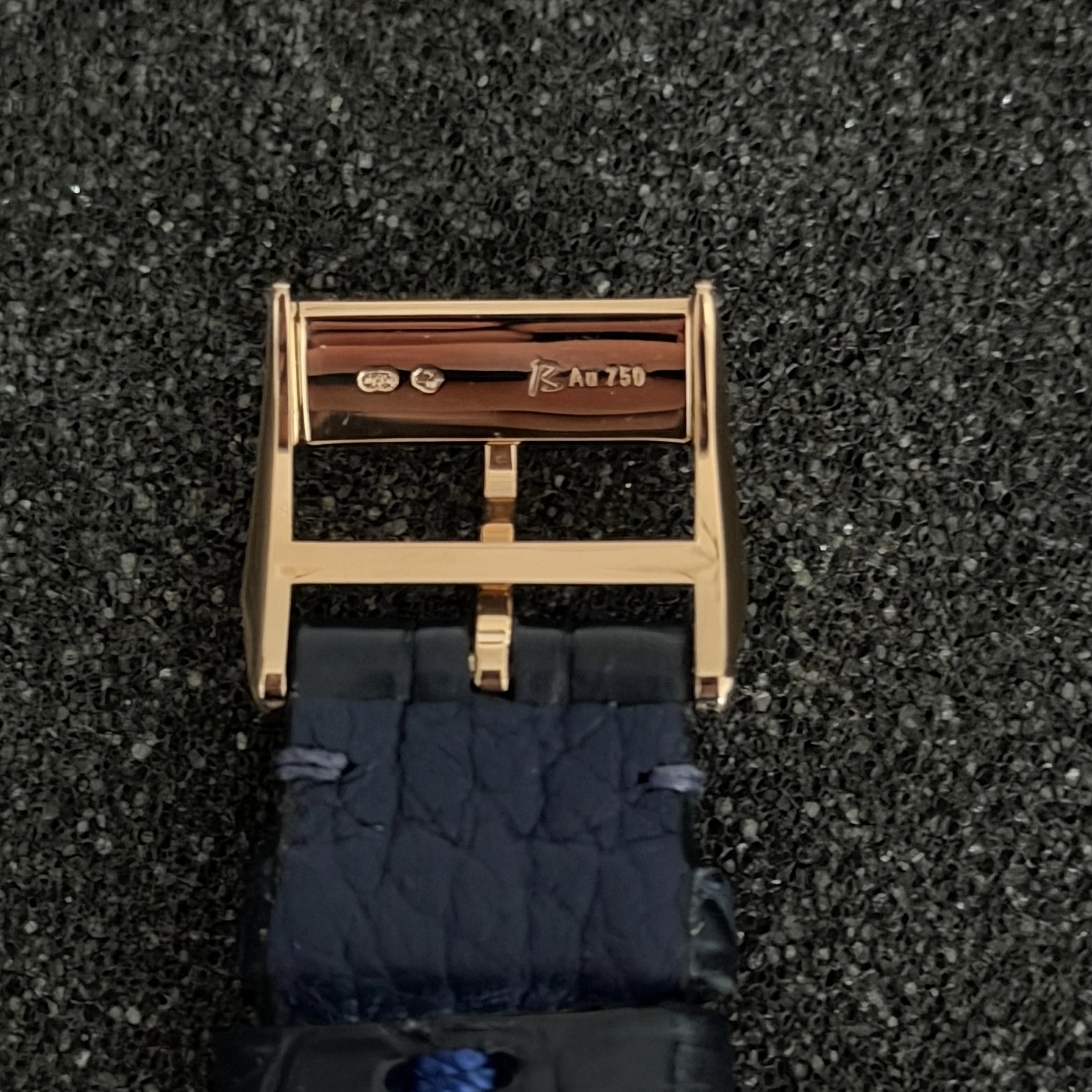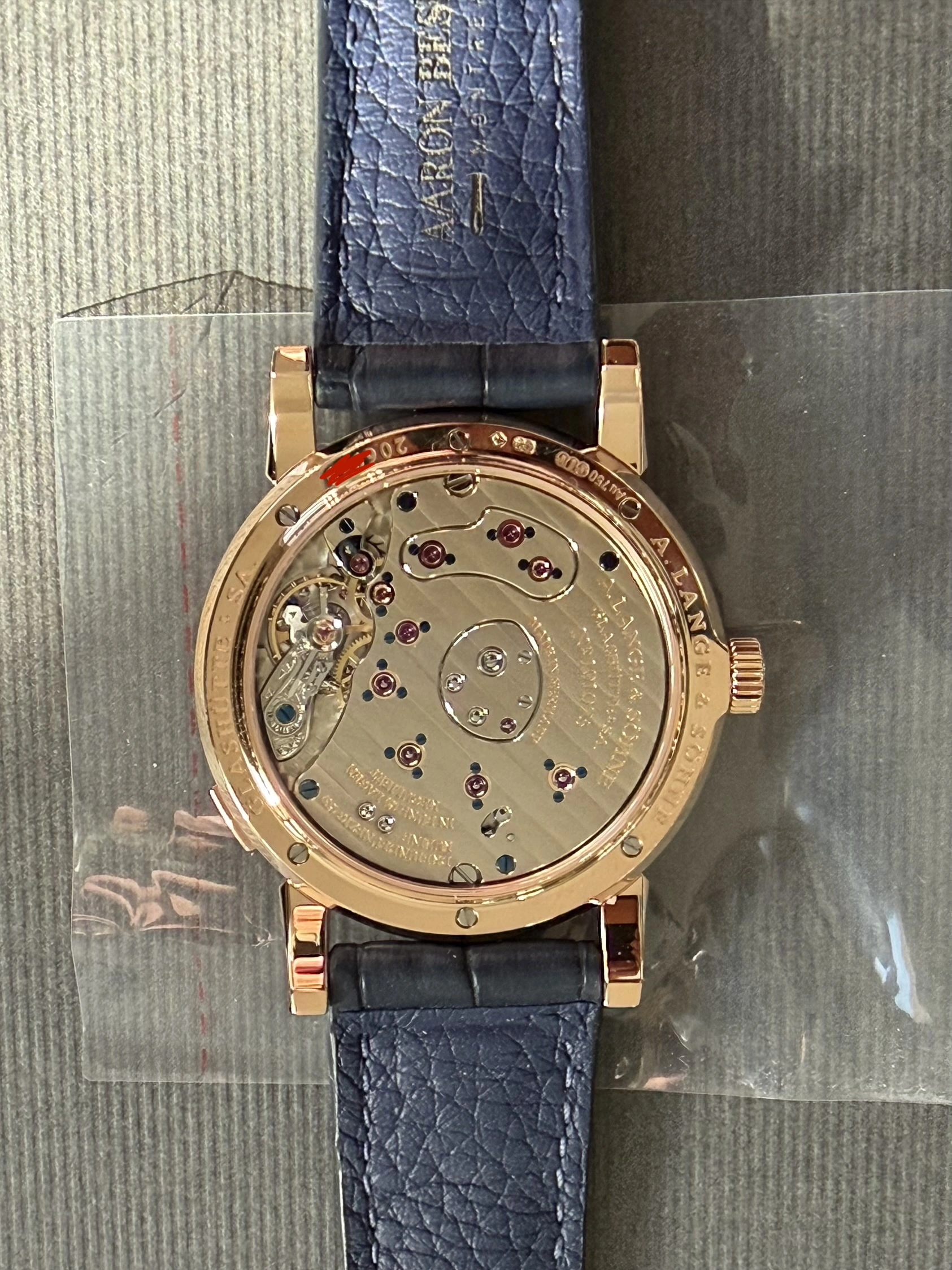 Includes the original Lange alligator strap, rose gold buckle and also a lightly worn Aaron Bespoke leather strap.