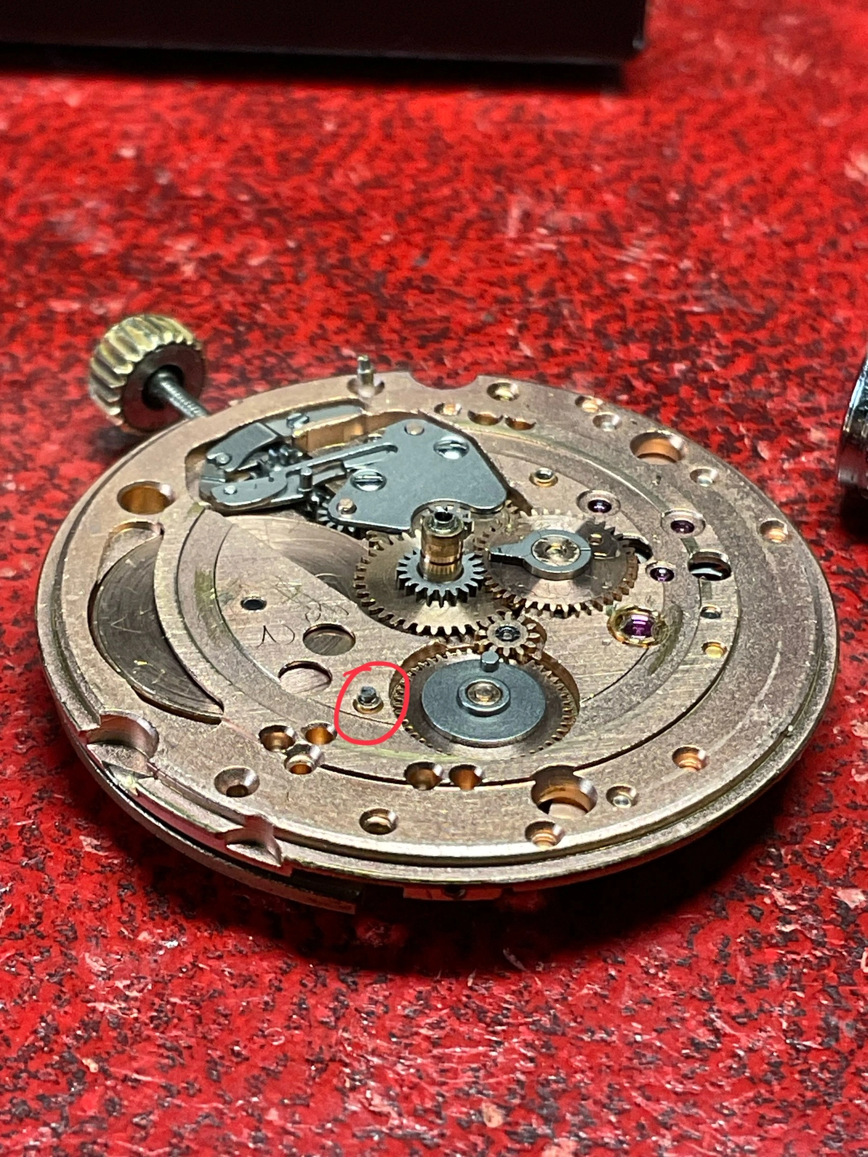 This snapped screw was causing slight lift on that cover putting pressure on the day wheel and then touching the back side of the dial causing it to get stuck.