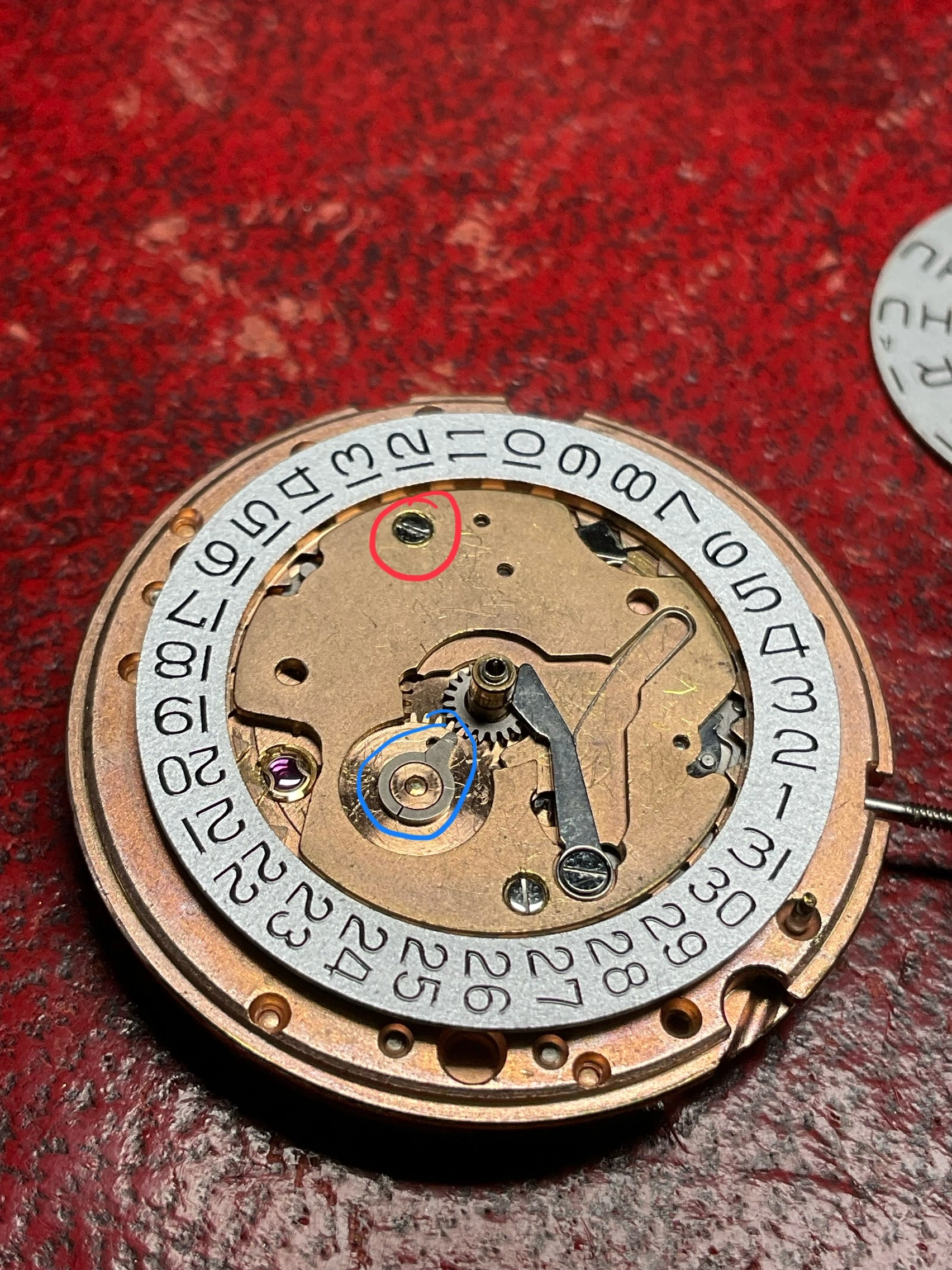 After finding a replacement screw and putting it back together with the dial off to test the operation of the day n date wheels and flicking over at 12pm the day was miles out to the date and wasn’t flicking over at the same time after a little research there is a little hand this gear that turns (circled in blue ) this is what flicks over at 12 it’s quite tight and took a little trial and error turning it backwards and forwards to get it to align with the date but got it bang on and they now both flick over at 12 on the dot.
