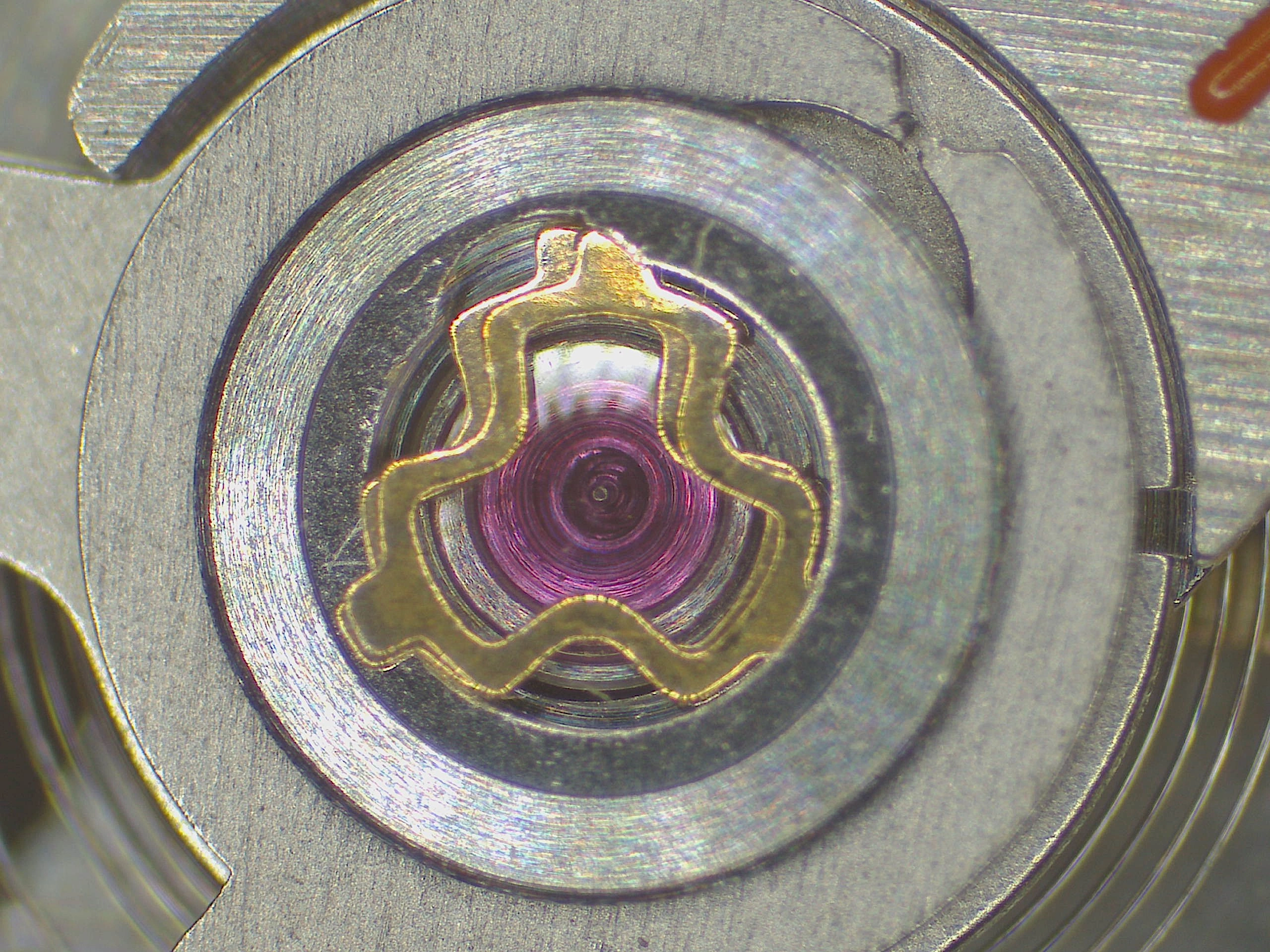 Picked up the lonely shock spring with tweezers and gently placed it on the jewel setting and then put the movement under the microscope to install the spring.