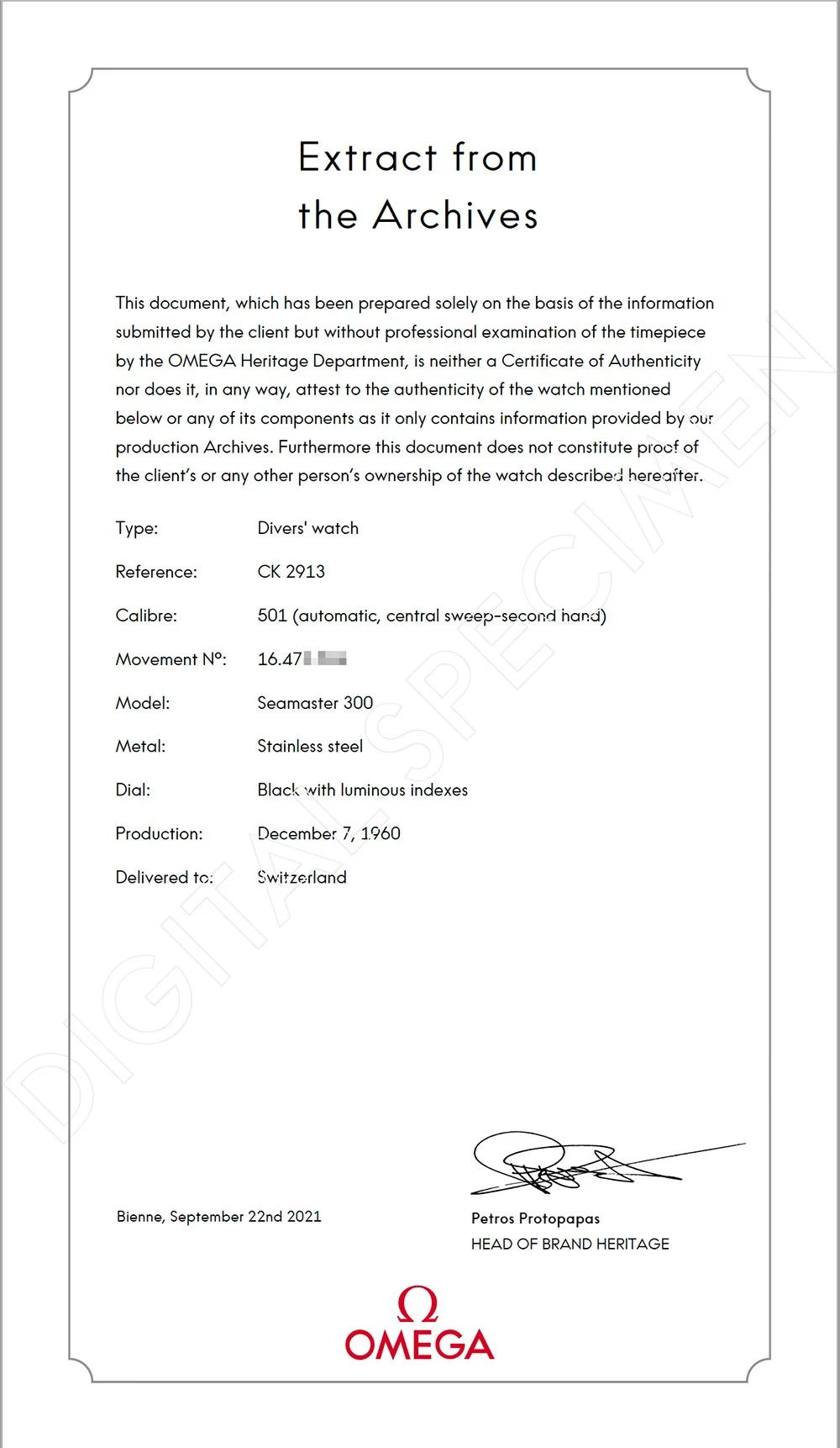 Accessories: Omega Extract Of The Archives. December 7 1960 Production date. Originally sold in Switzerland.