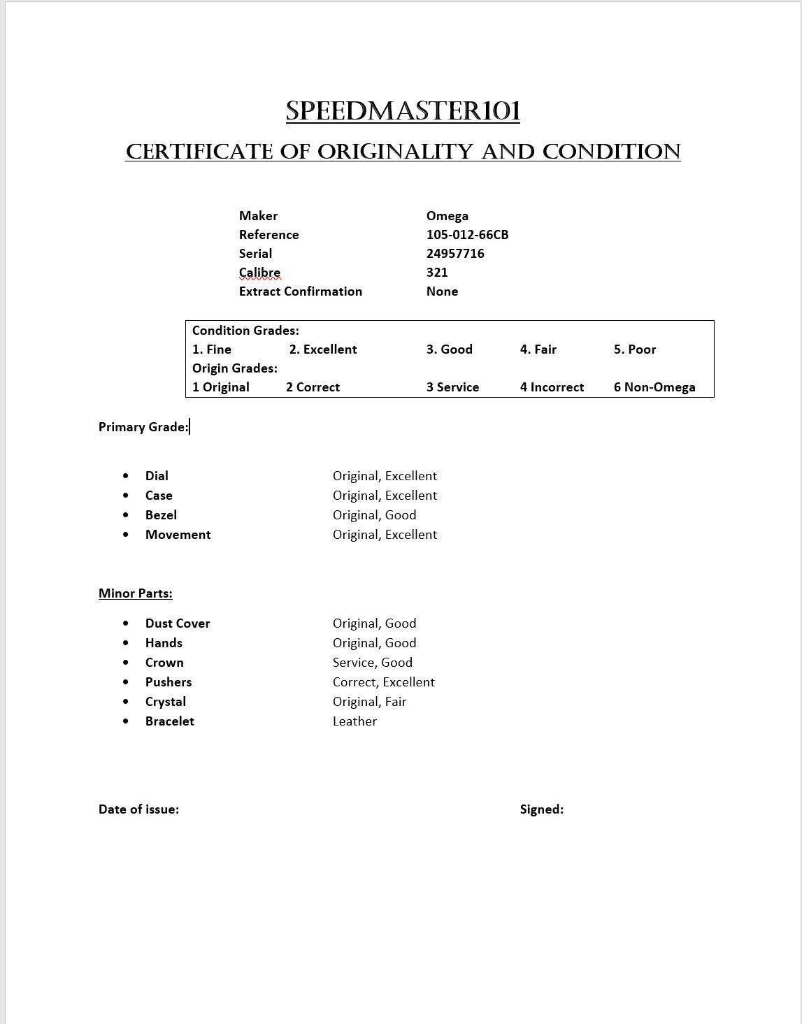 Note that the Extra Score is not necessarily > 0: it can be negative (for example in the event of a missing accessory, like box & papers for a modern watch). The Extra Score range is [-5;+5] - but we would probably not advertise or provide a report for a watch deserving a -5 score, meaning a very critical issue.