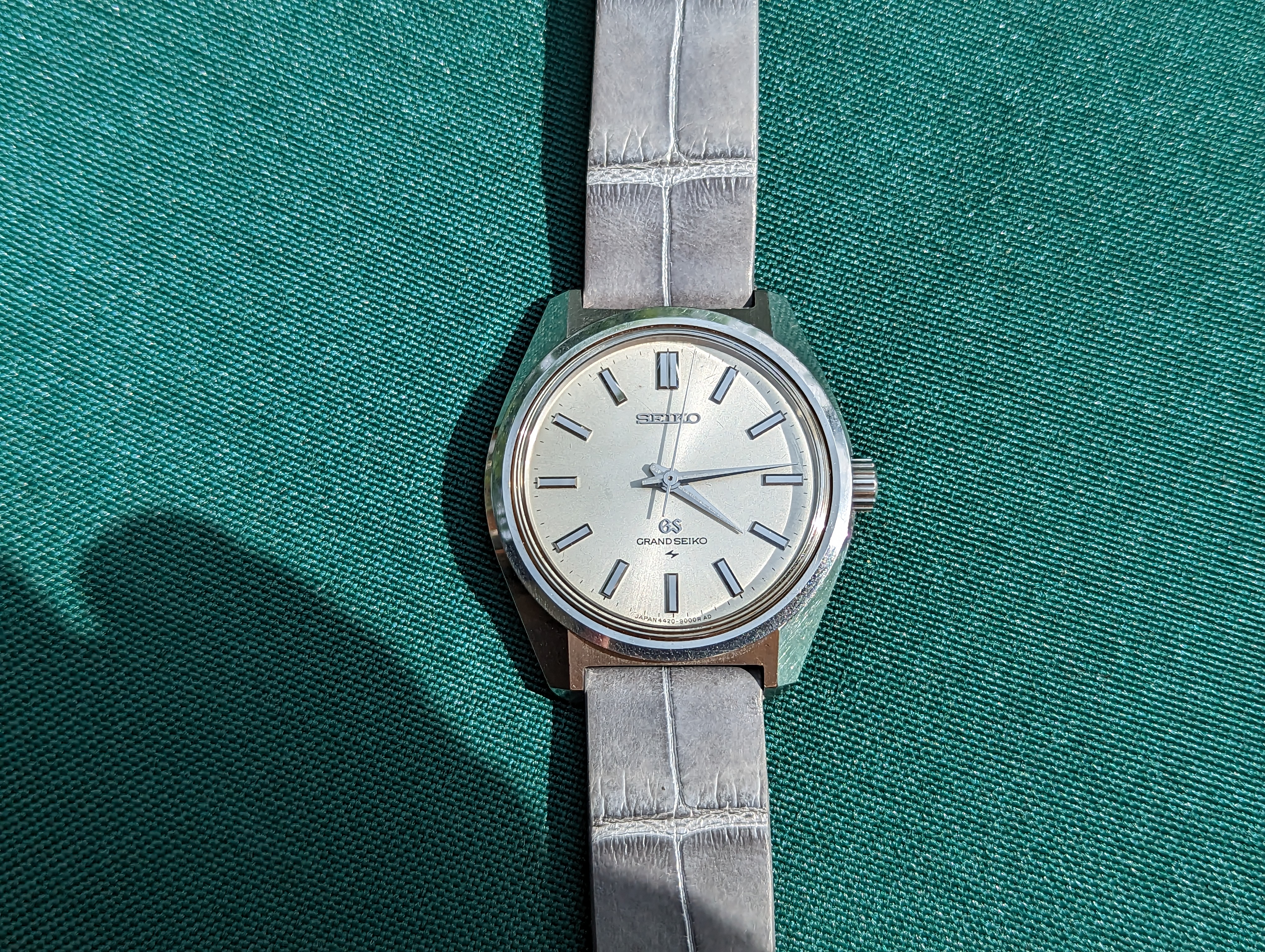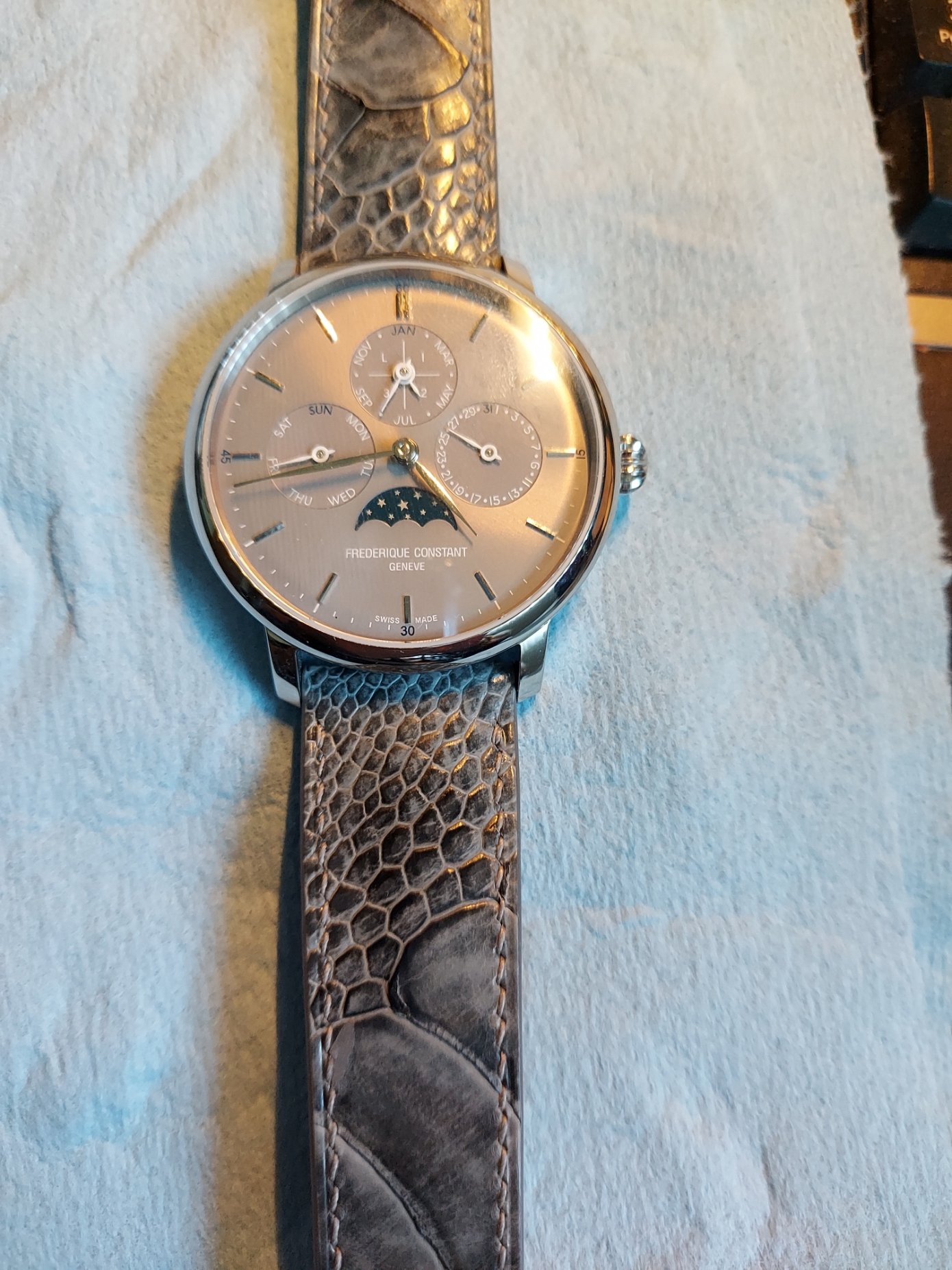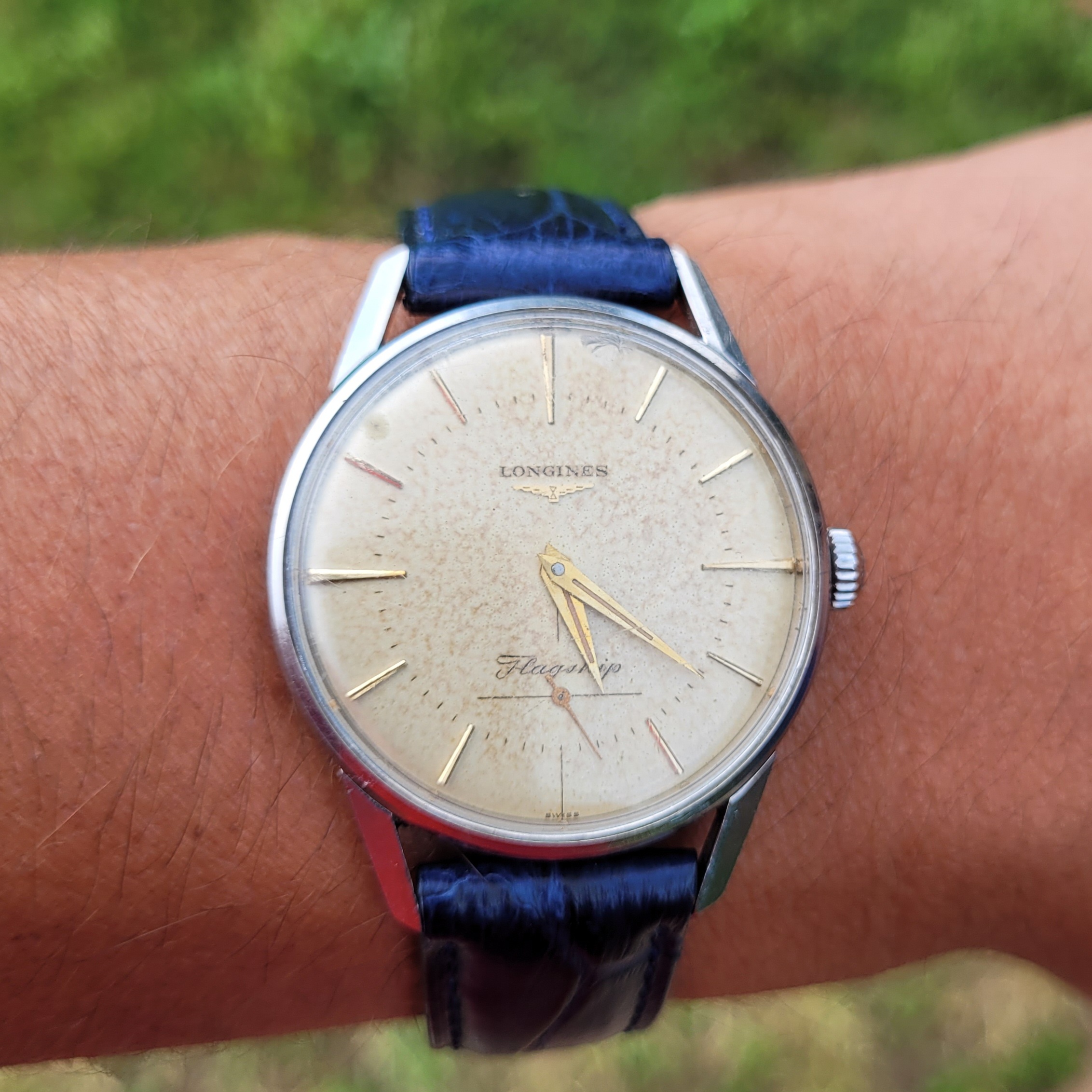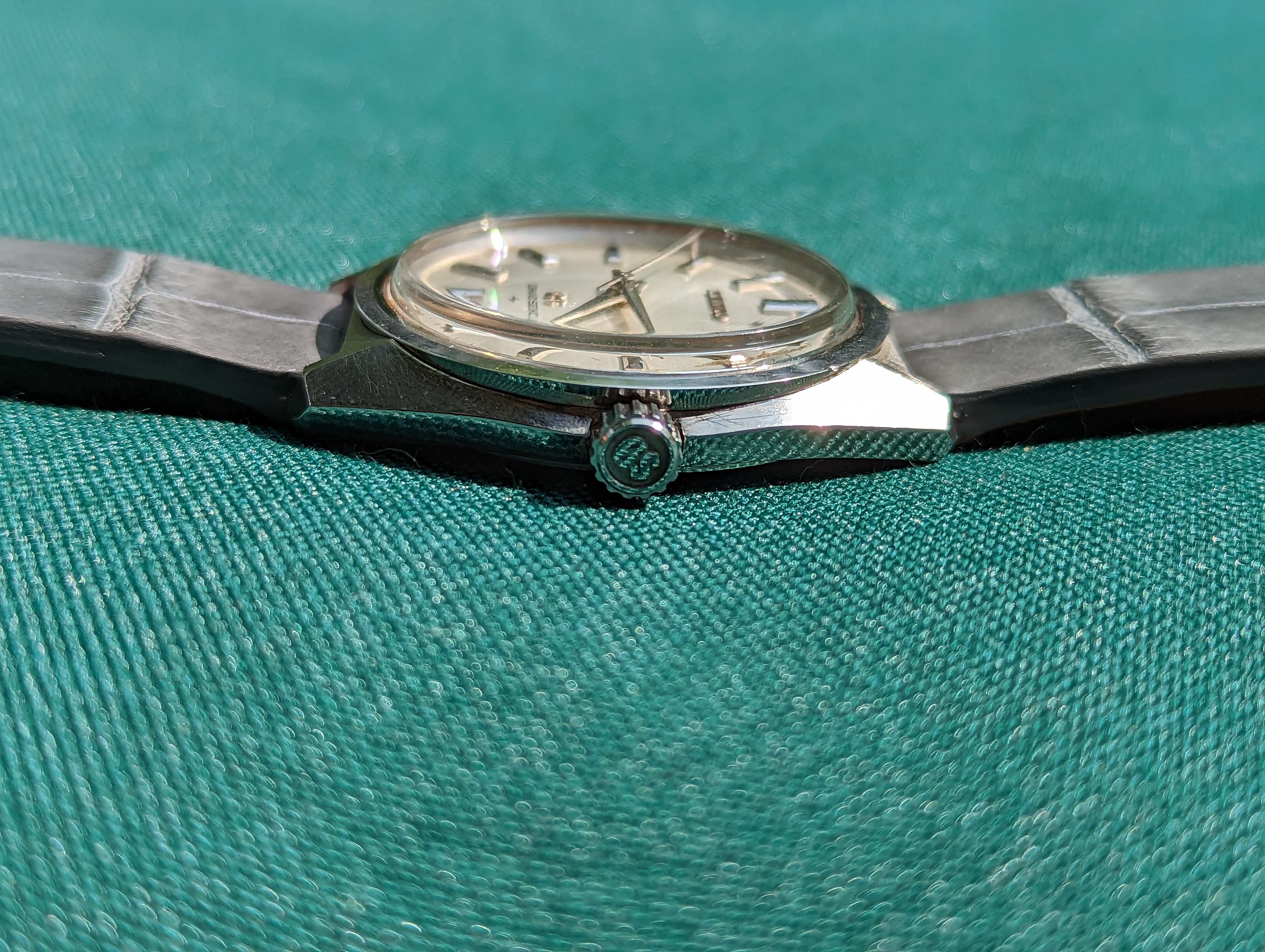 Leather IS correct for chronographs, but smooth, untextured leather always looks boring. The color is wrong too. There's no brown on the watch, so there should be no brown in the strap.