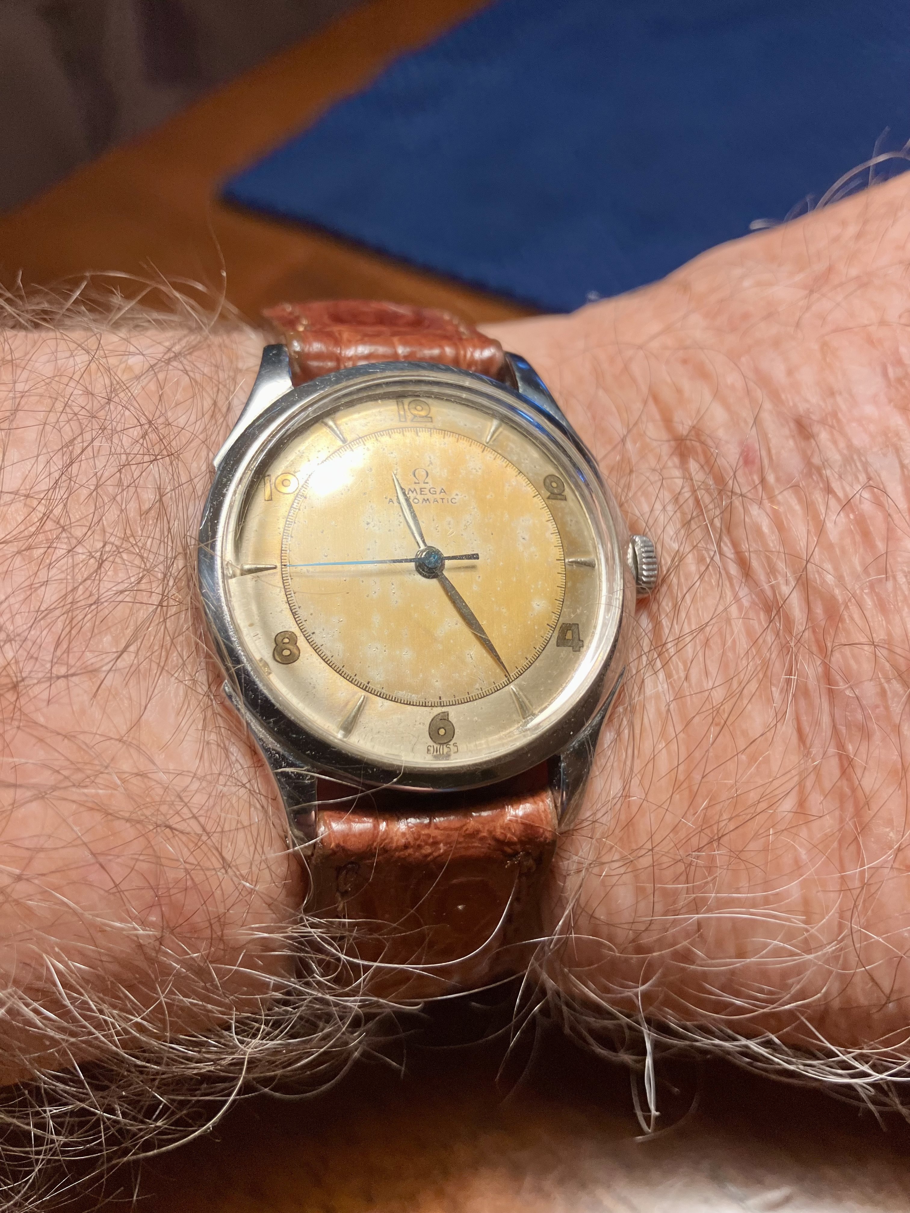 I completely agree it calls for a flat strap with stitching the same color of the leather, I would also like burgundy or dark brown with burgundy undertones, but for me the perfect strap for this would be a matte croc with large scales, which is more casual and subdued than traditional shiny croc,
