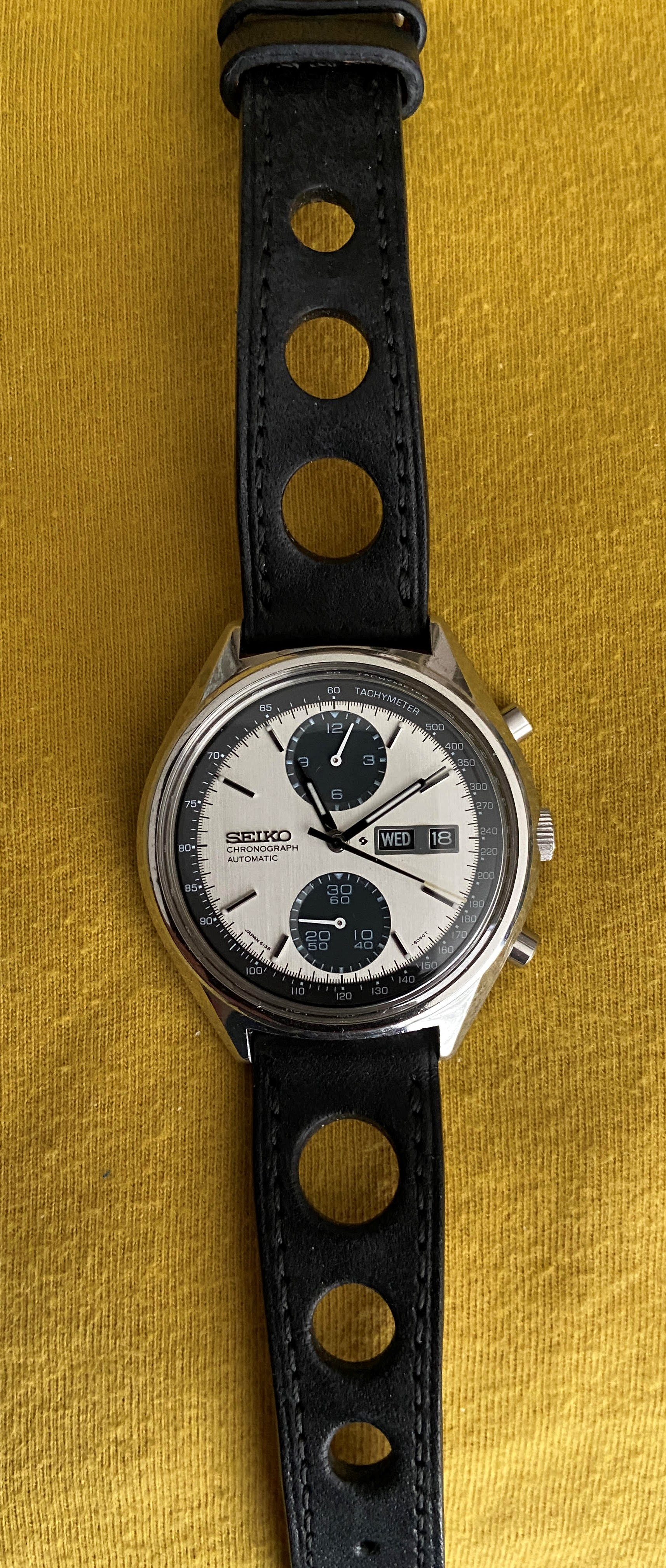 Chronograph on strap with very large perforations.
