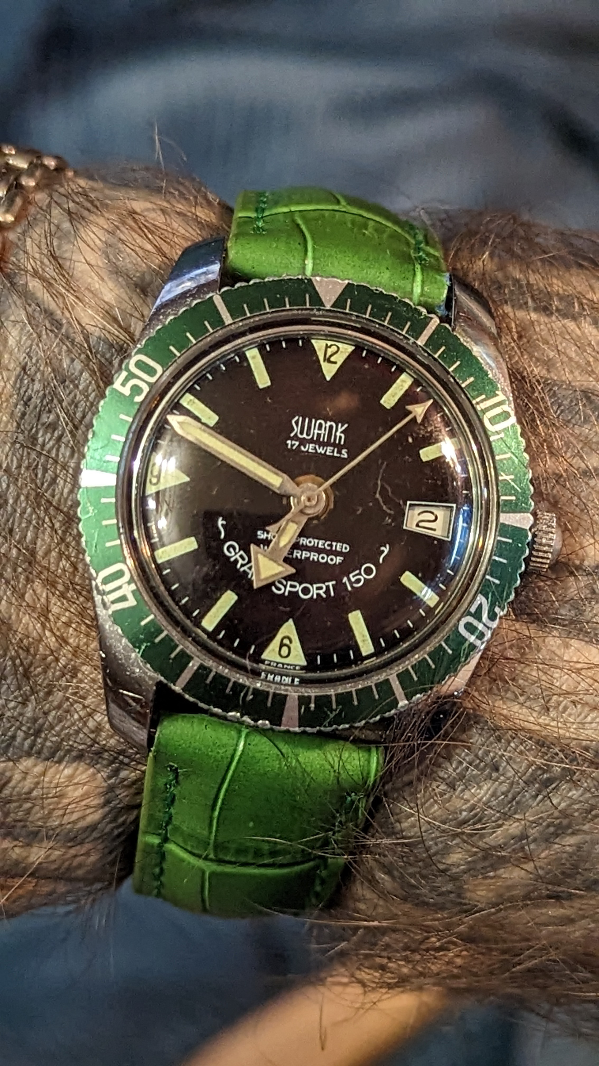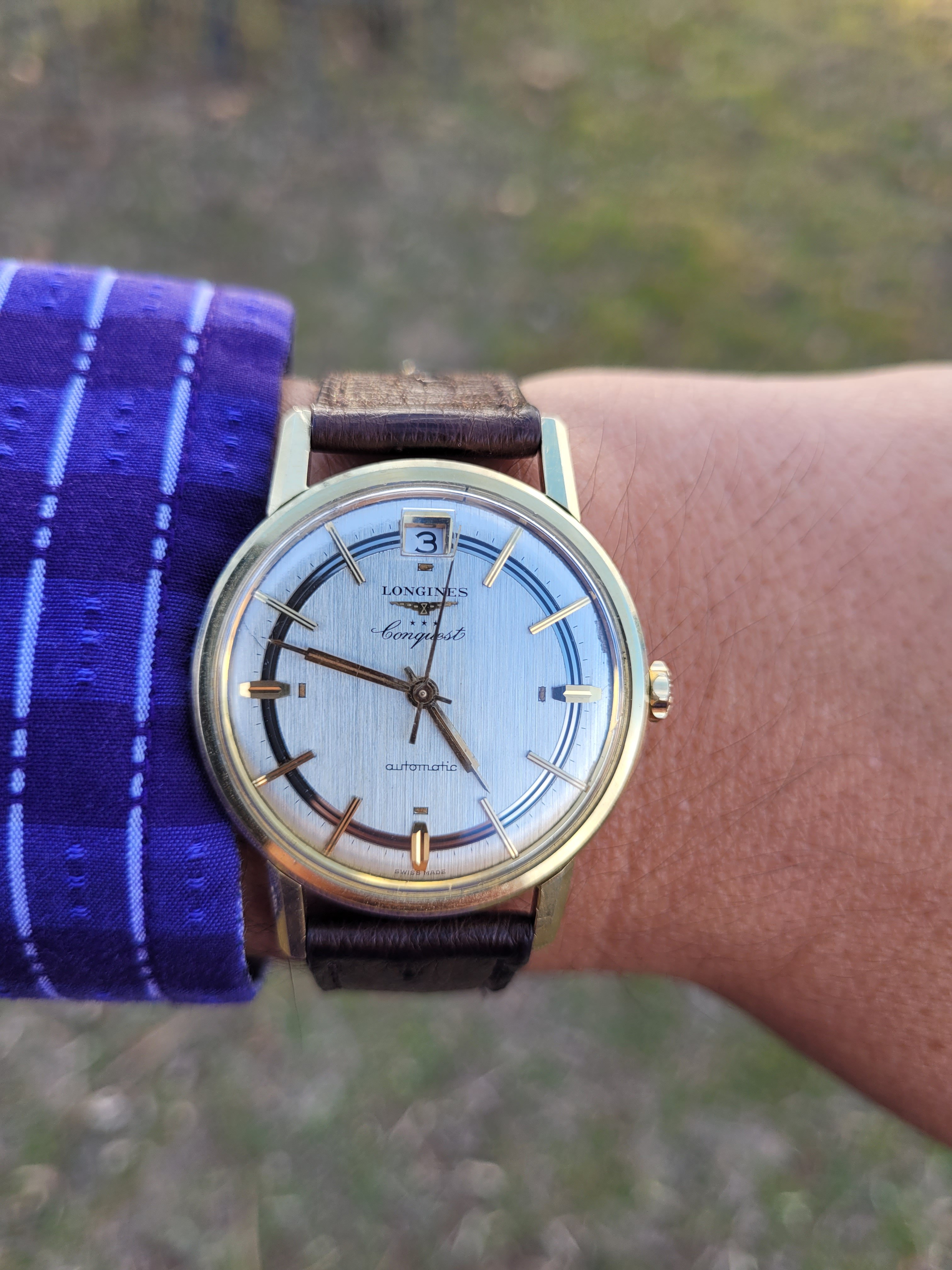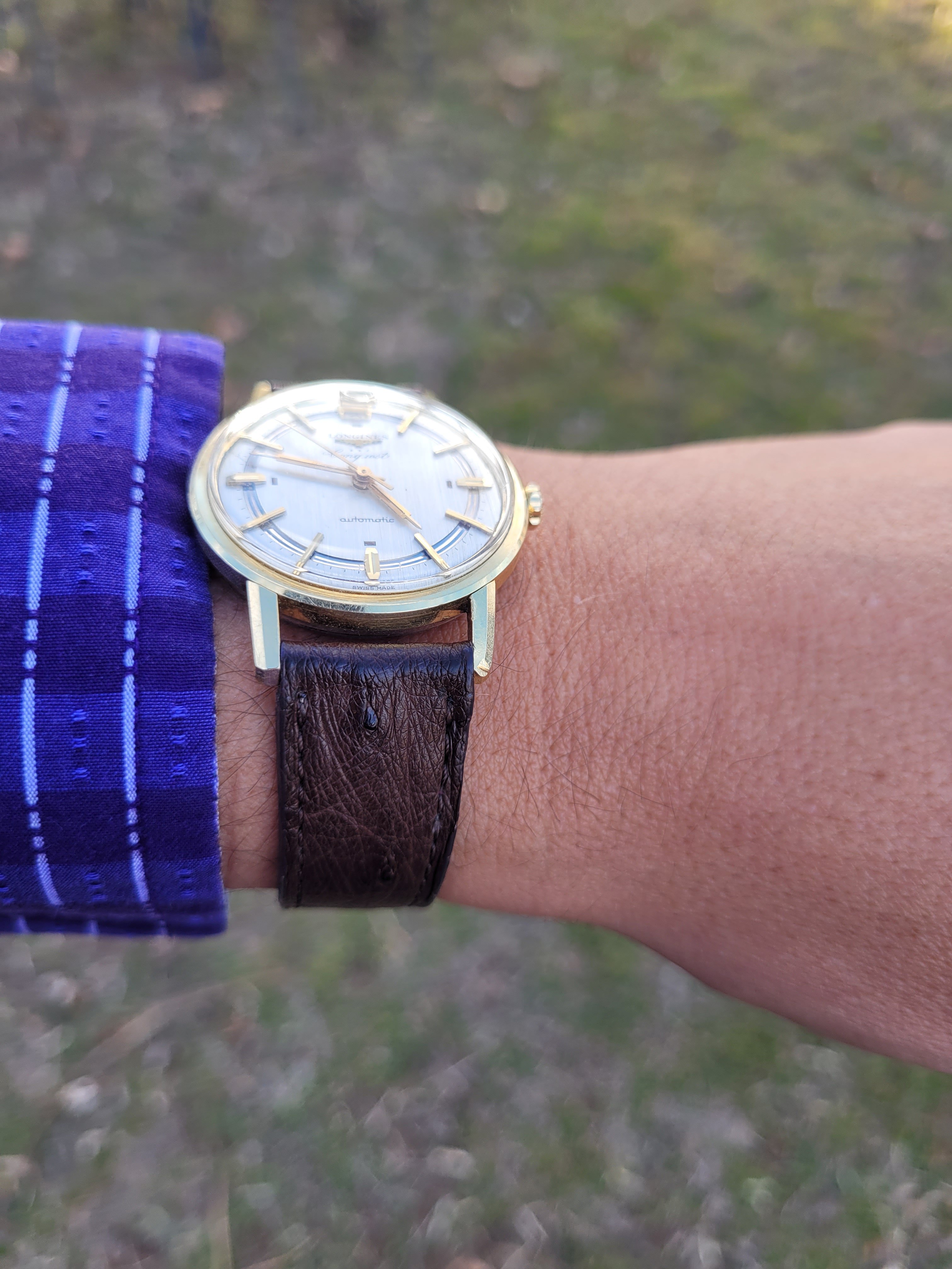 I shall submit to being graded on today's watch. 1960 Longines Conquest on a tobacco ostrich strap.