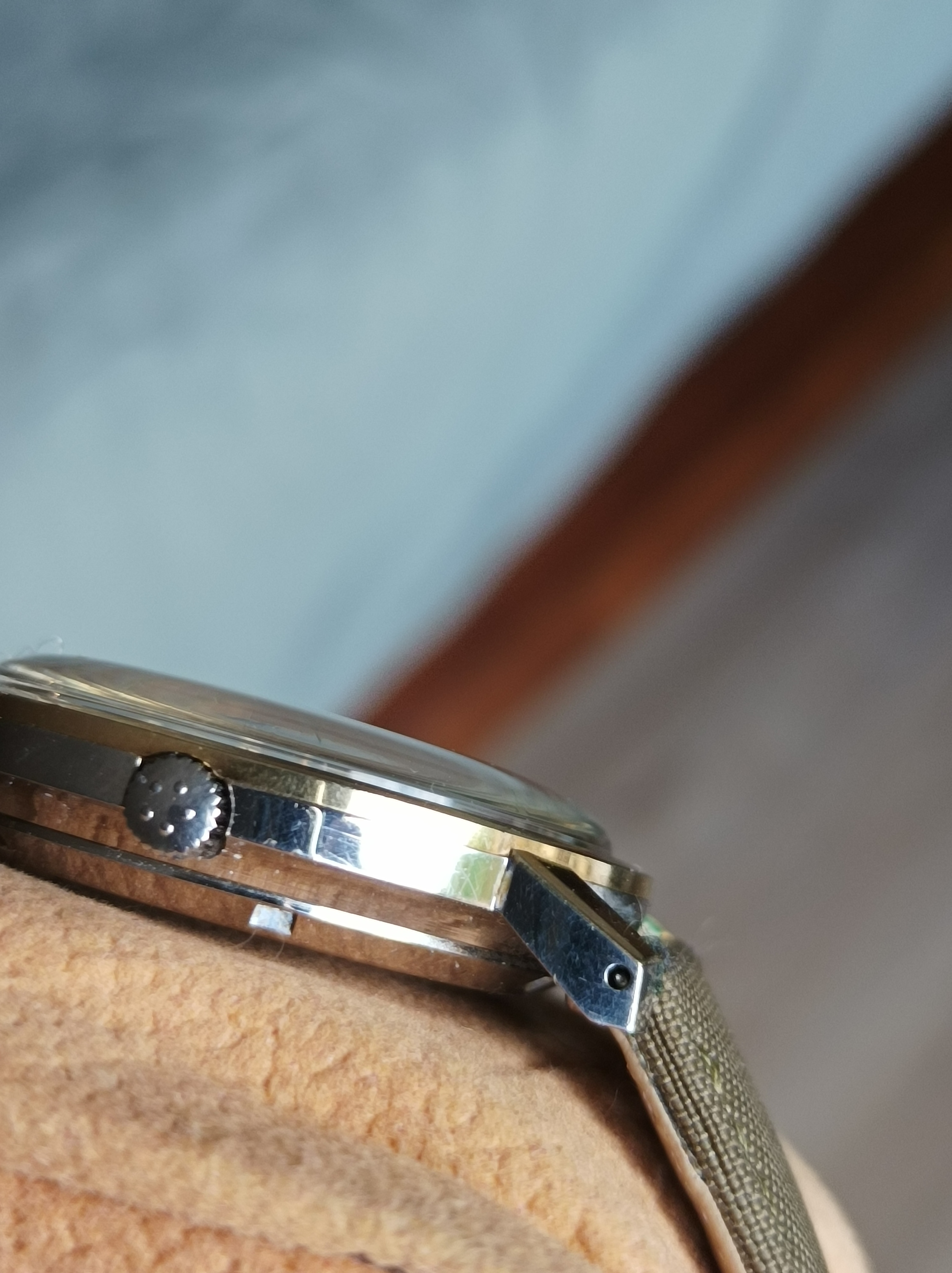 It's gold-capped, but quite different than an Omega gold-capped case in that steel is entirely visible from the side. In other gold-capped cases, the gold wraps around the sides of the lugs and mid-case and steel is only seen from below.