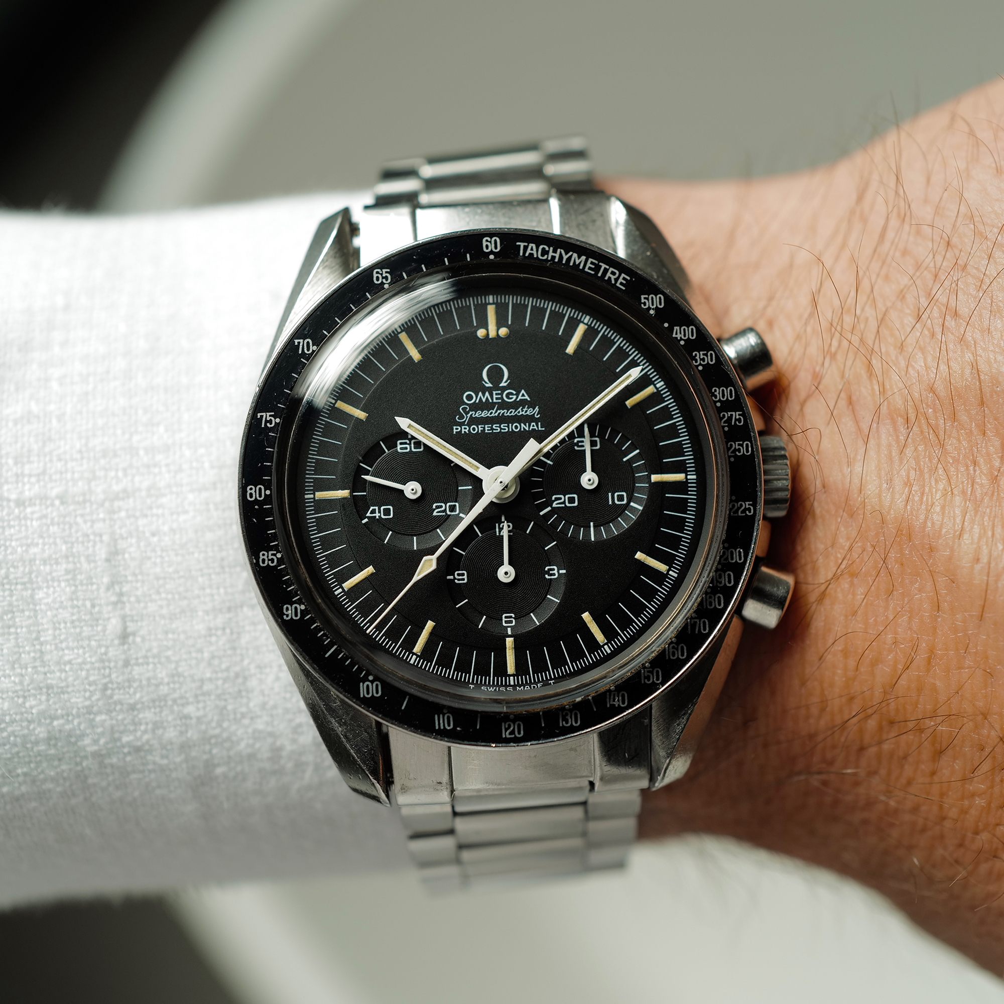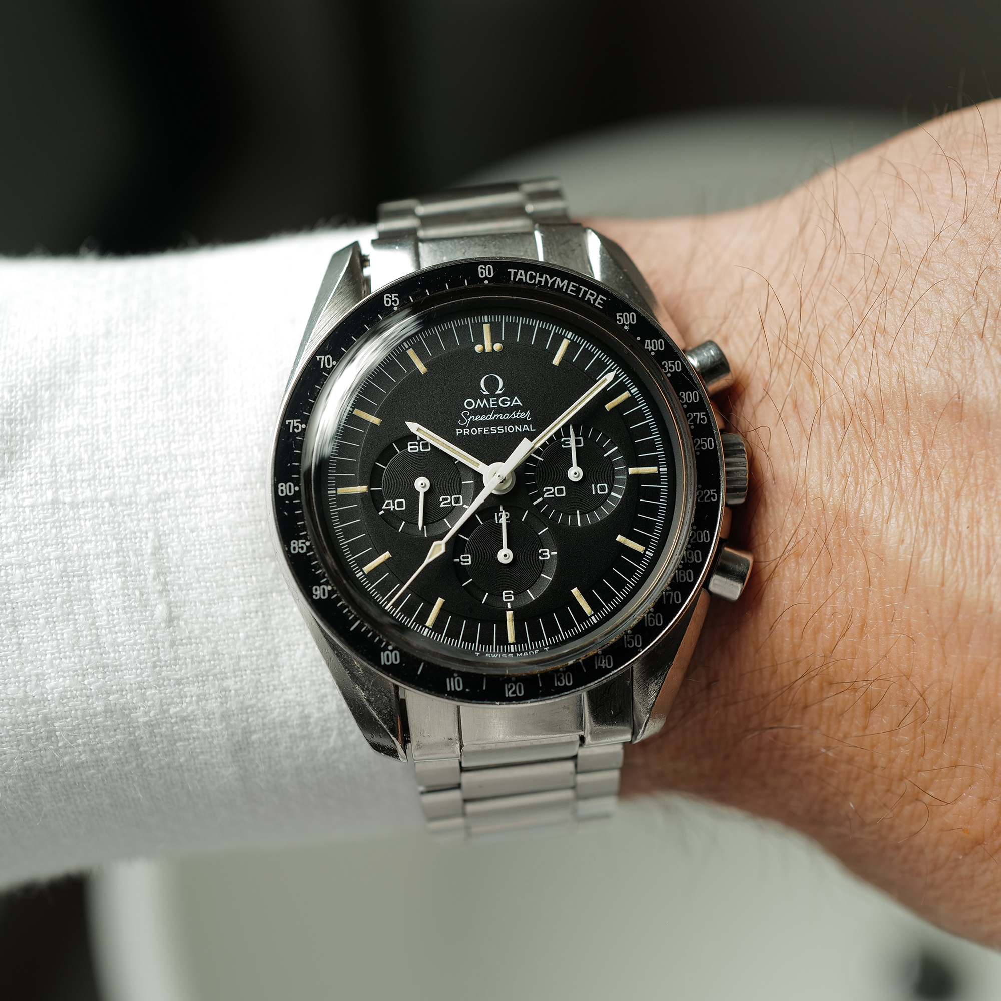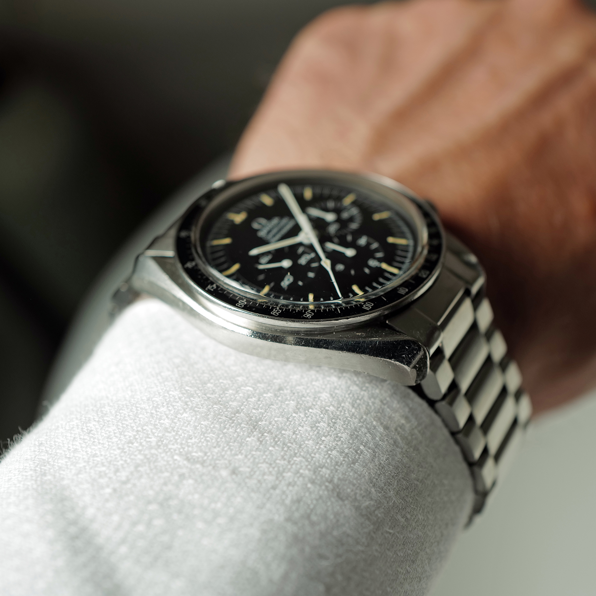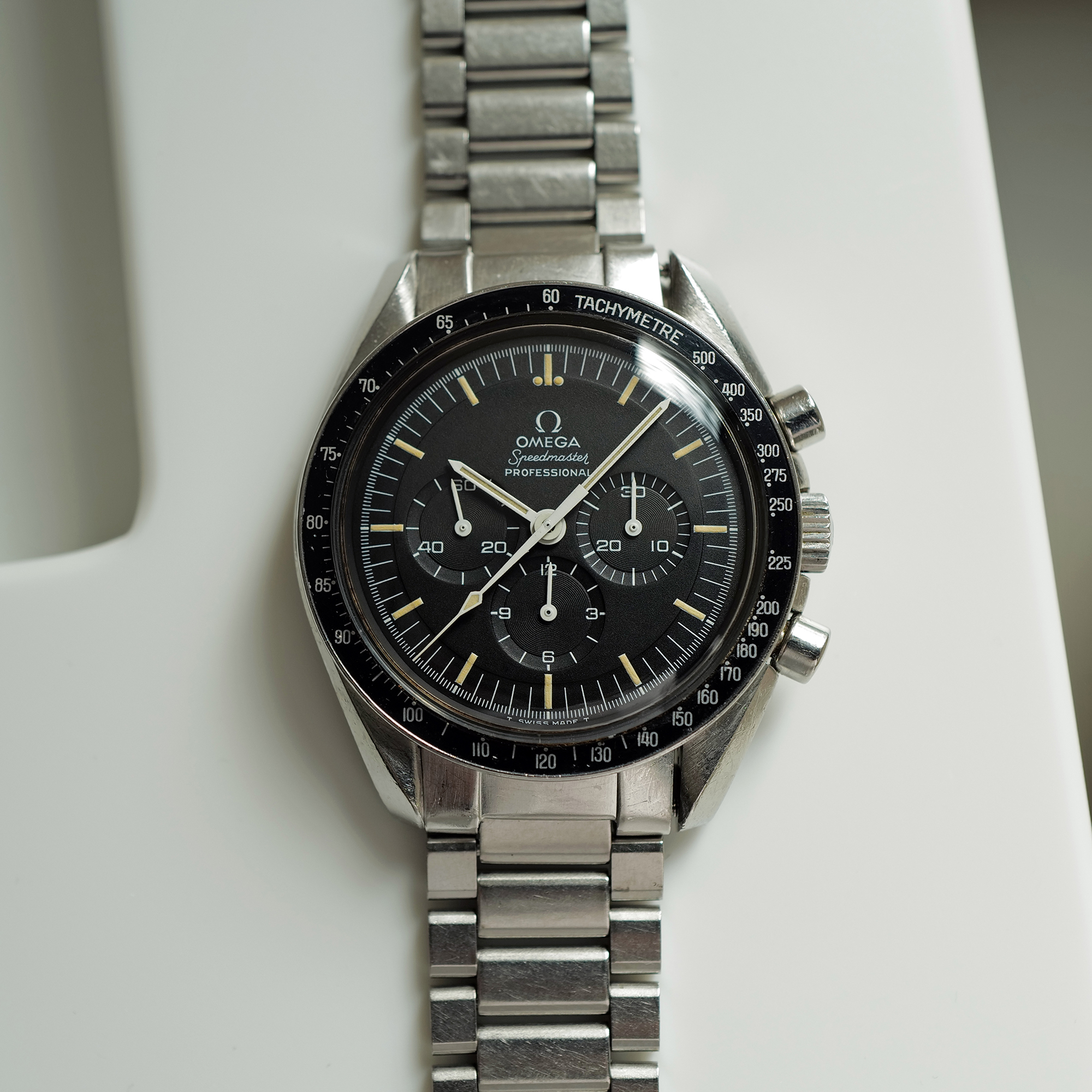 Hands: Original Tritium hands in excellent shape and match the dial perfectly. Non of the 6 hands show any evidence of ever being removed (tool pressure marks or chipped white paint which is typical on Speedmasters that have been disassembled at some point)