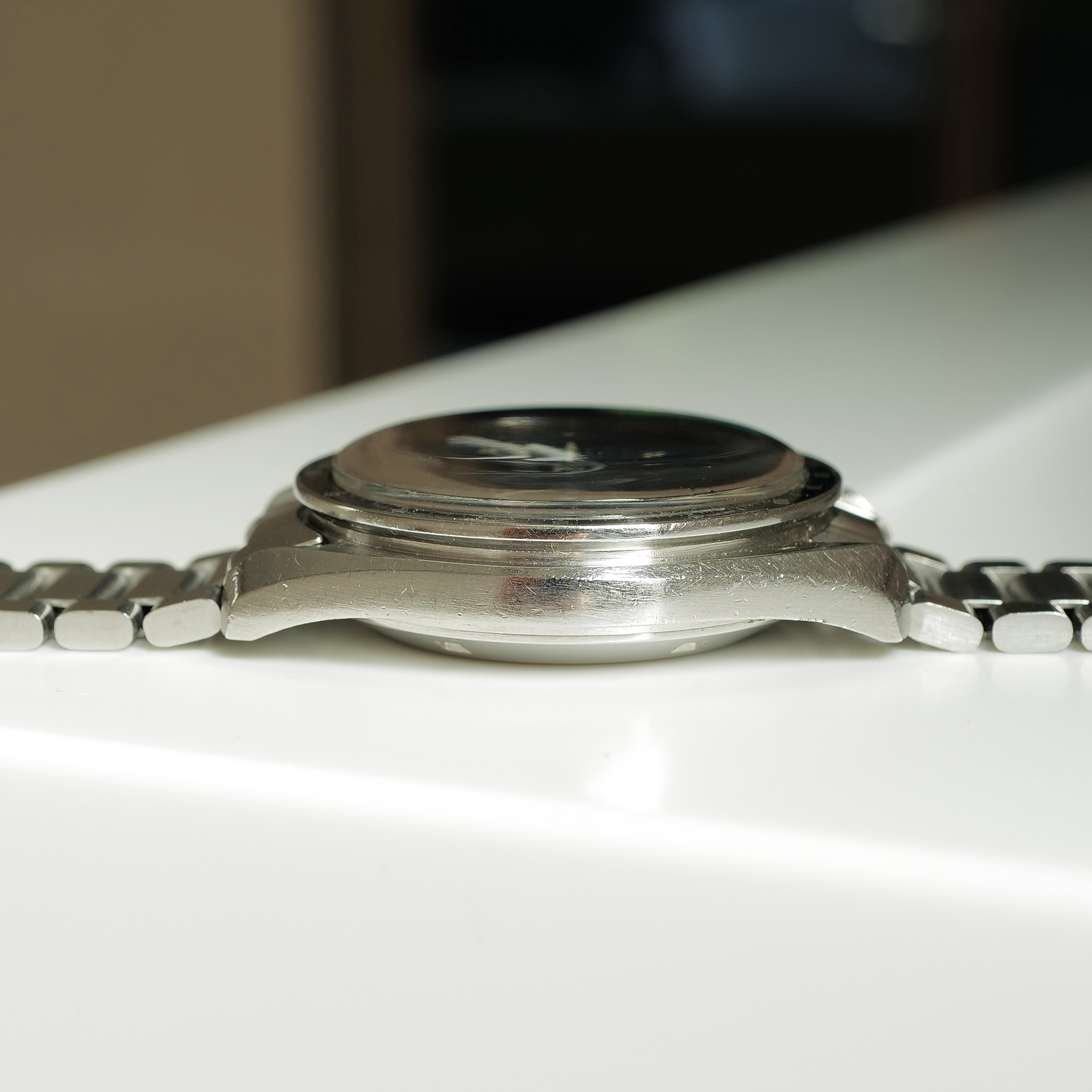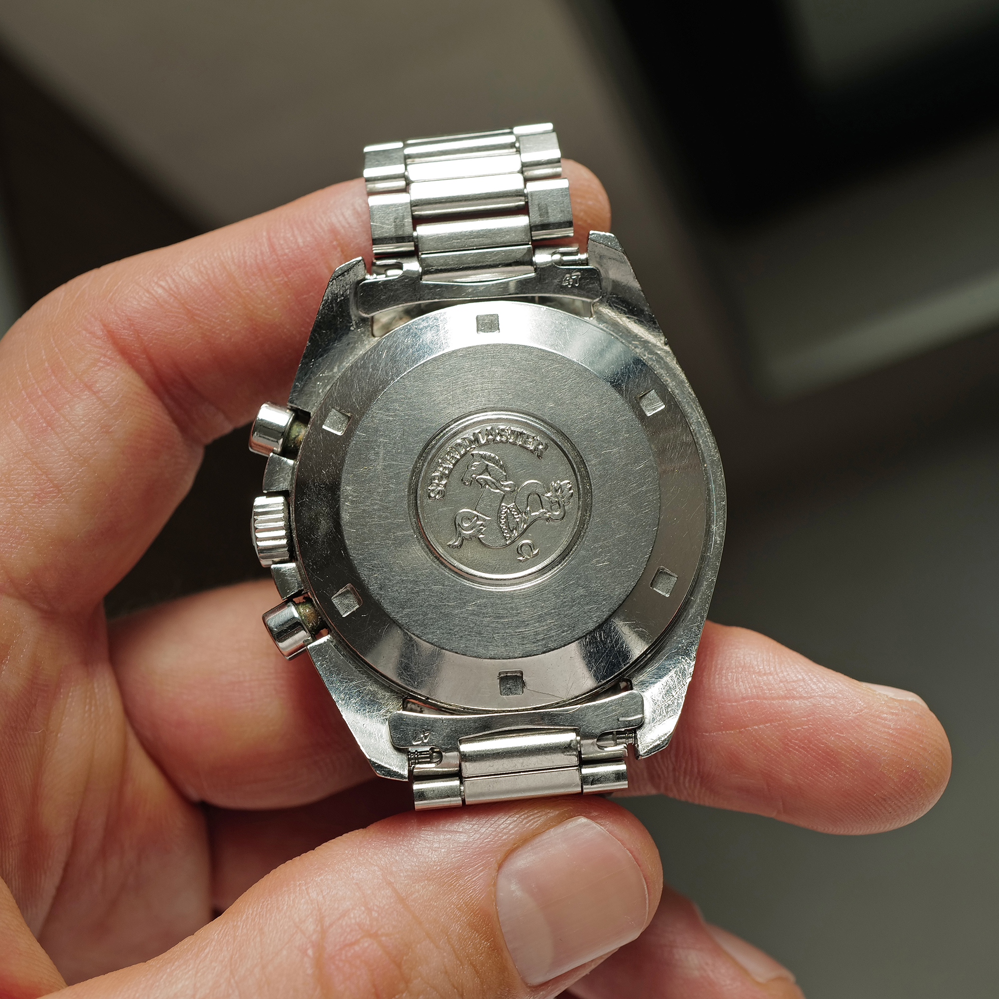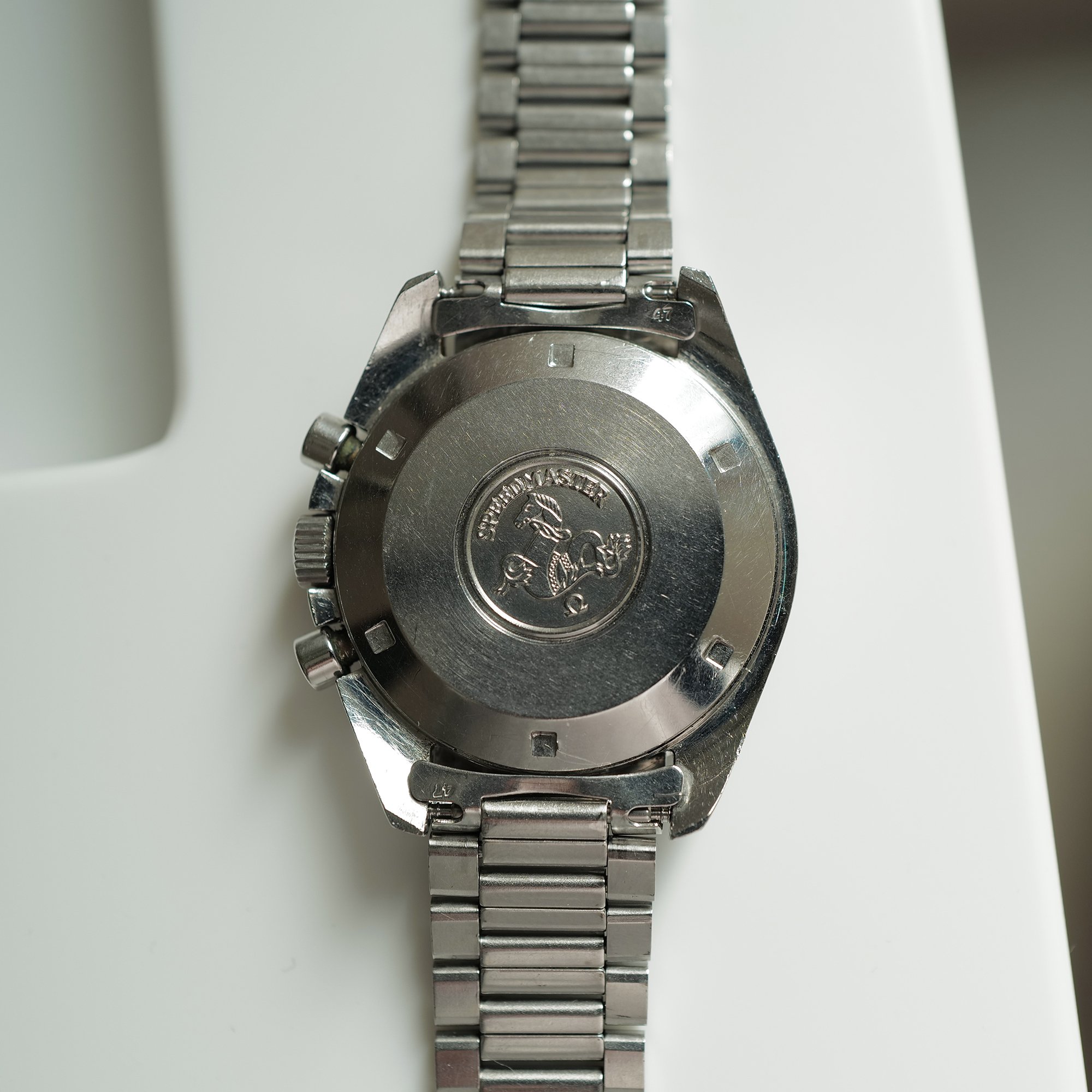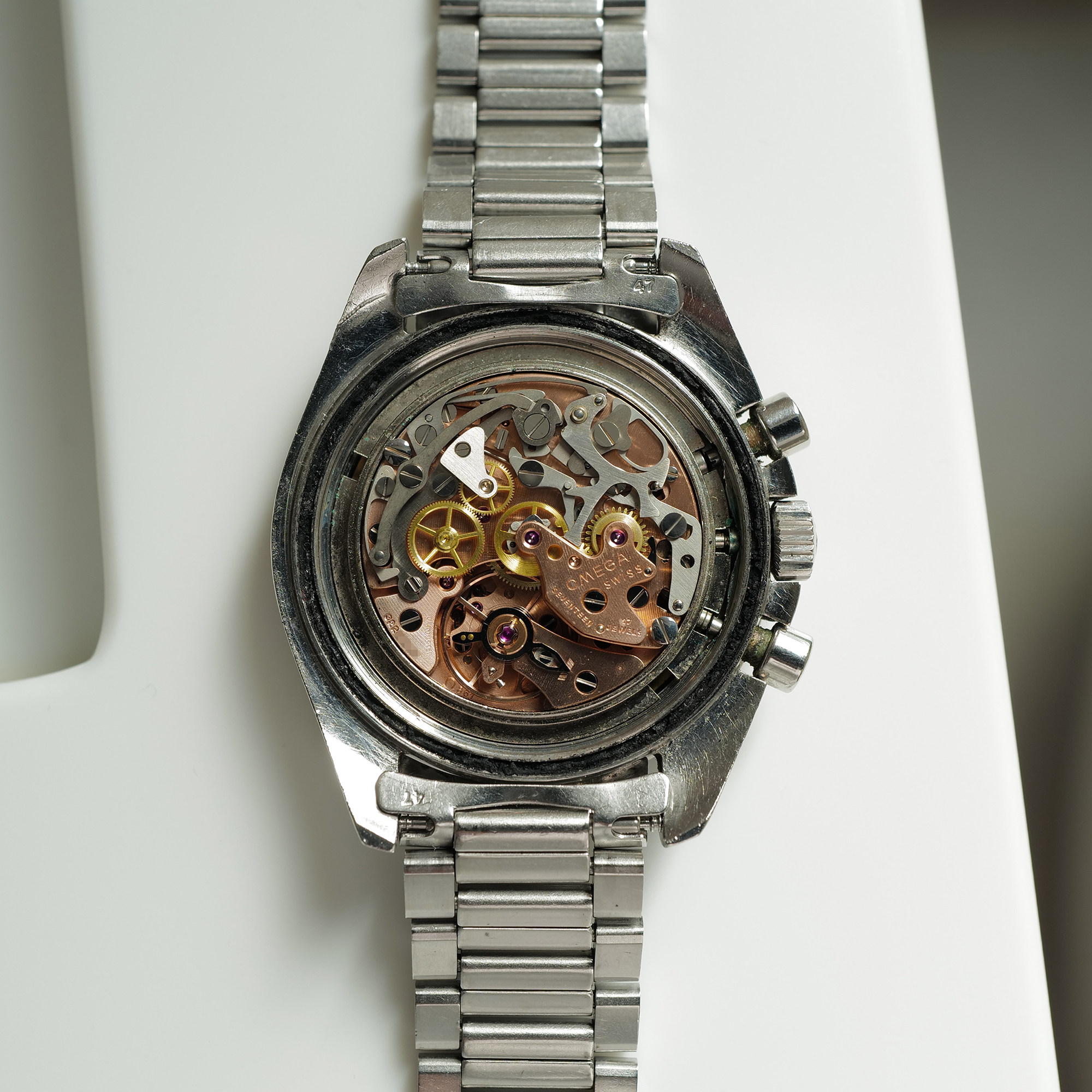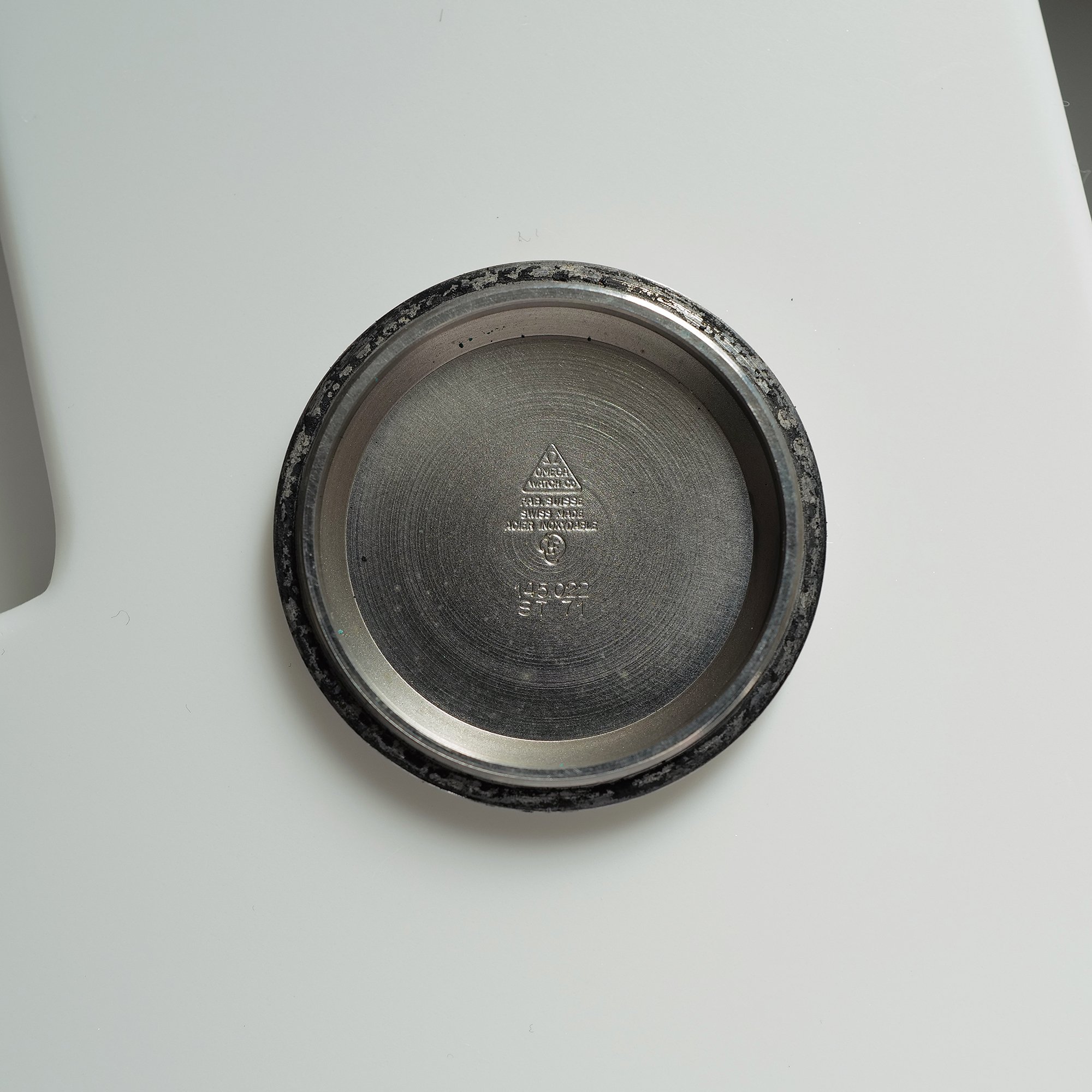 Caseback: The caseback is sharp & unpolished, and does not bear the famous "FIRST WATCH WORN ON THE MOON..." engraving. Hence referred to as the "No NASA" 145.022-71. The caseback has no service markings.