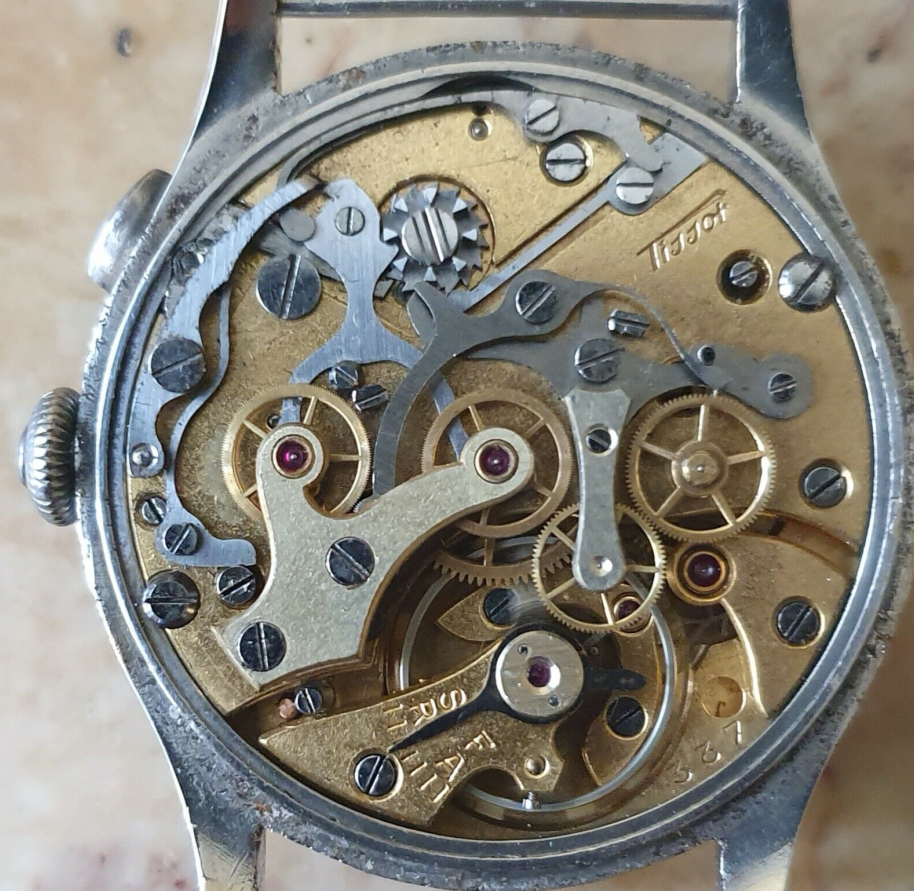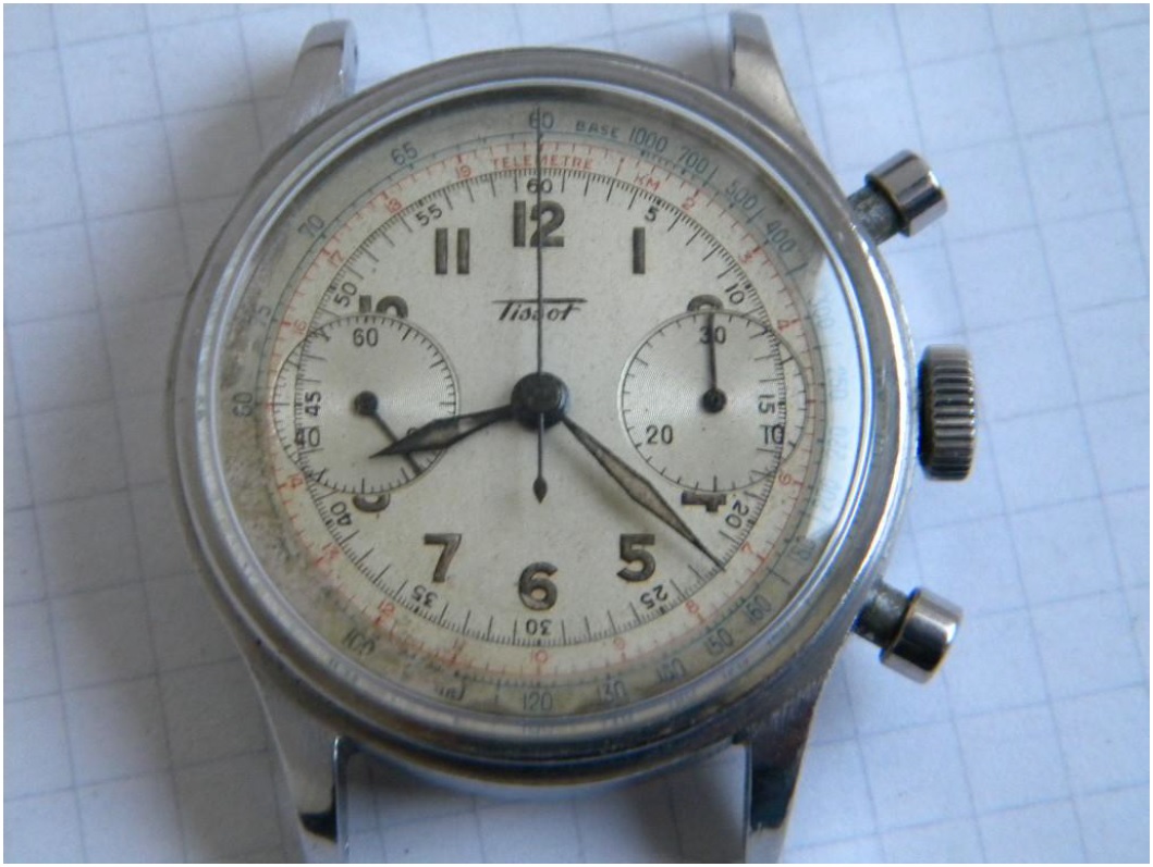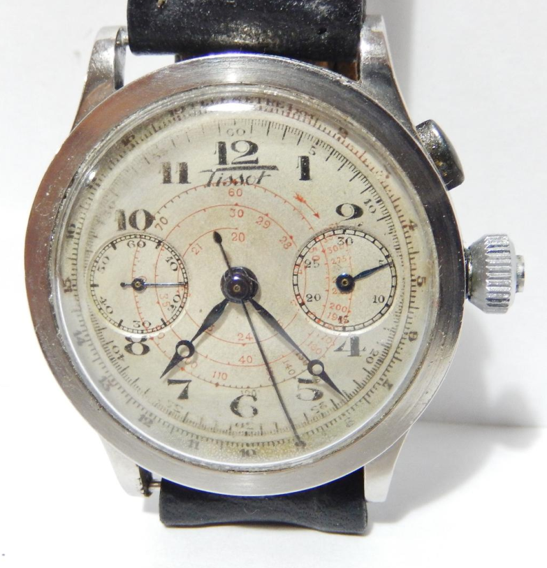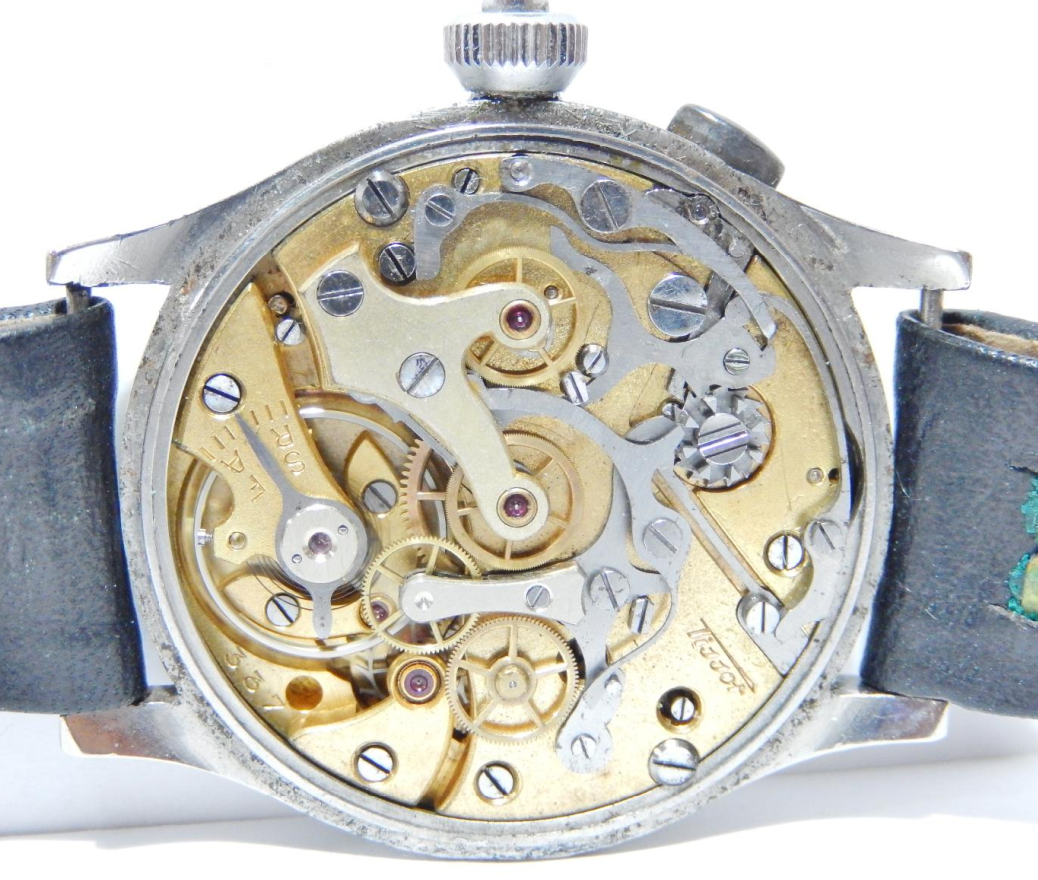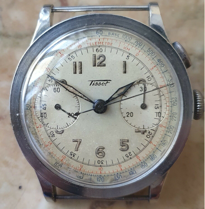 In December 2017, a mid-1930s chronograph featuring an early Lemania 15CHT movement came up as a buy-it-now sale on eBay. The watch featured a slightly-faded dial with Breguet numerals, a red snail tachymeter, telemeter scale, and lovely moon hands set inside a steel coin-edge case (although the winding crown/pusher was likely not original):