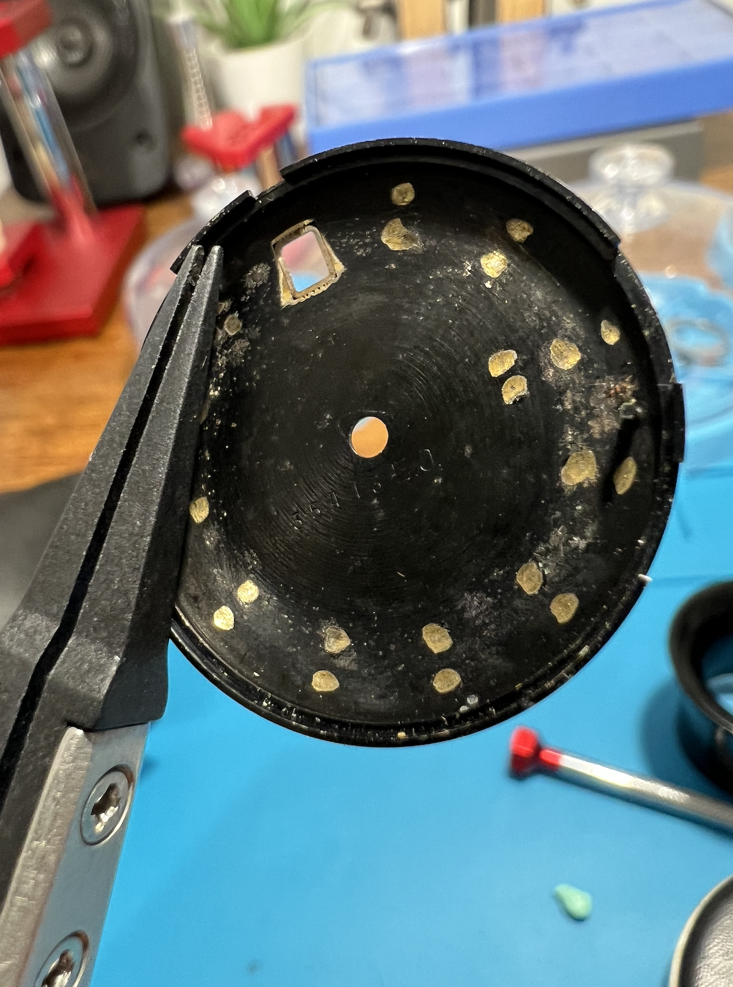 The dial on this thing is also unlike anything I've seen. I have a hands puller just for patinated dials but with this dial that has the spacers integrated to the dial itself, I couldn't think of a safe way of locking the movement while outside the case. Best idea I had was to remove the crystal and use the case as a holder, to be able to pull the hands without touching the dial