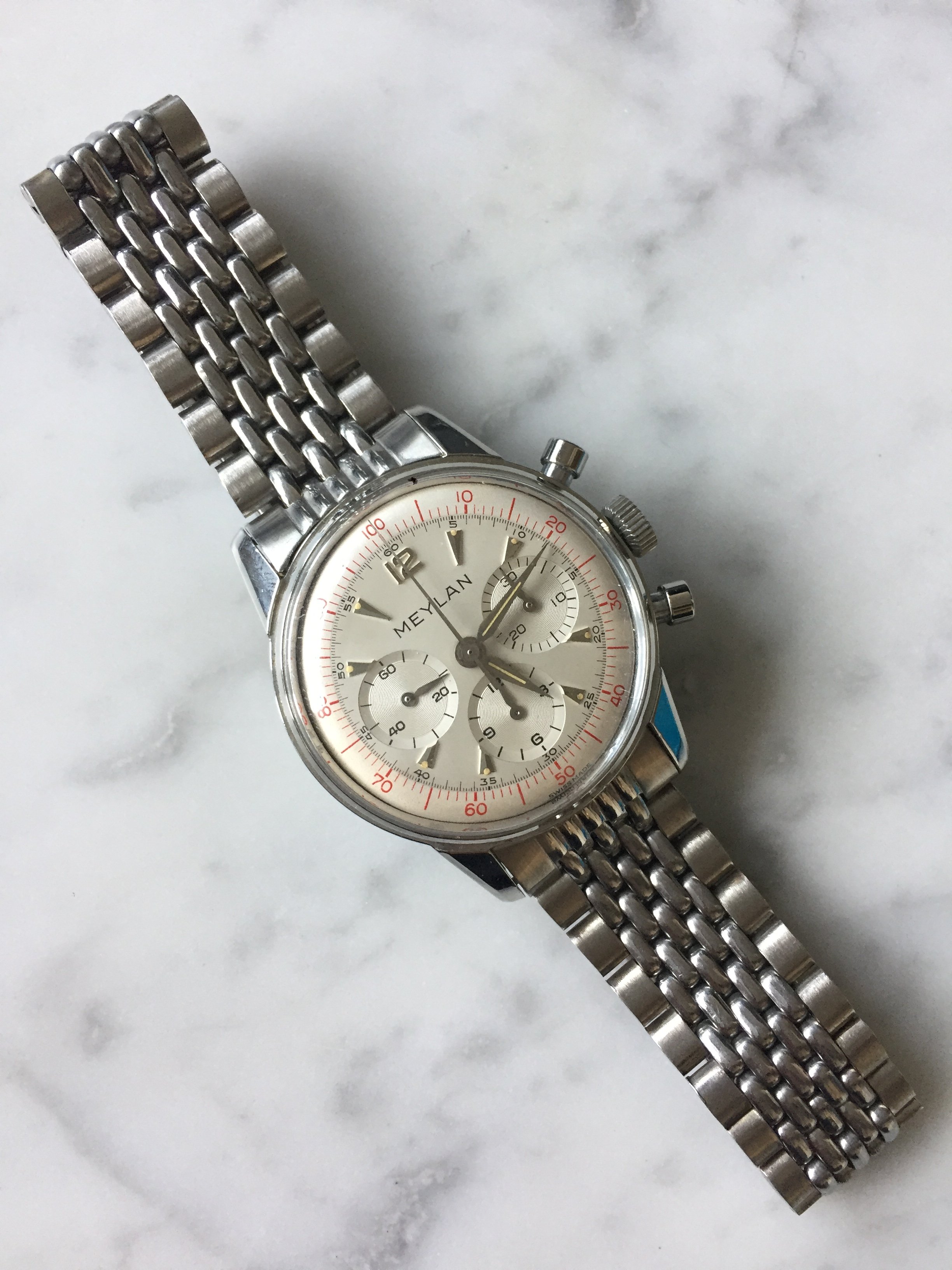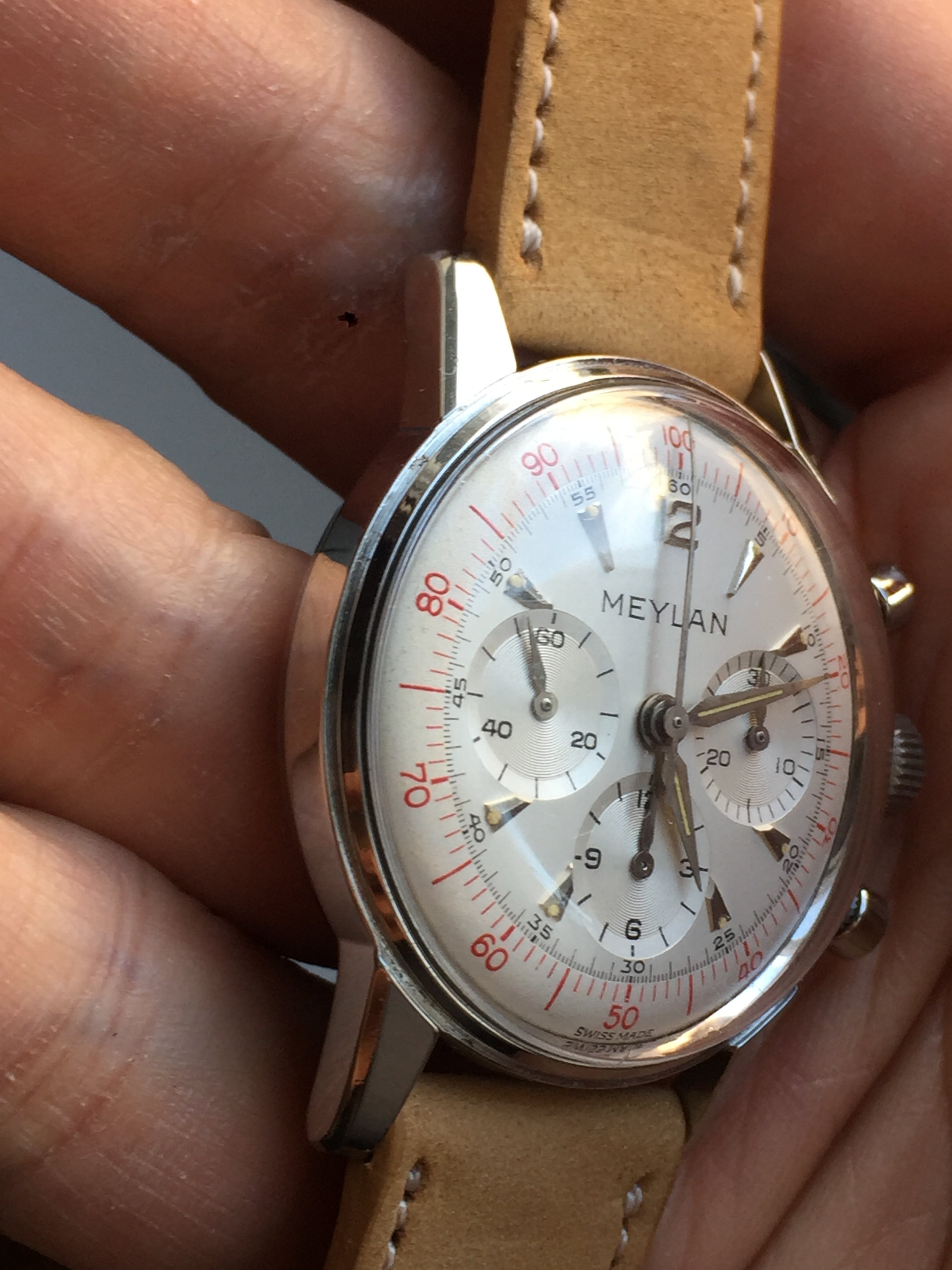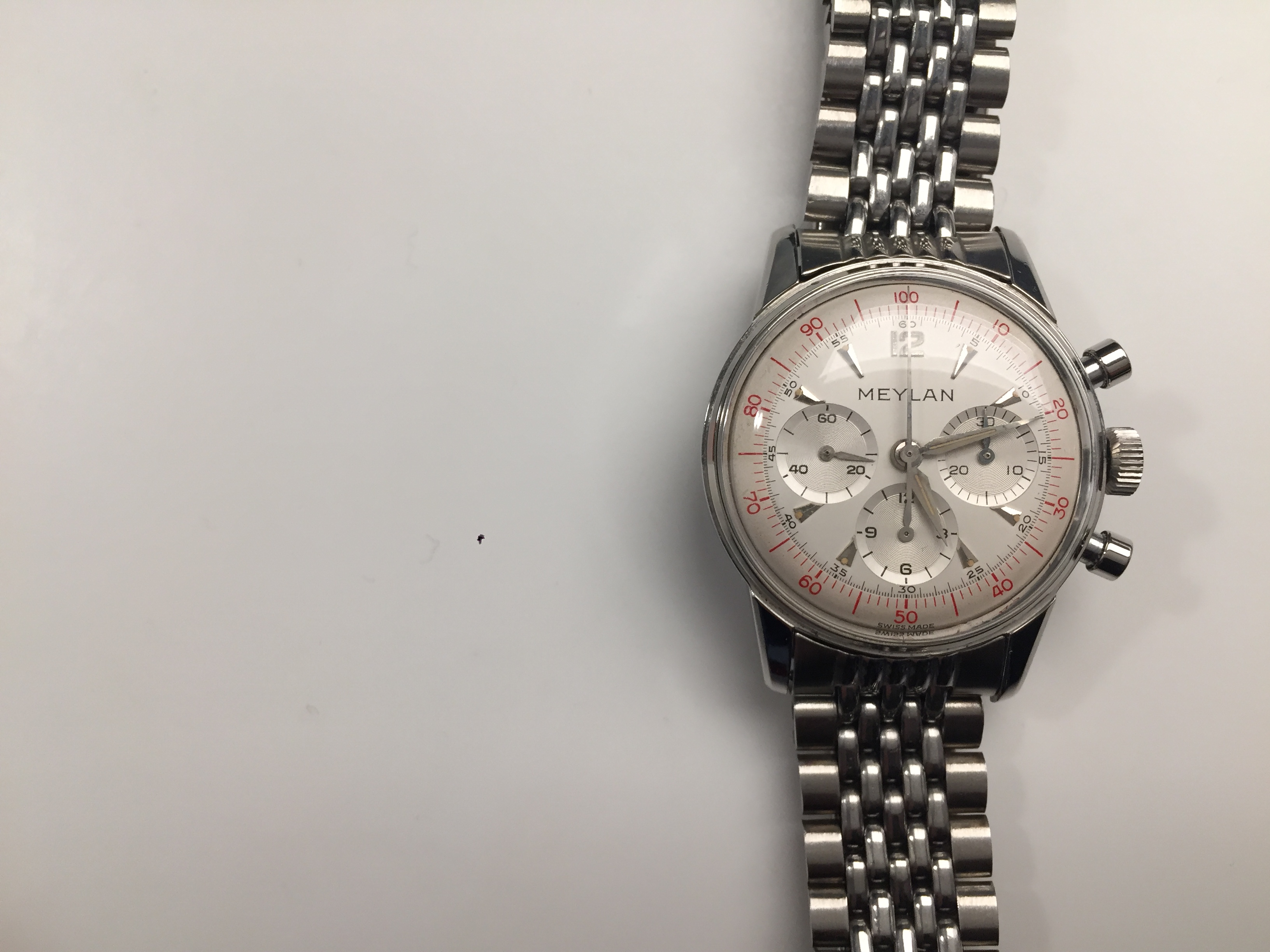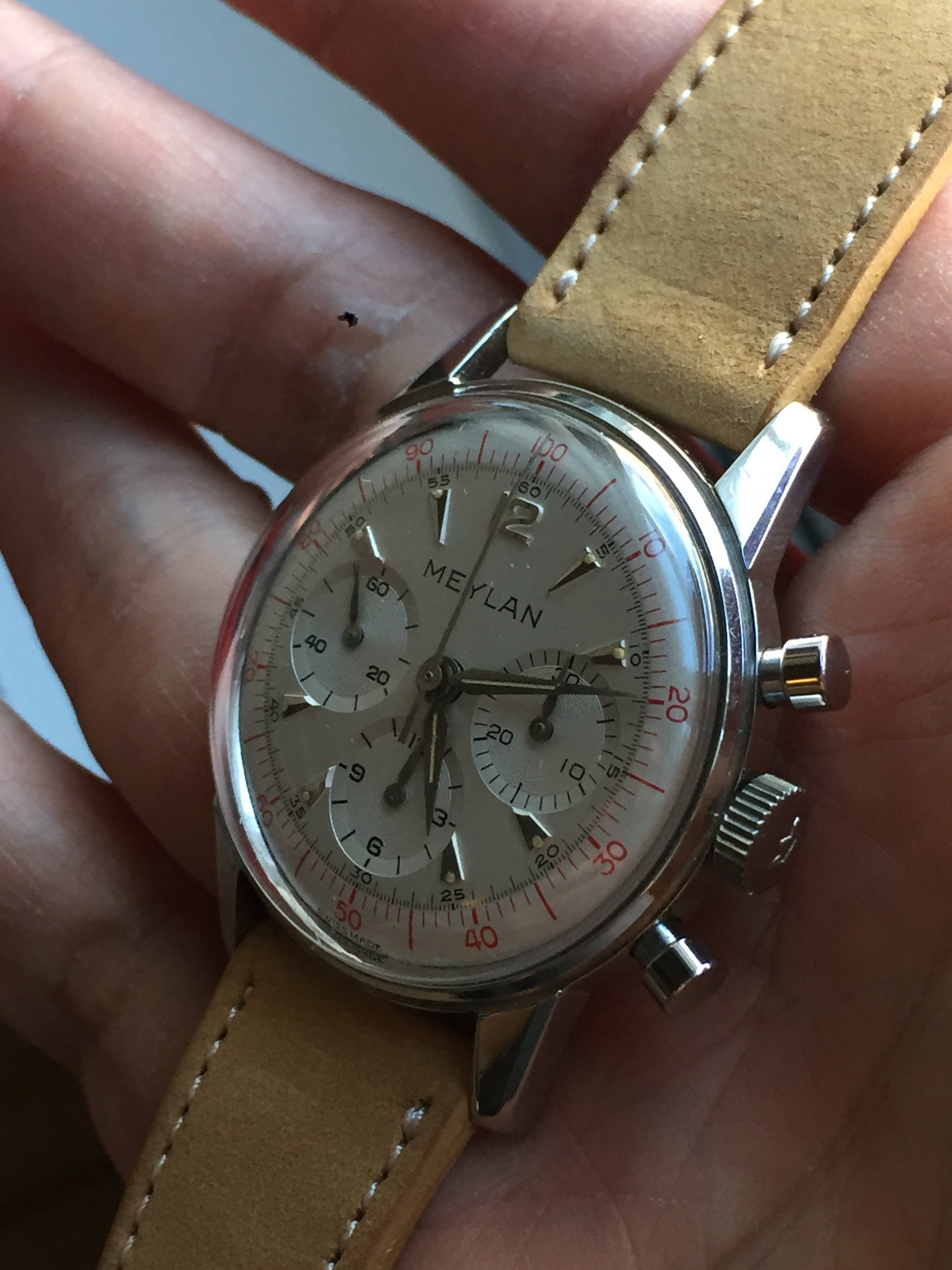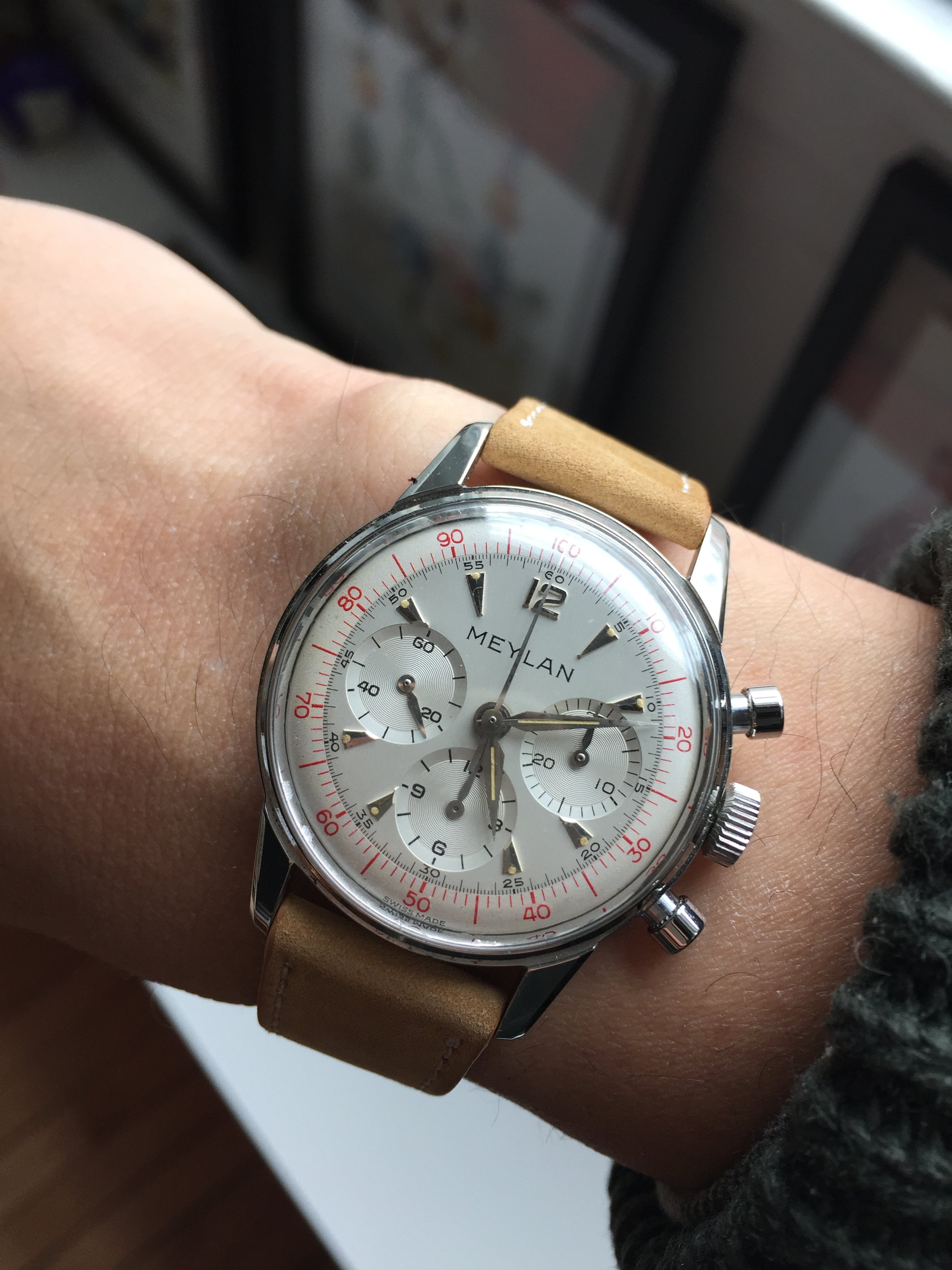 Up for sale is a beautifully preserved Meylan chronograph which I have bought from a fellow forum member awhile back. Nothing much had changed except that I had it serviced back in 2018, the watch is keeping time and all function correctly. It is also worn carefully and sparingly. I have sourced an adjustable BOR bracelet to wear and purchase with it is optional. The link below is the original listing and some updated pictures at the bottom.
