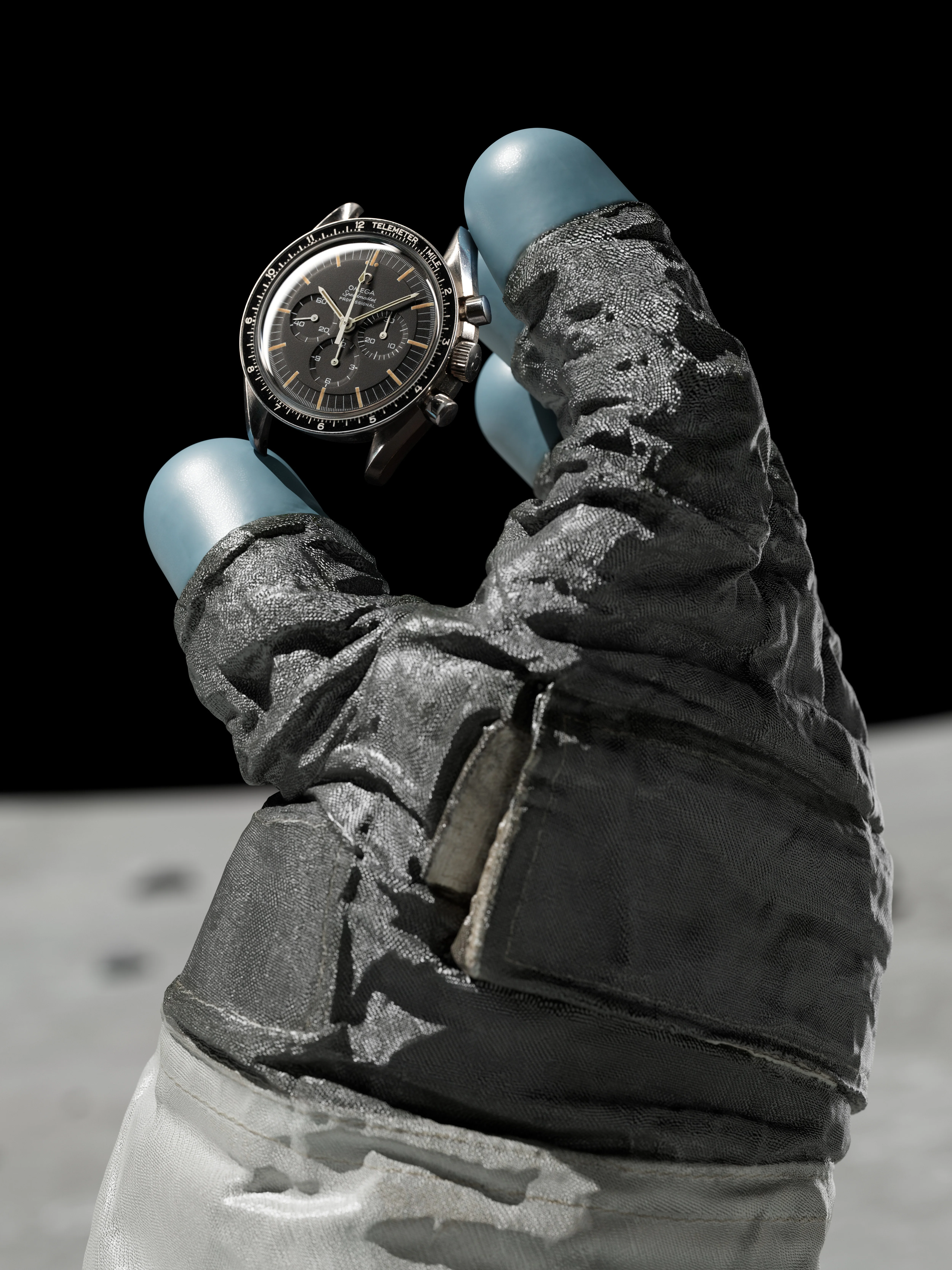 I started looking for some available 3D glove models to use for a composite shot and happened to find an amazing scan of Neil Armstrong's glove on the Smithsonian archive. I rigged it with some bones so I could manipulate the fingers and pose the glove. Previsualized the angle of the speedmaster with a 3D watch in situation and then matched my watch in-camera.