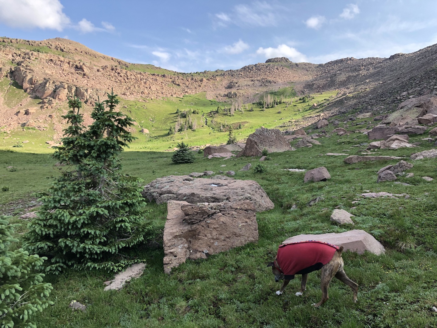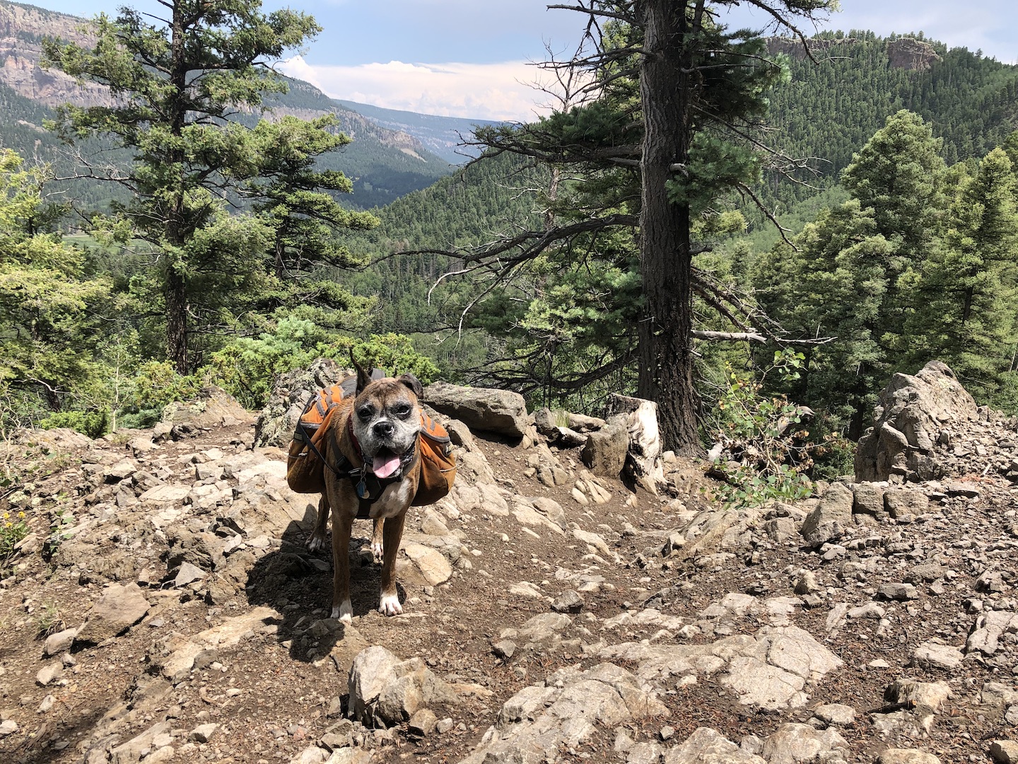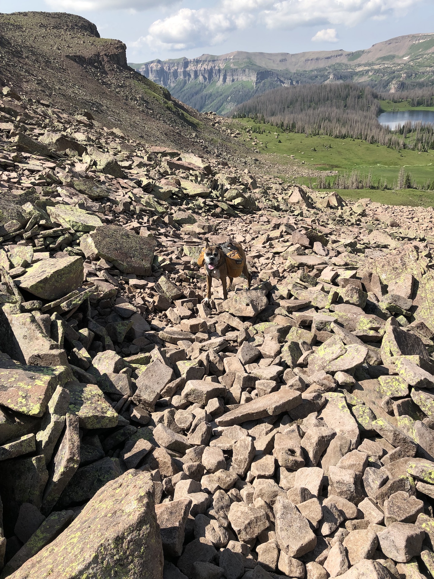 Crossing the talus on the way out of the Chama Lake valley. This type of terrain is obviously hard on bare paws, but she's always a trooper.