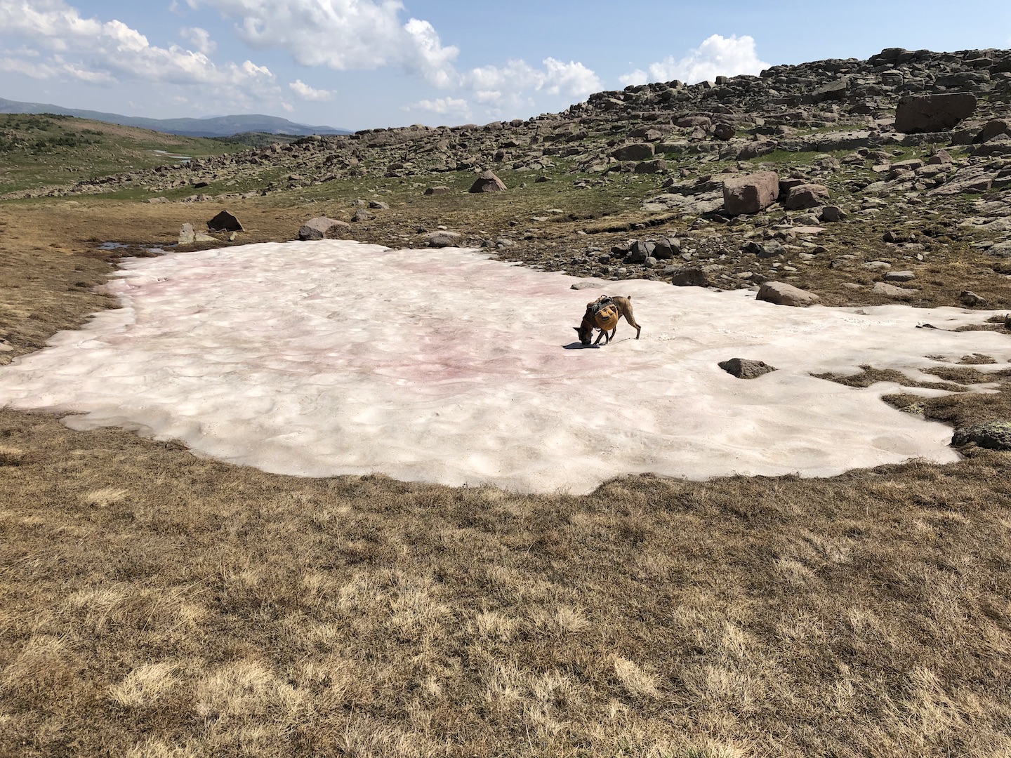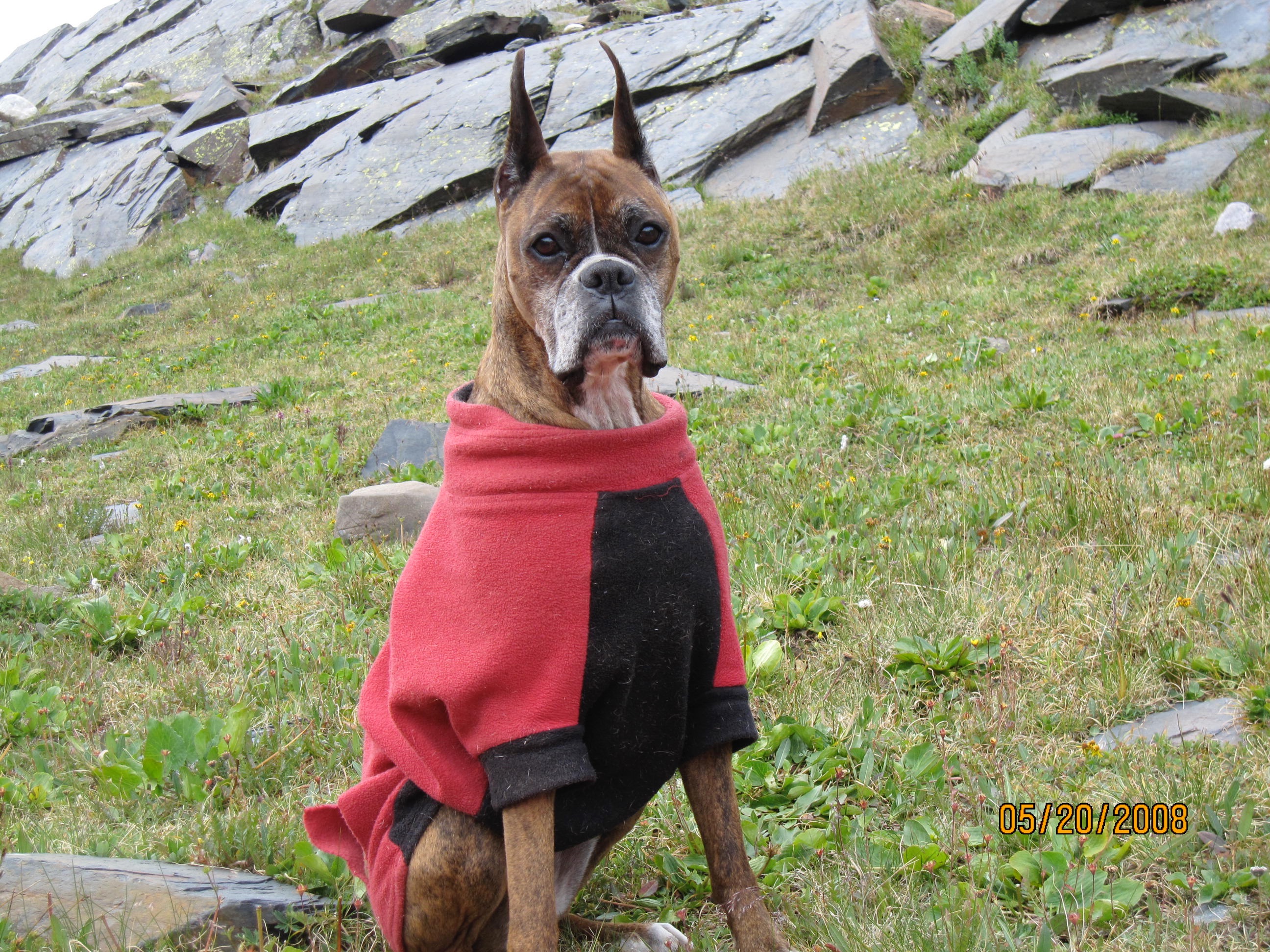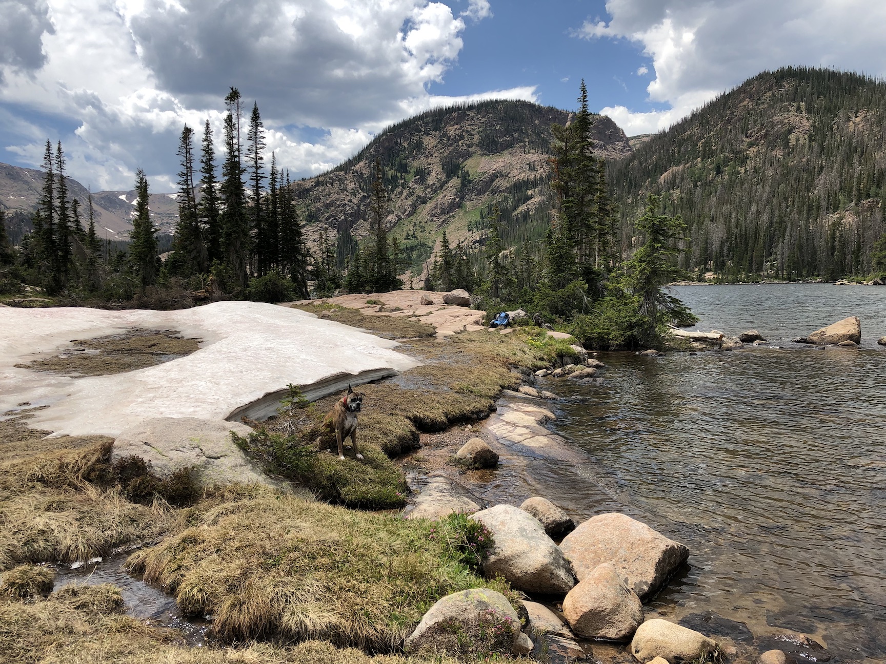 Crossing the talus on the way out of the Chama Lake valley. This type of terrain is obviously hard on bare paws, but she's always a trooper.