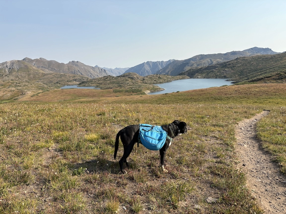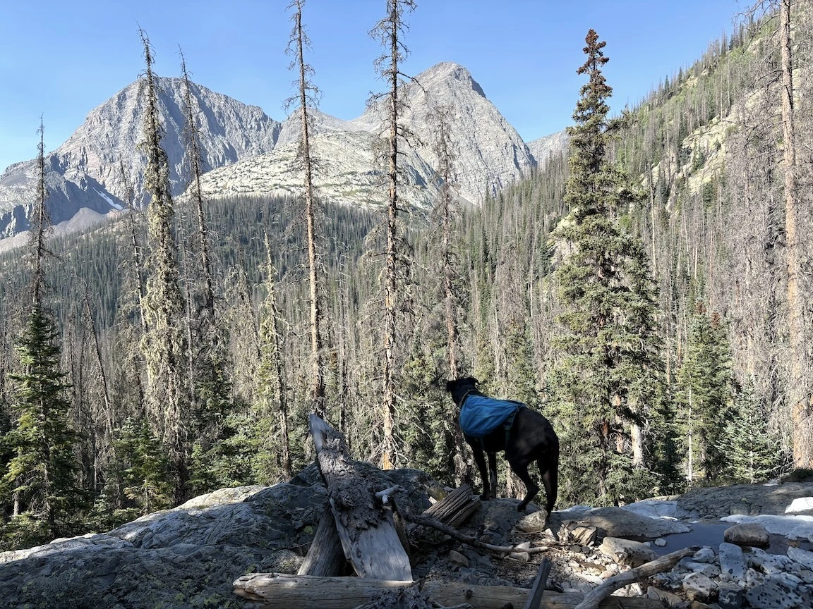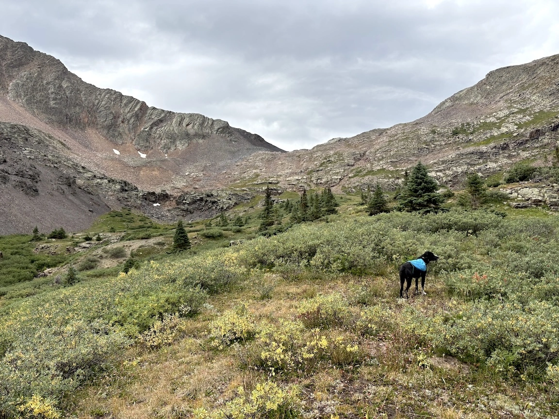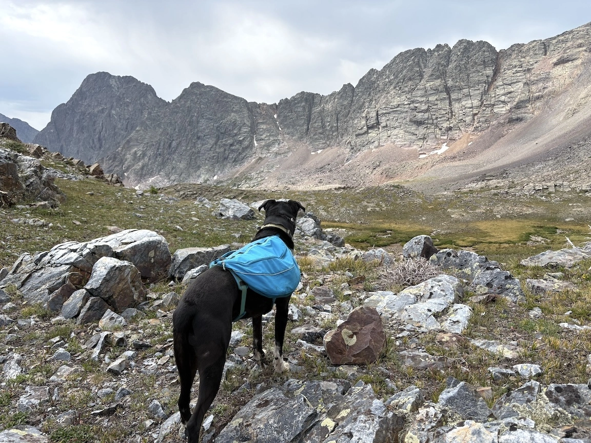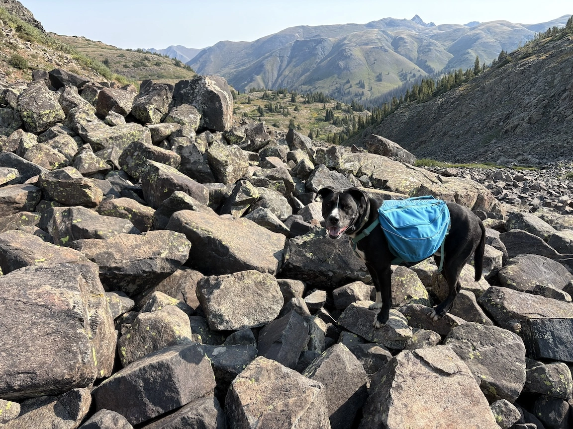 After a short climb from the trailhead, we came out above timberline into a pretty valley and climbed up to a ridge where you can see some of the namesake peaks and a pass that is part of the popular loop hike in this wilderness. You can see one of the Bells peeking over the ridgeline in the second photo with Opus.