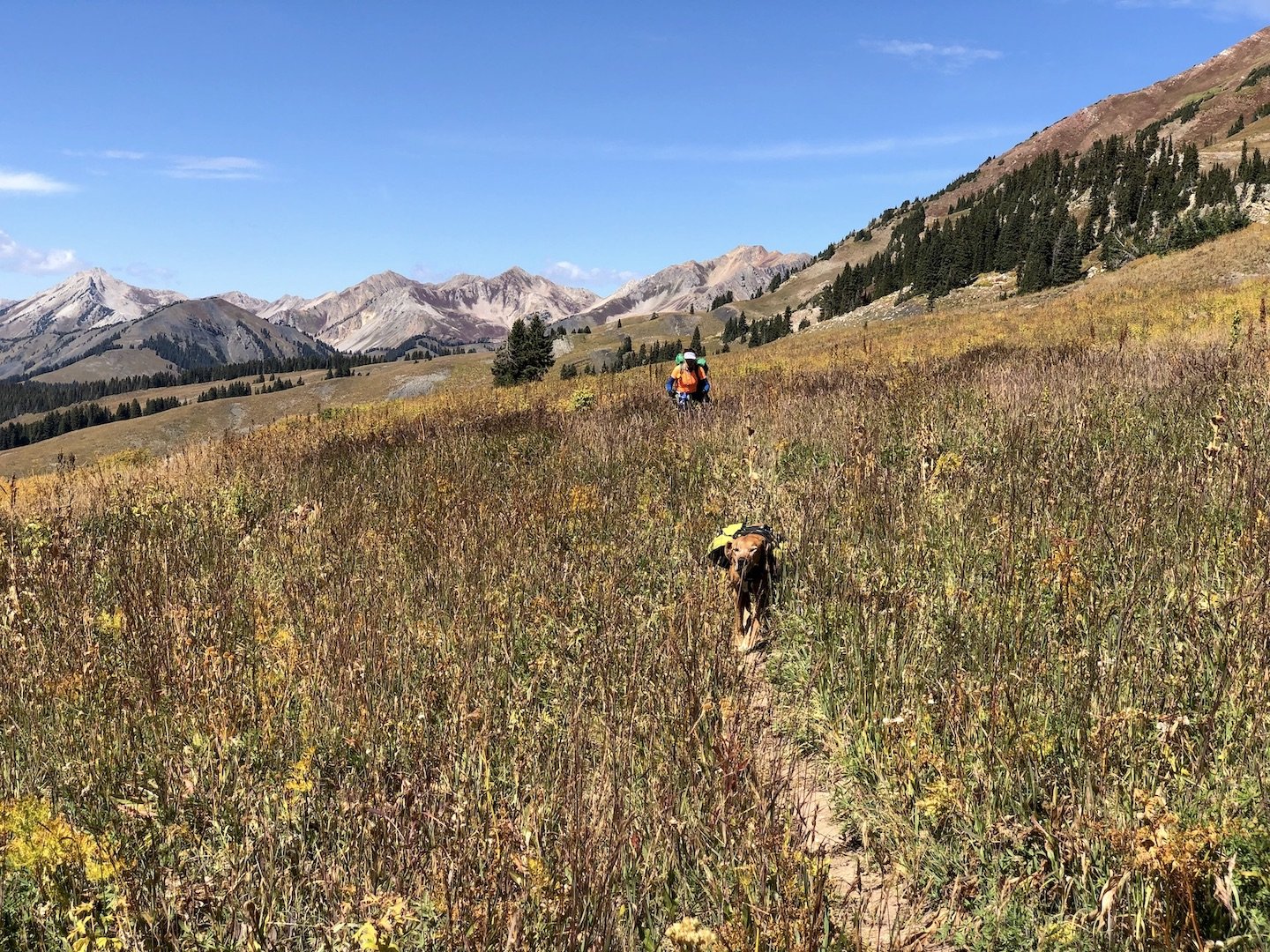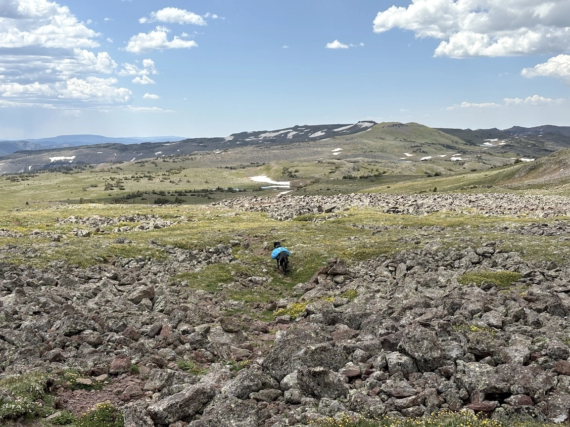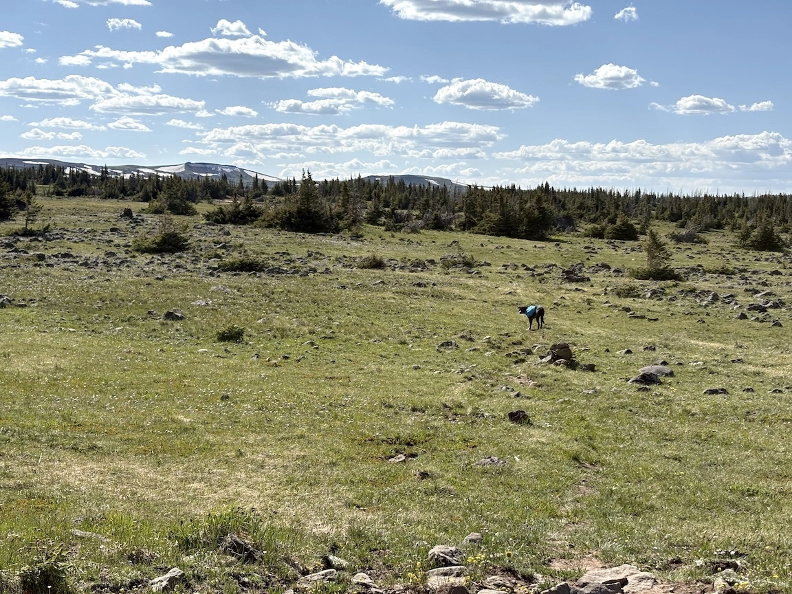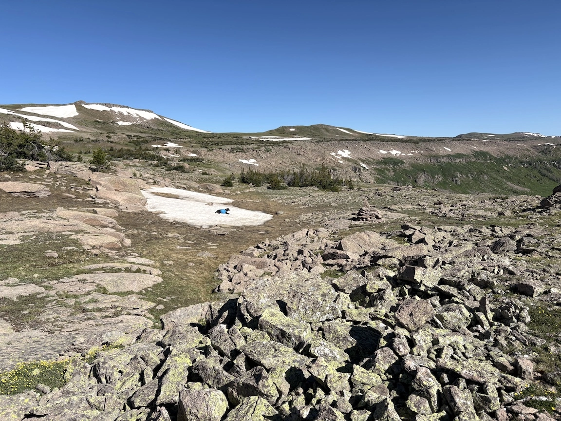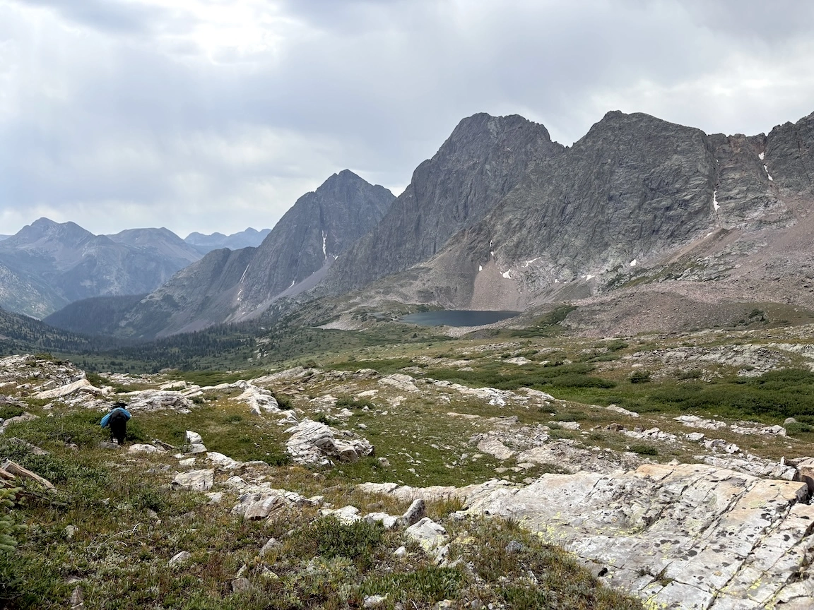 After a short climb from the trailhead, we came out above timberline into a pretty valley and climbed up to a ridge where you can see some of the namesake peaks and a pass that is part of the popular loop hike in this wilderness. You can see one of the Bells peeking over the ridgeline in the second photo with Opus.