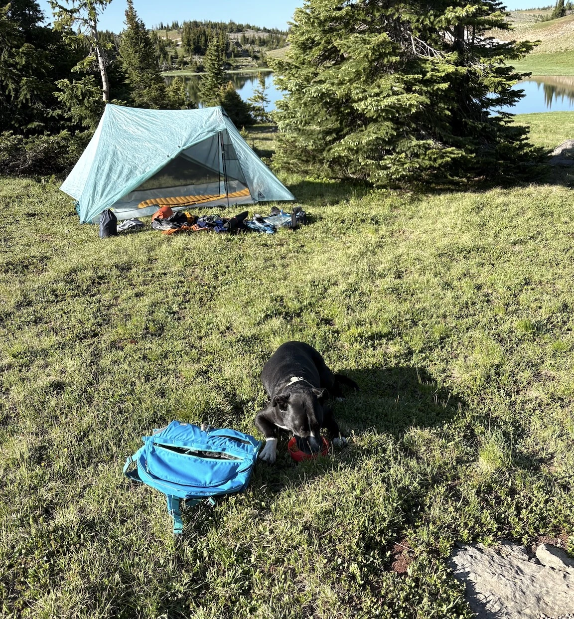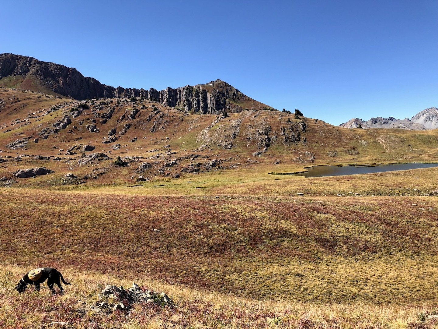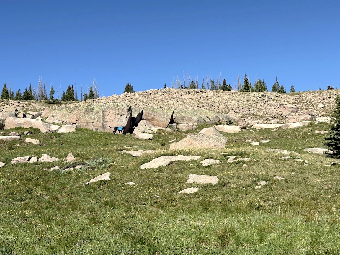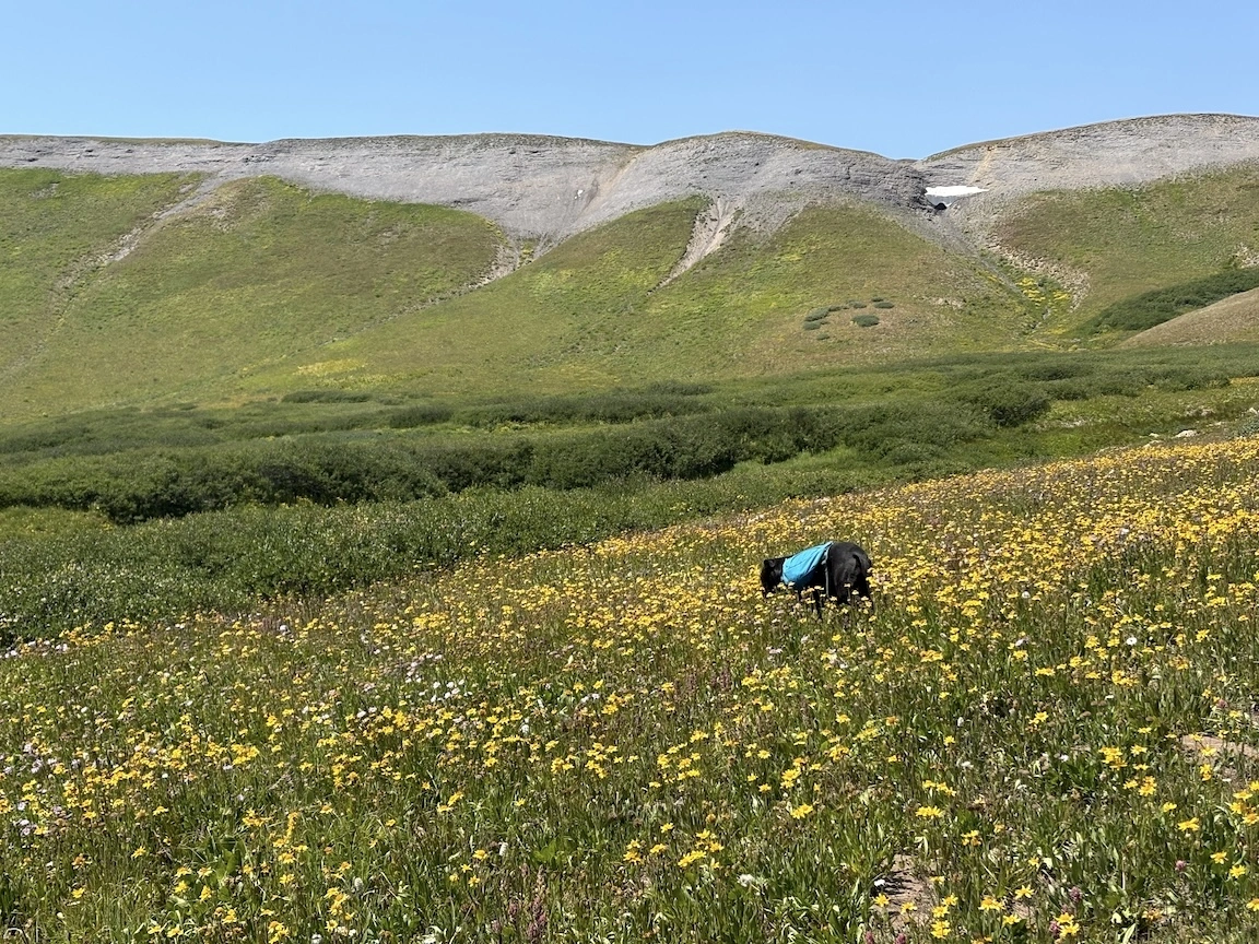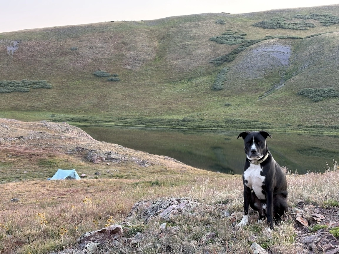 After a short climb from the trailhead, we came out above timberline into a pretty valley and climbed up to a ridge where you can see some of the namesake peaks and a pass that is part of the popular loop hike in this wilderness. You can see one of the Bells peeking over the ridgeline in the second photo with Opus.