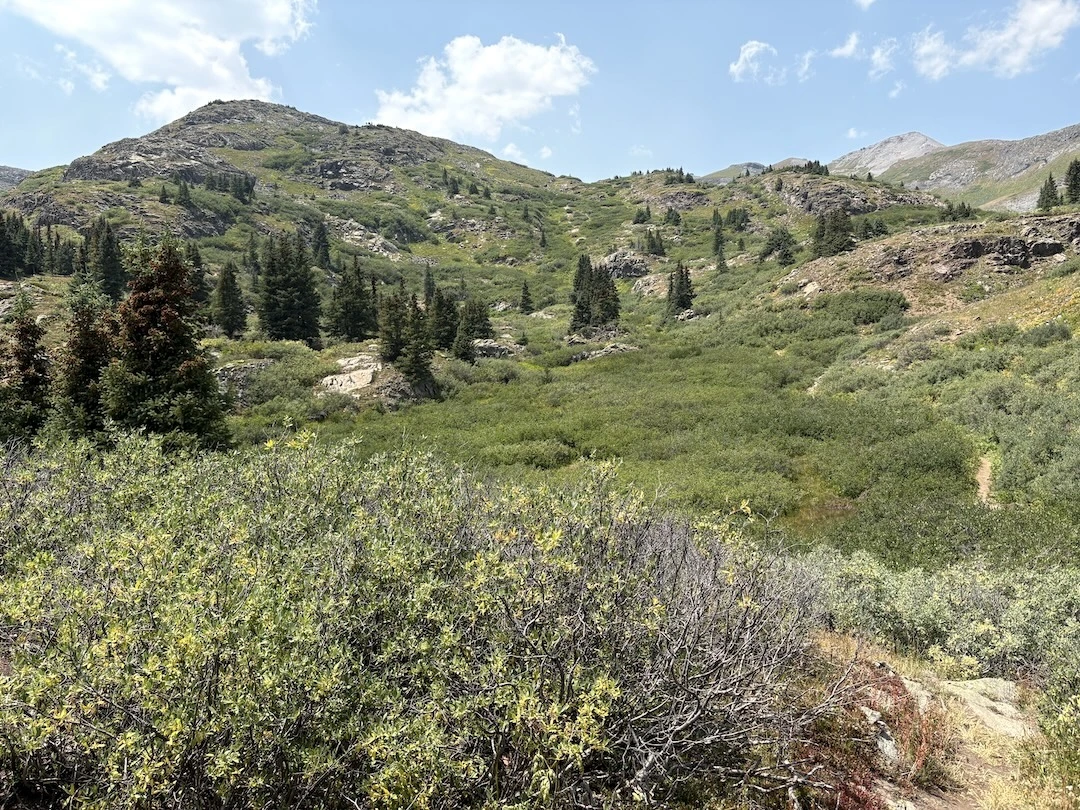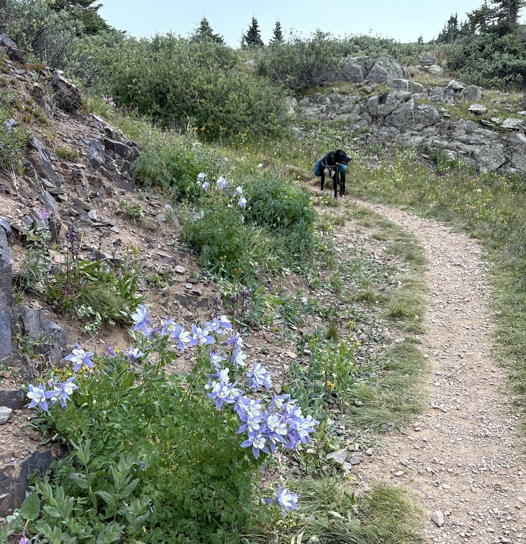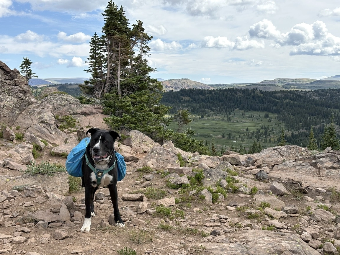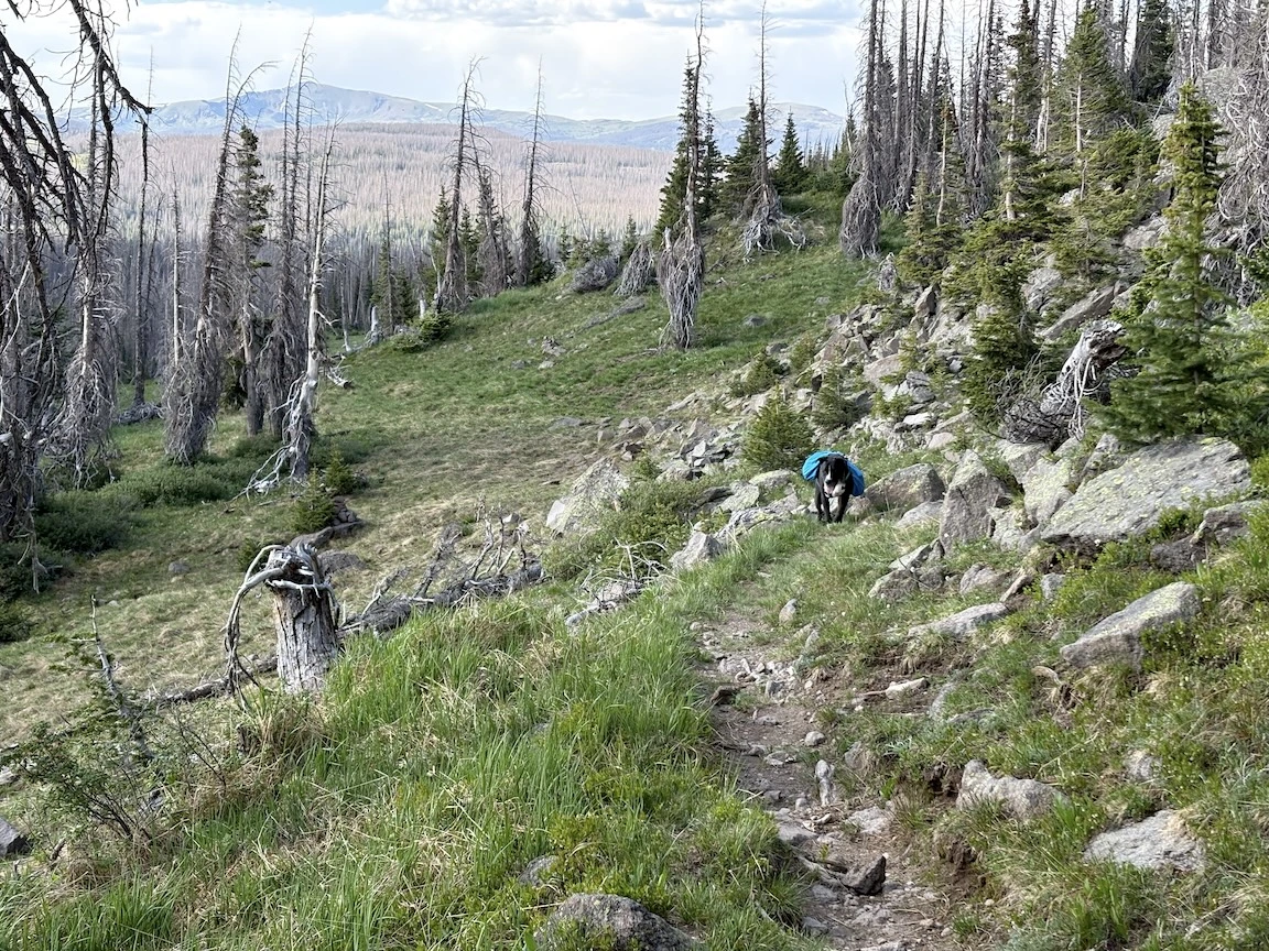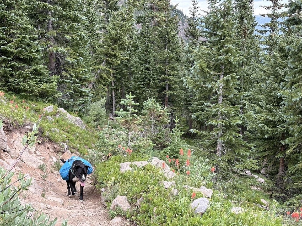 After a short climb from the trailhead, we came out above timberline into a pretty valley and climbed up to a ridge where you can see some of the namesake peaks and a pass that is part of the popular loop hike in this wilderness. You can see one of the Bells peeking over the ridgeline in the second photo with Opus.