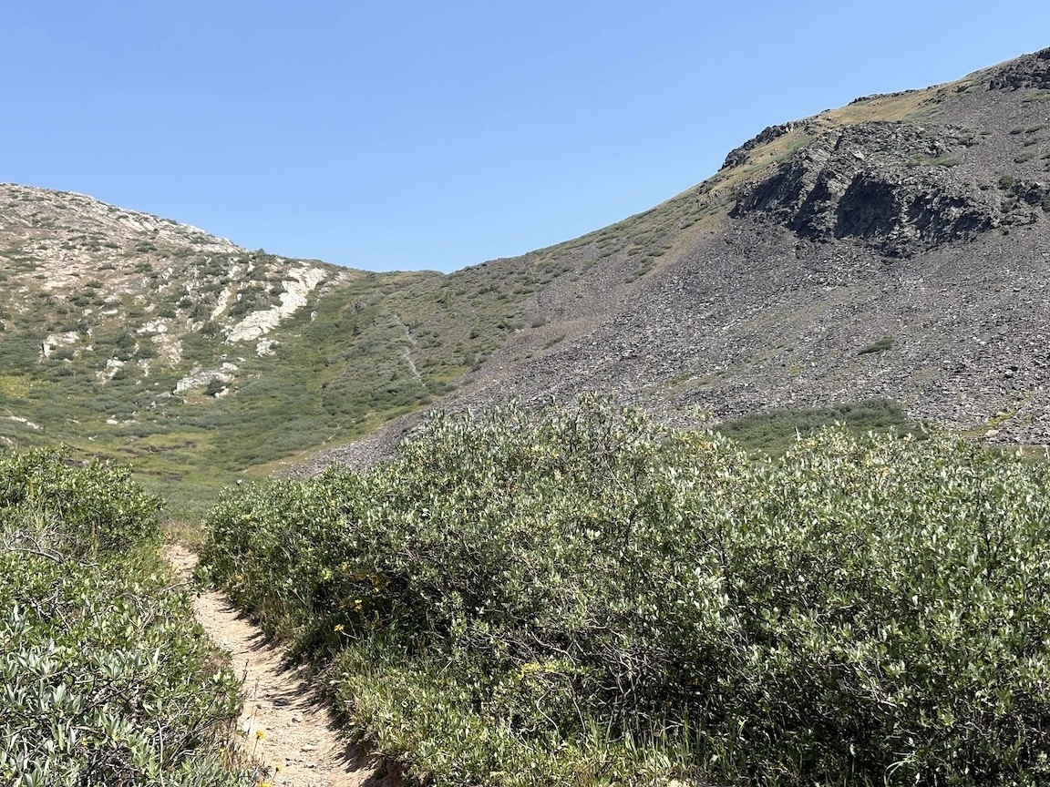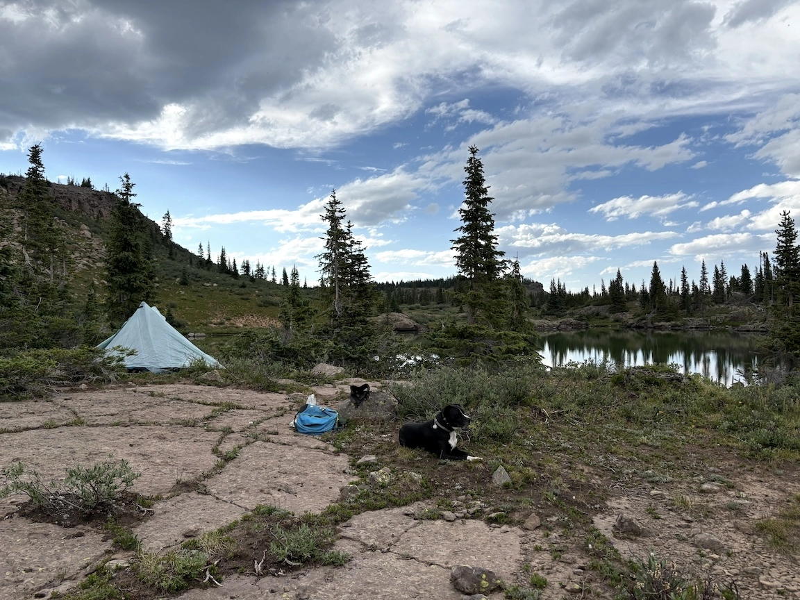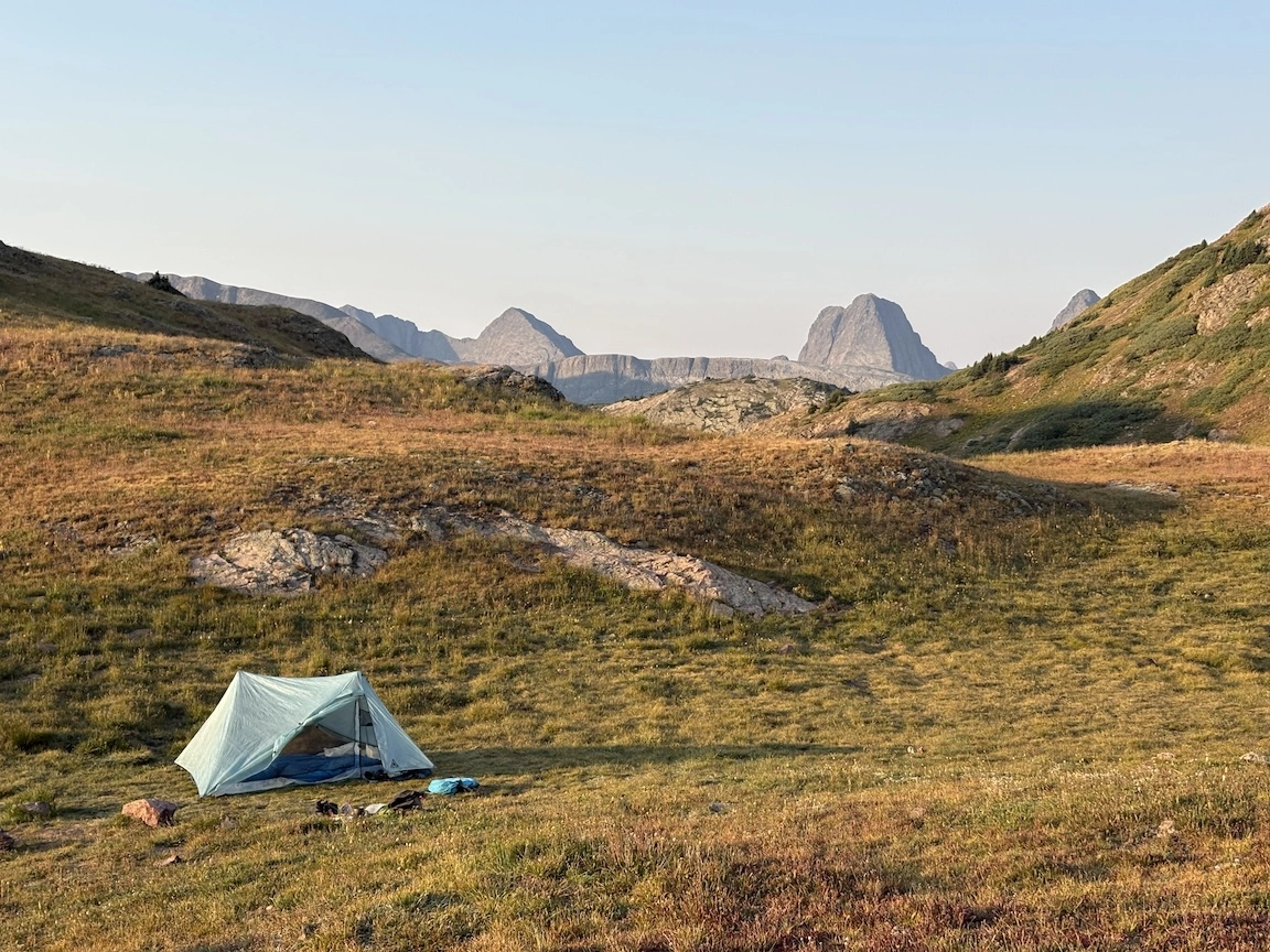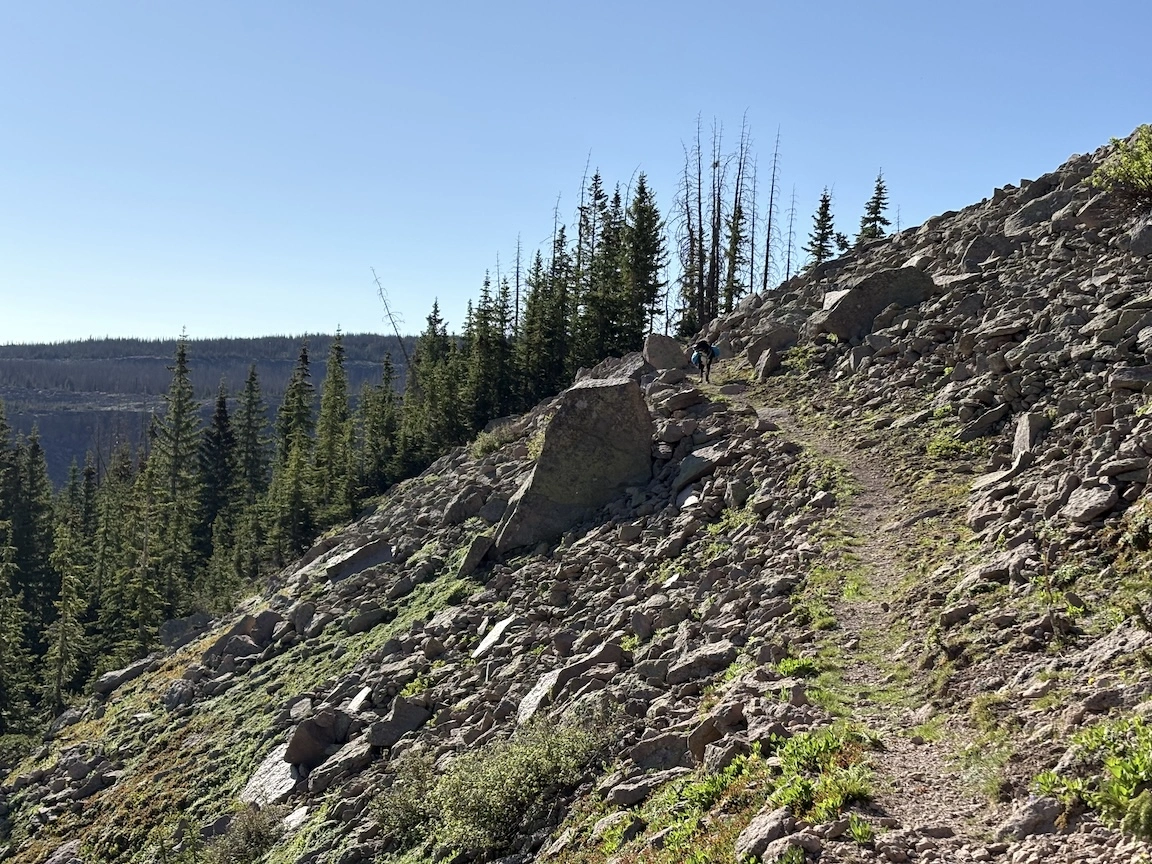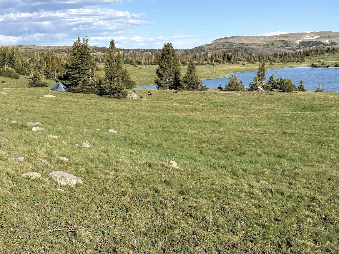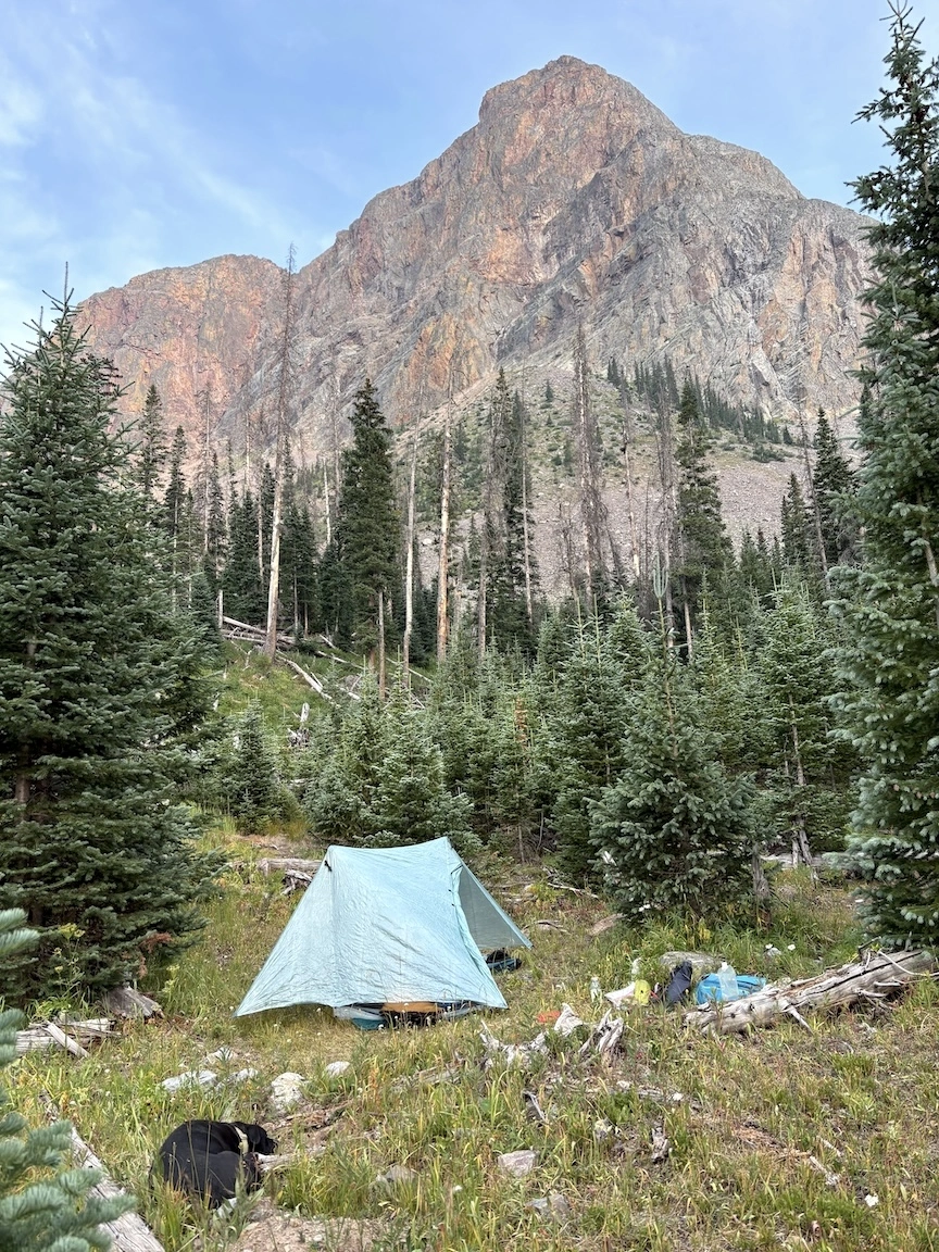 After a short climb from the trailhead, we came out above timberline into a pretty valley and climbed up to a ridge where you can see some of the namesake peaks and a pass that is part of the popular loop hike in this wilderness. You can see one of the Bells peeking over the ridgeline in the second photo with Opus.