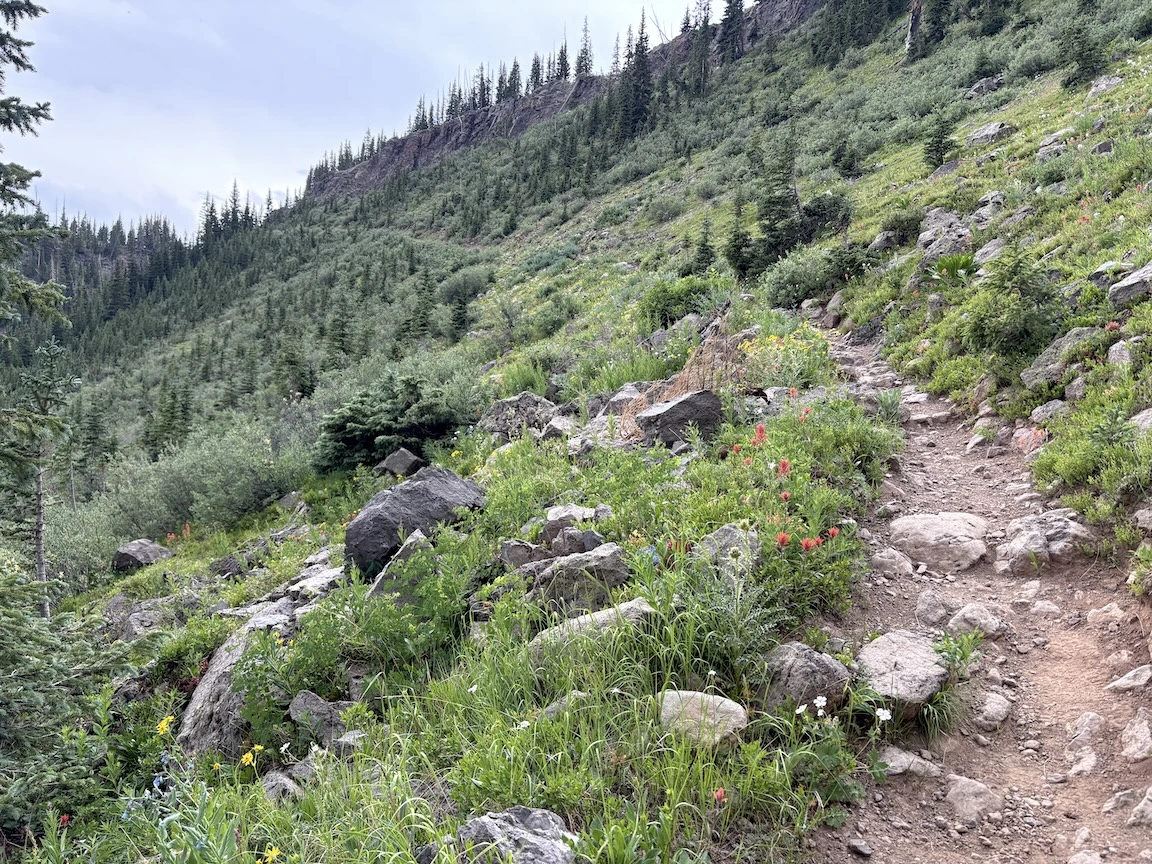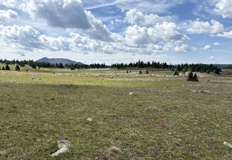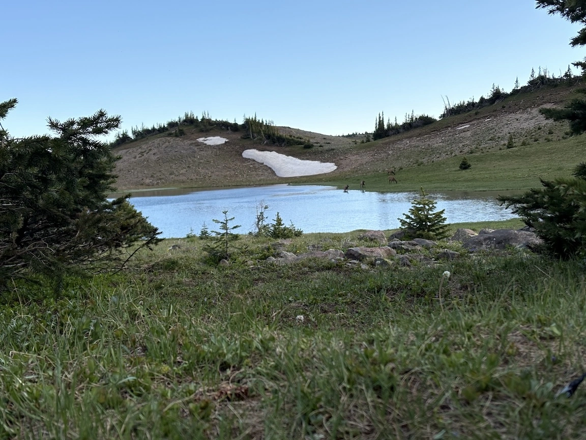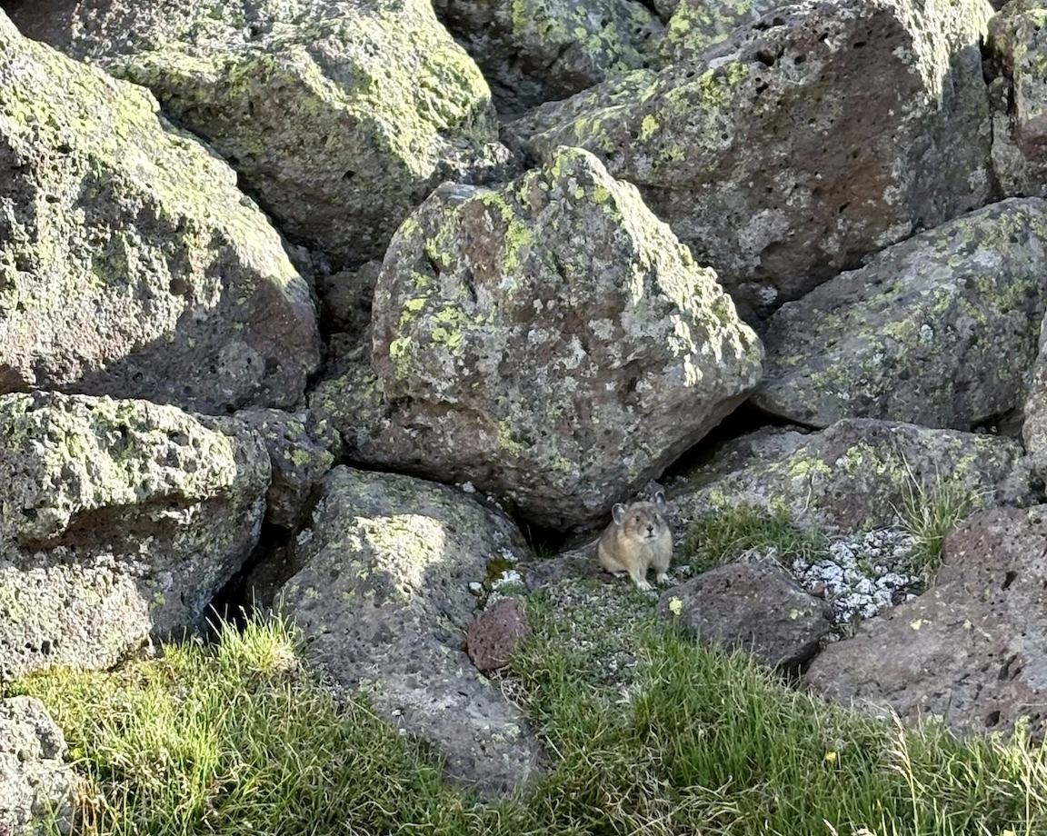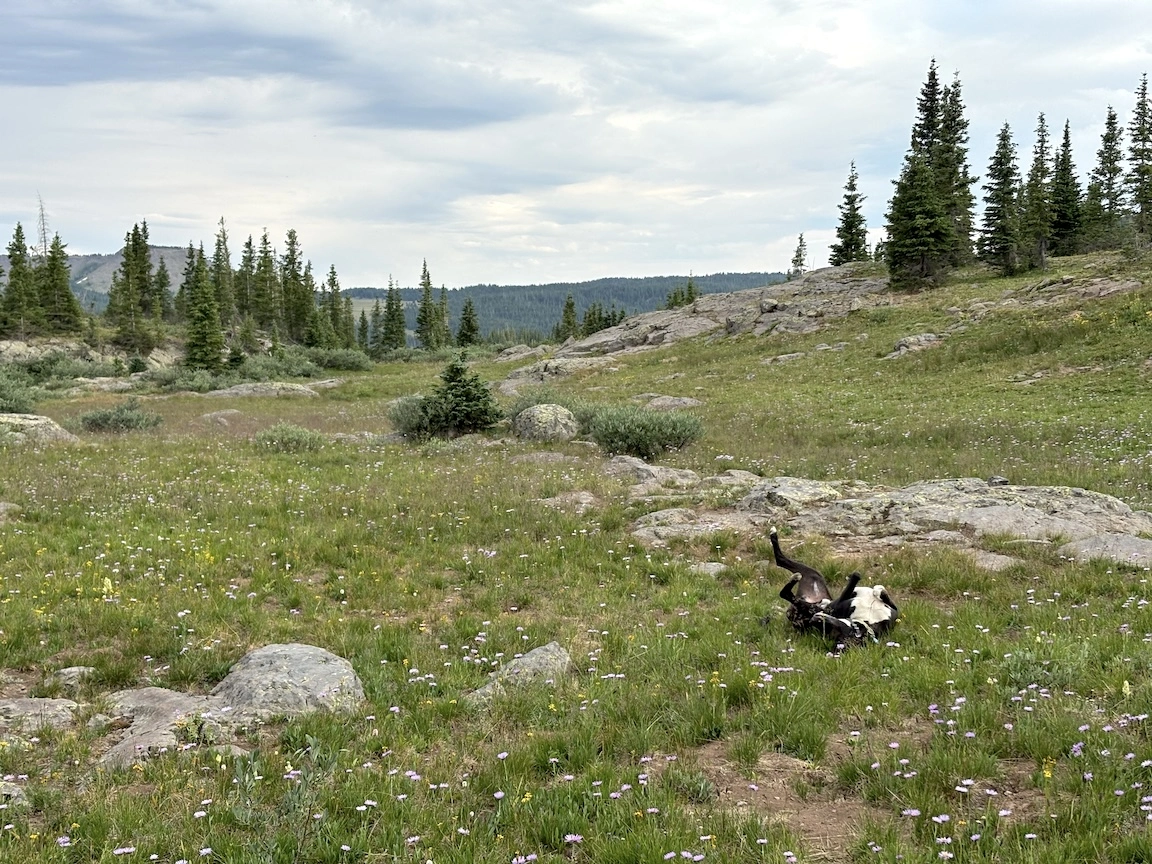 After a short climb from the trailhead, we came out above timberline into a pretty valley and climbed up to a ridge where you can see some of the namesake peaks and a pass that is part of the popular loop hike in this wilderness. You can see one of the Bells peeking over the ridgeline in the second photo with Opus.